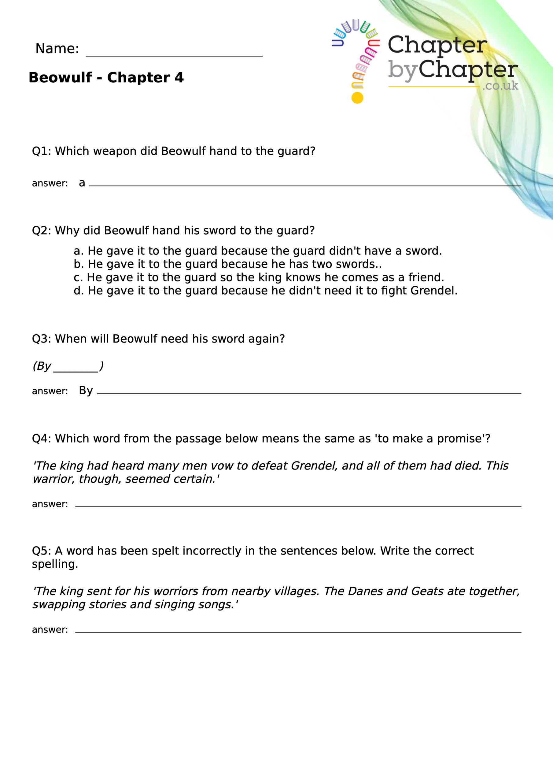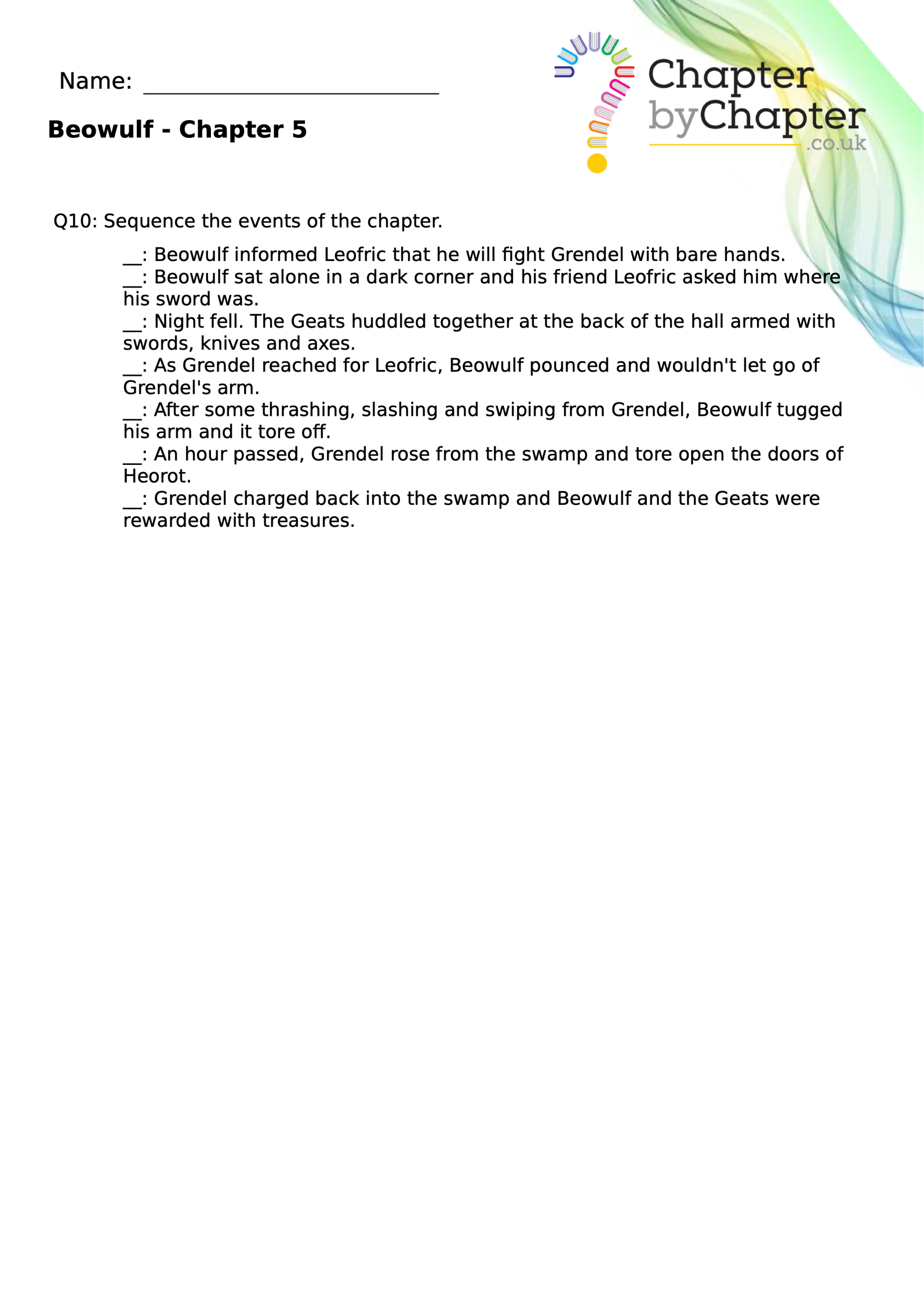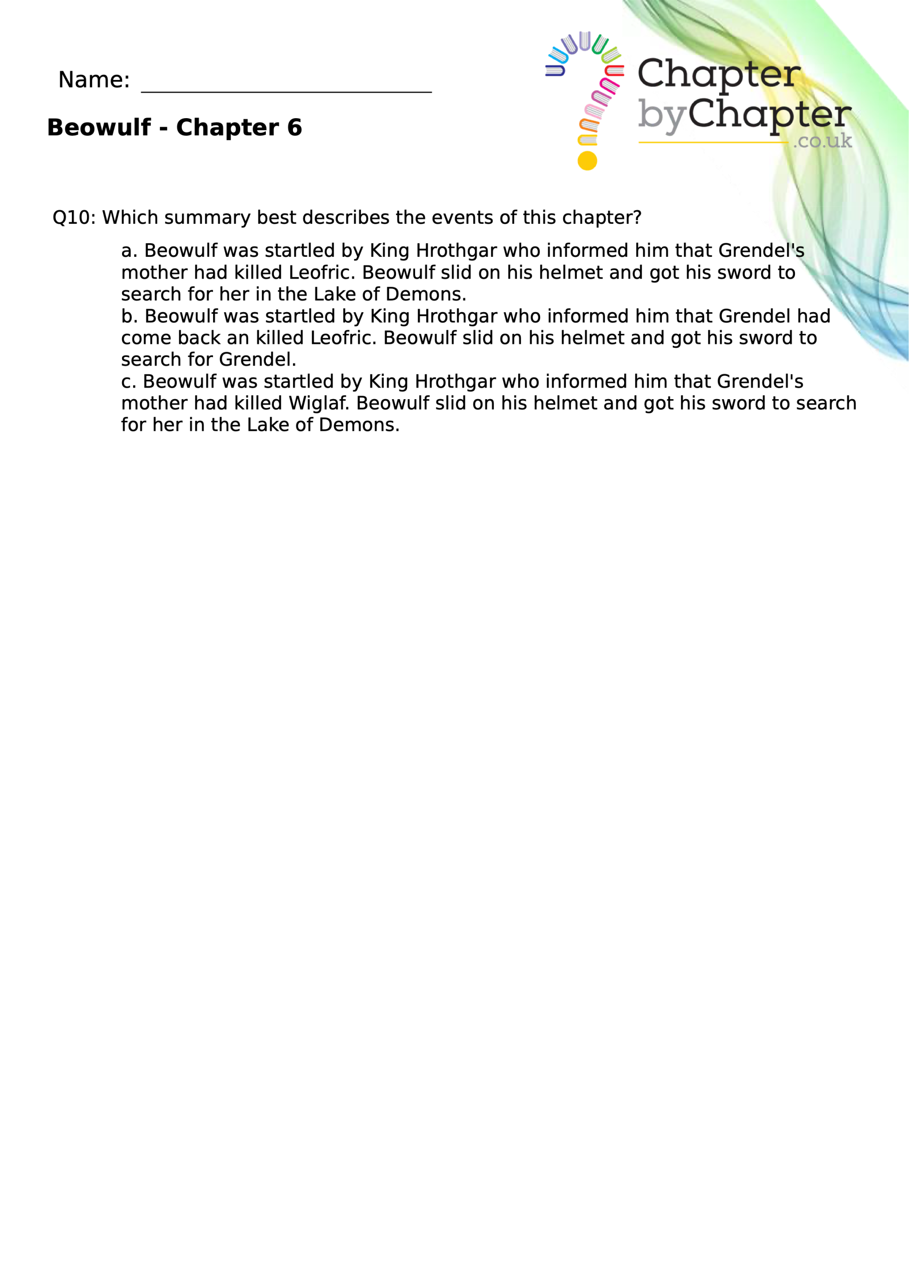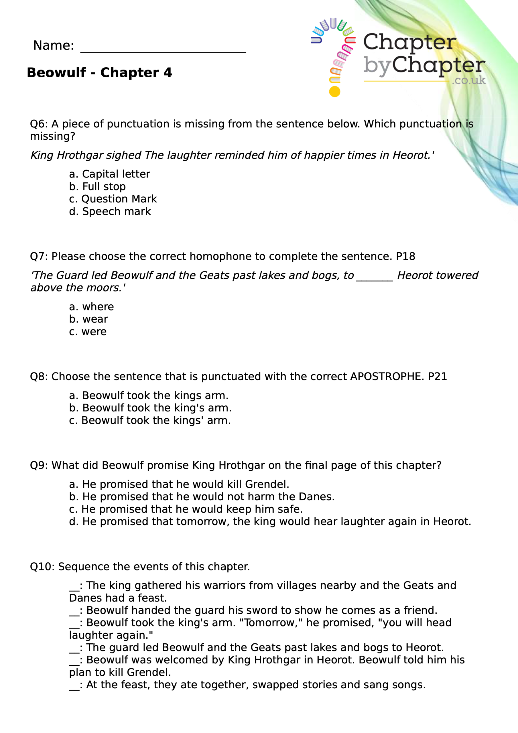 This teaching resource is for Chapter 4 of Beowulf and consists of 10 questions.