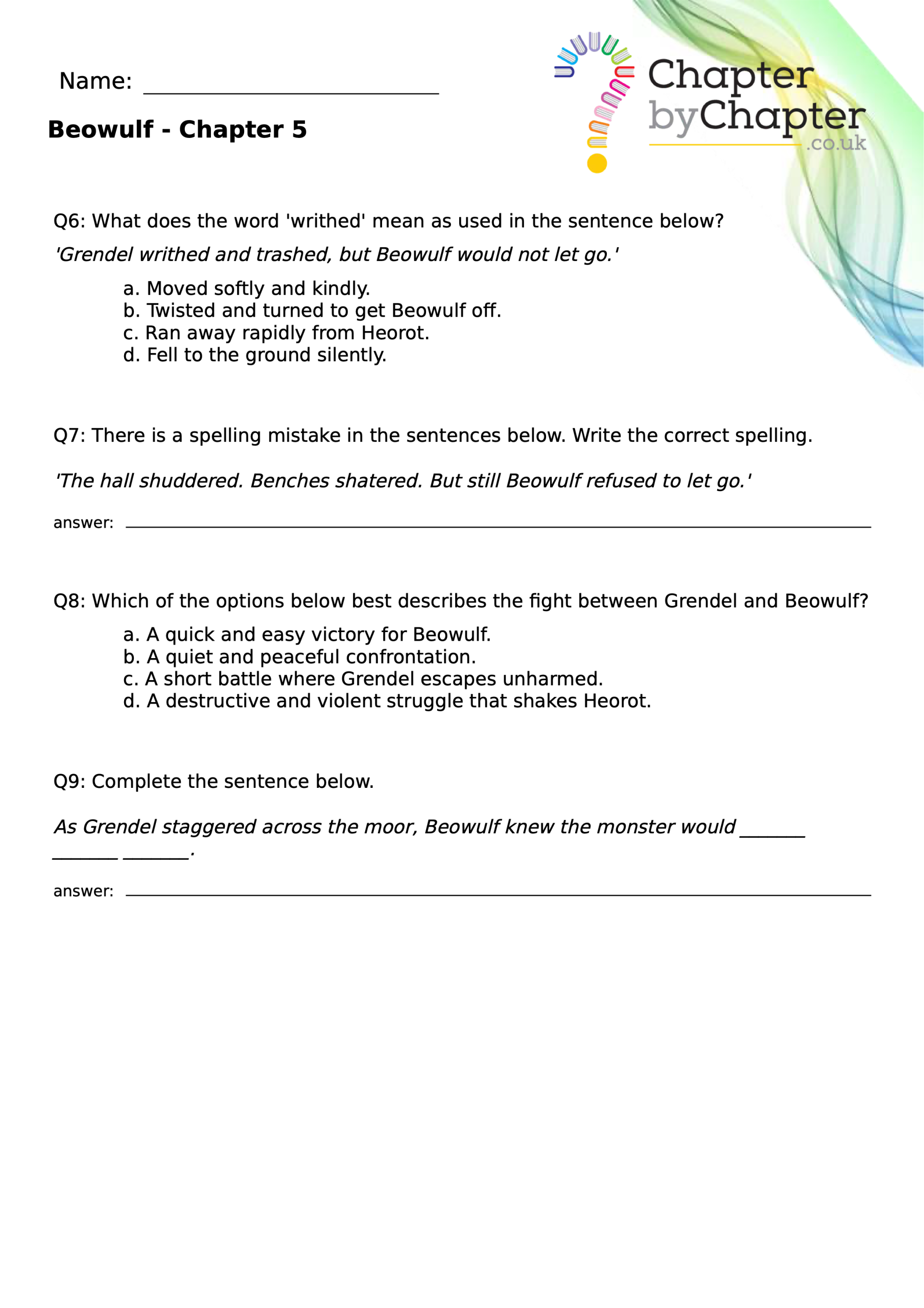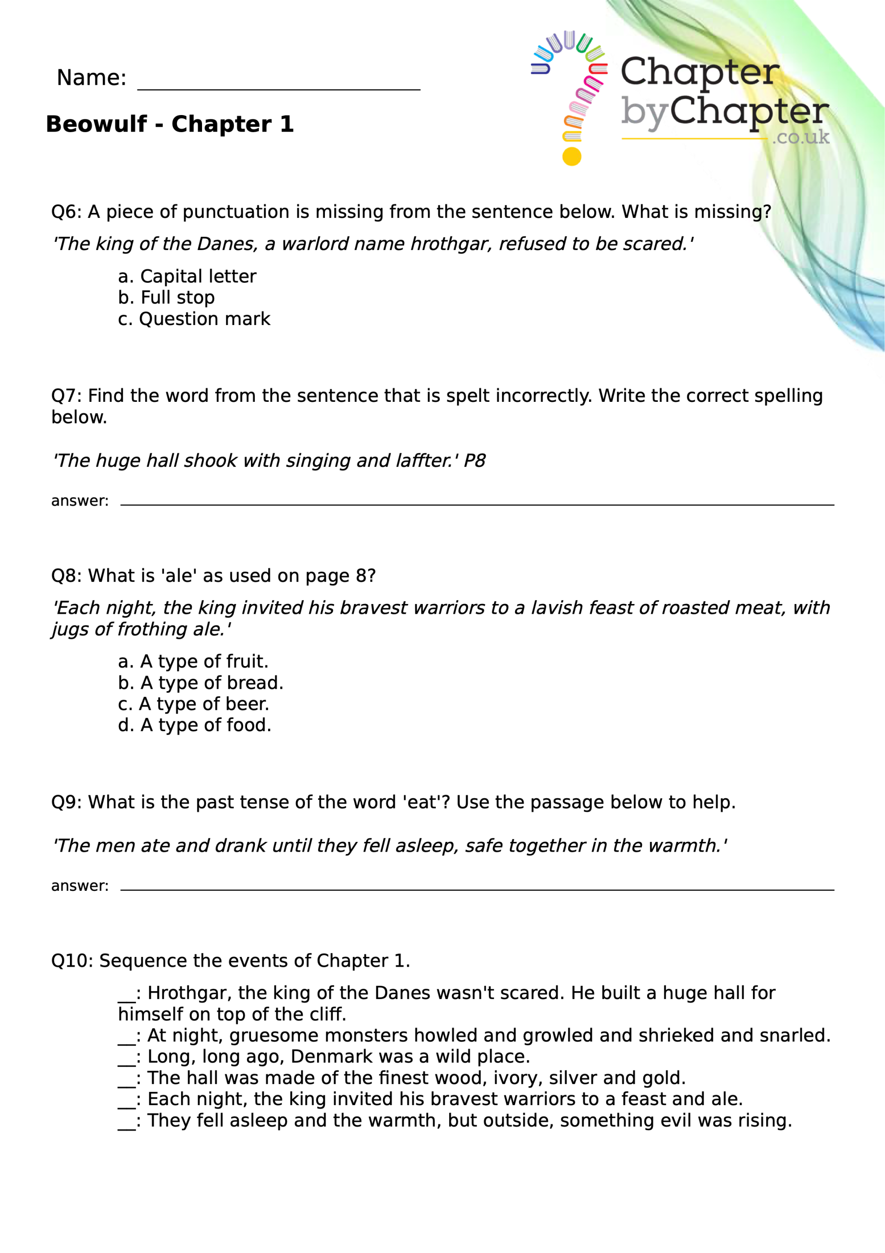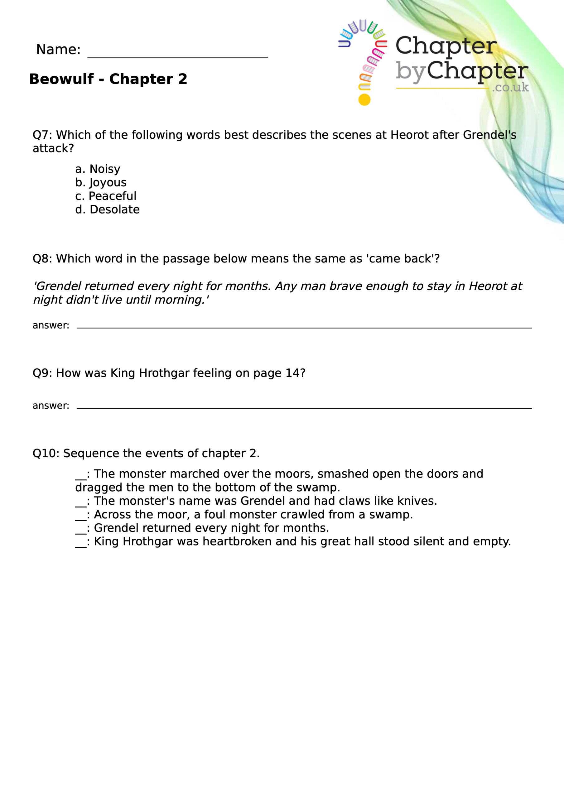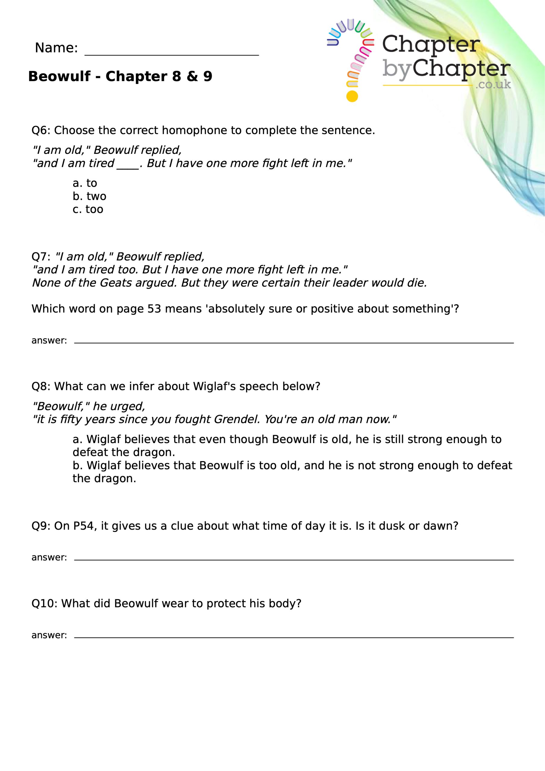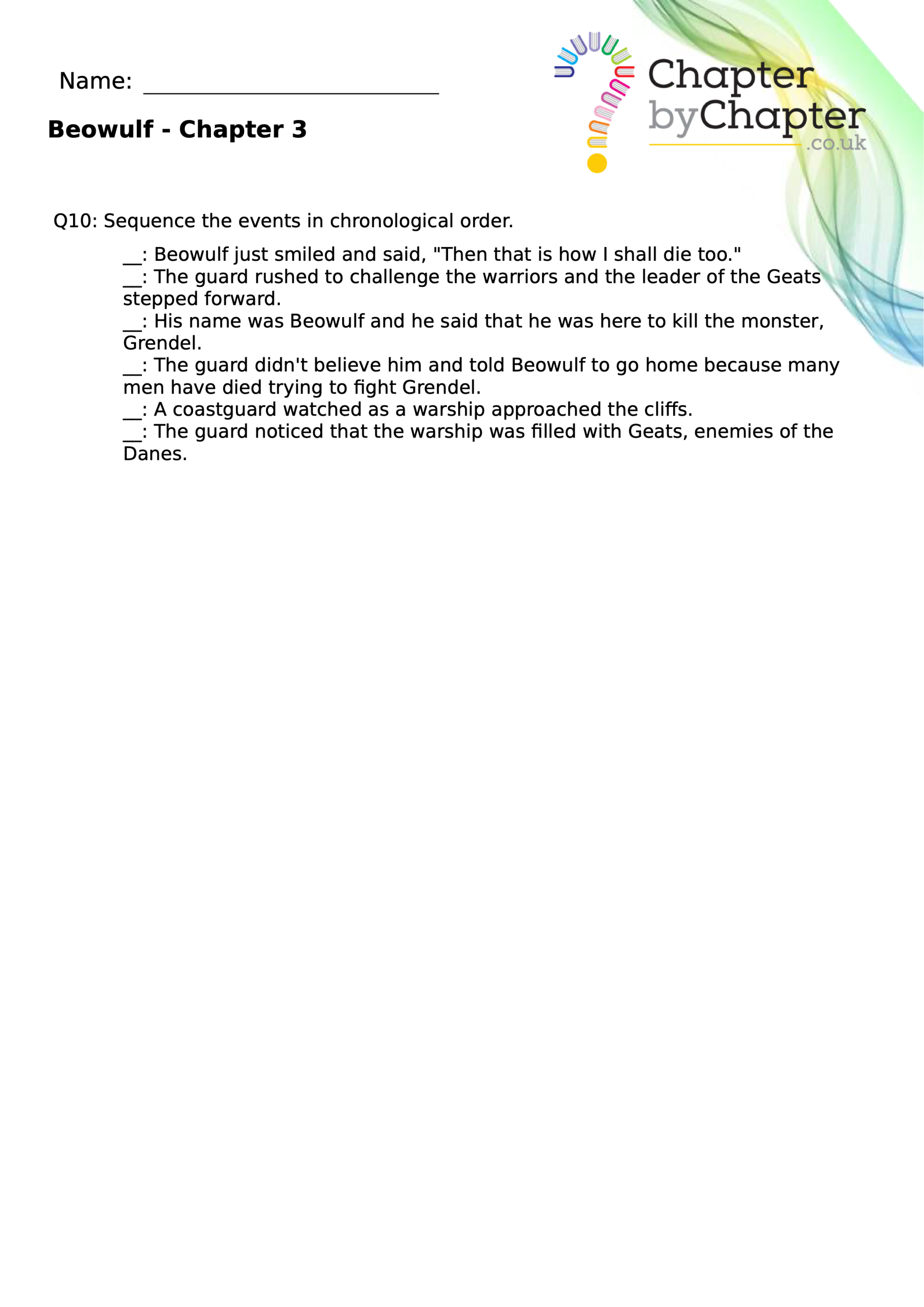 This teaching resource is for Chapter 4 of Beowulf and consists of 10 questions.