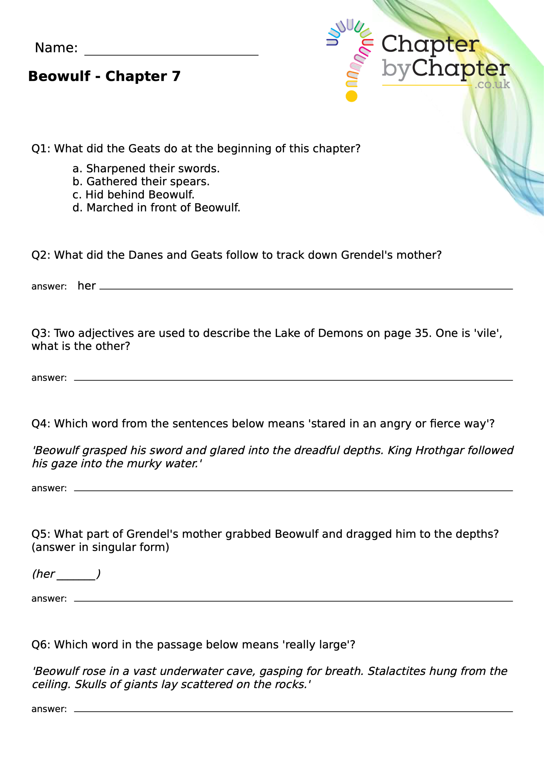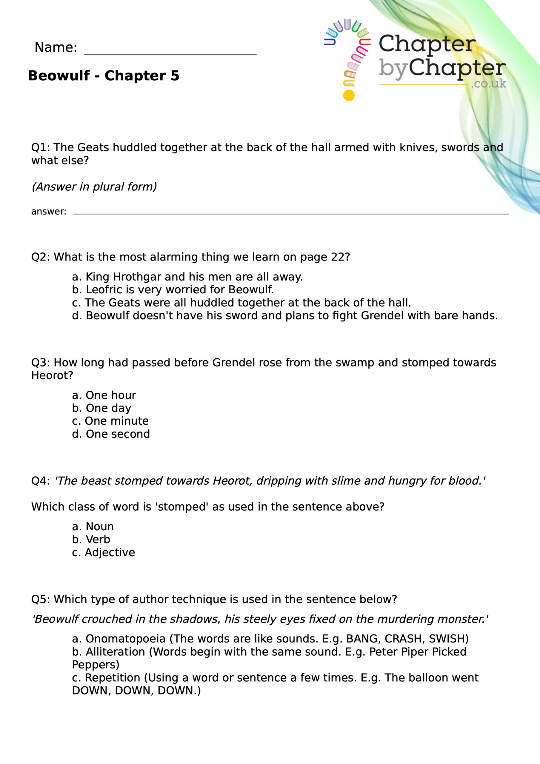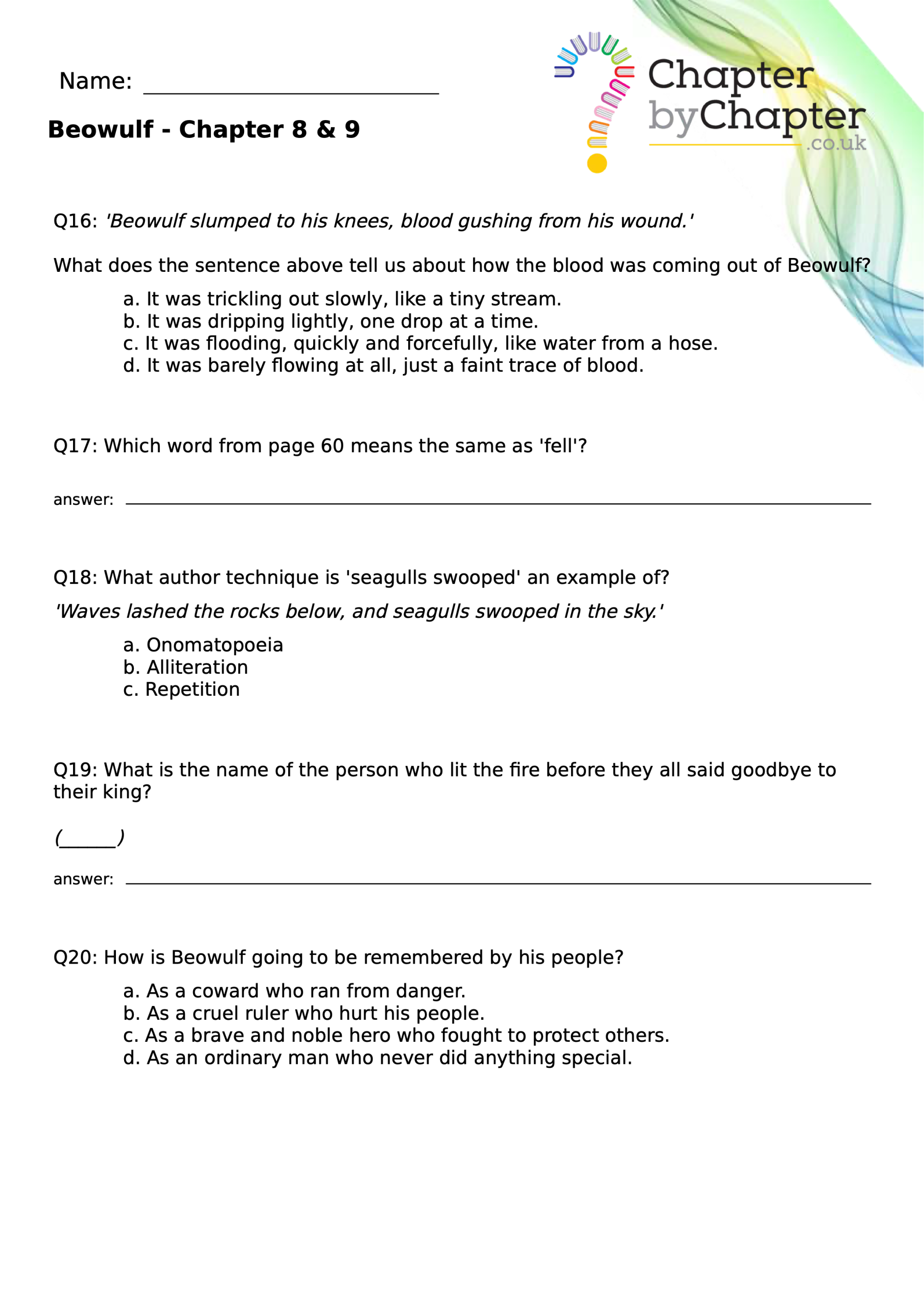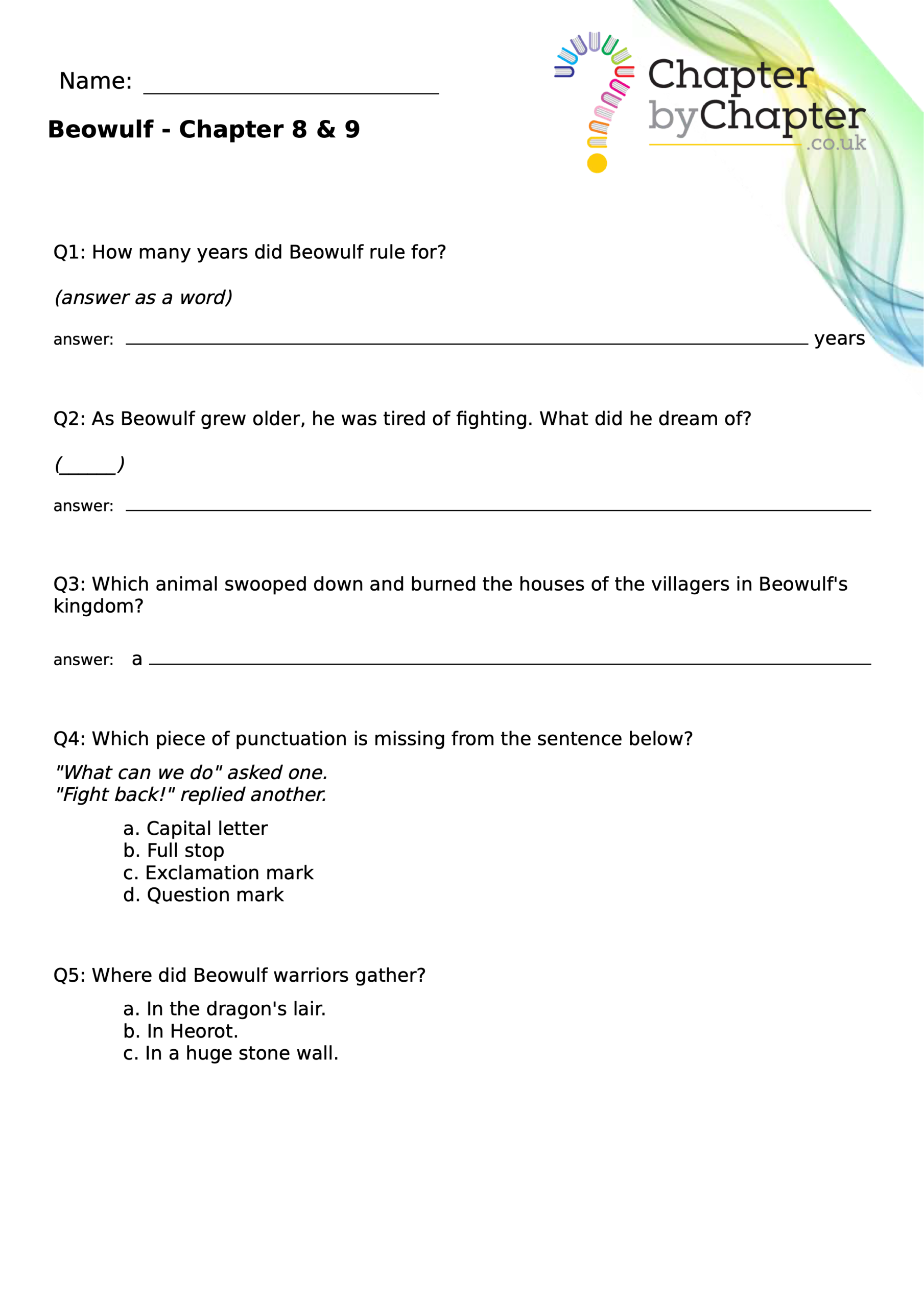This teaching resource is for Chapter 4 of Beowulf and consists of 10 questions.