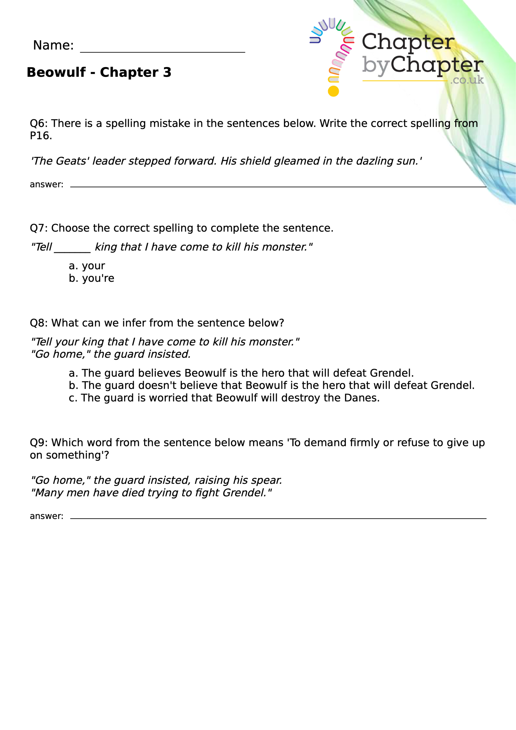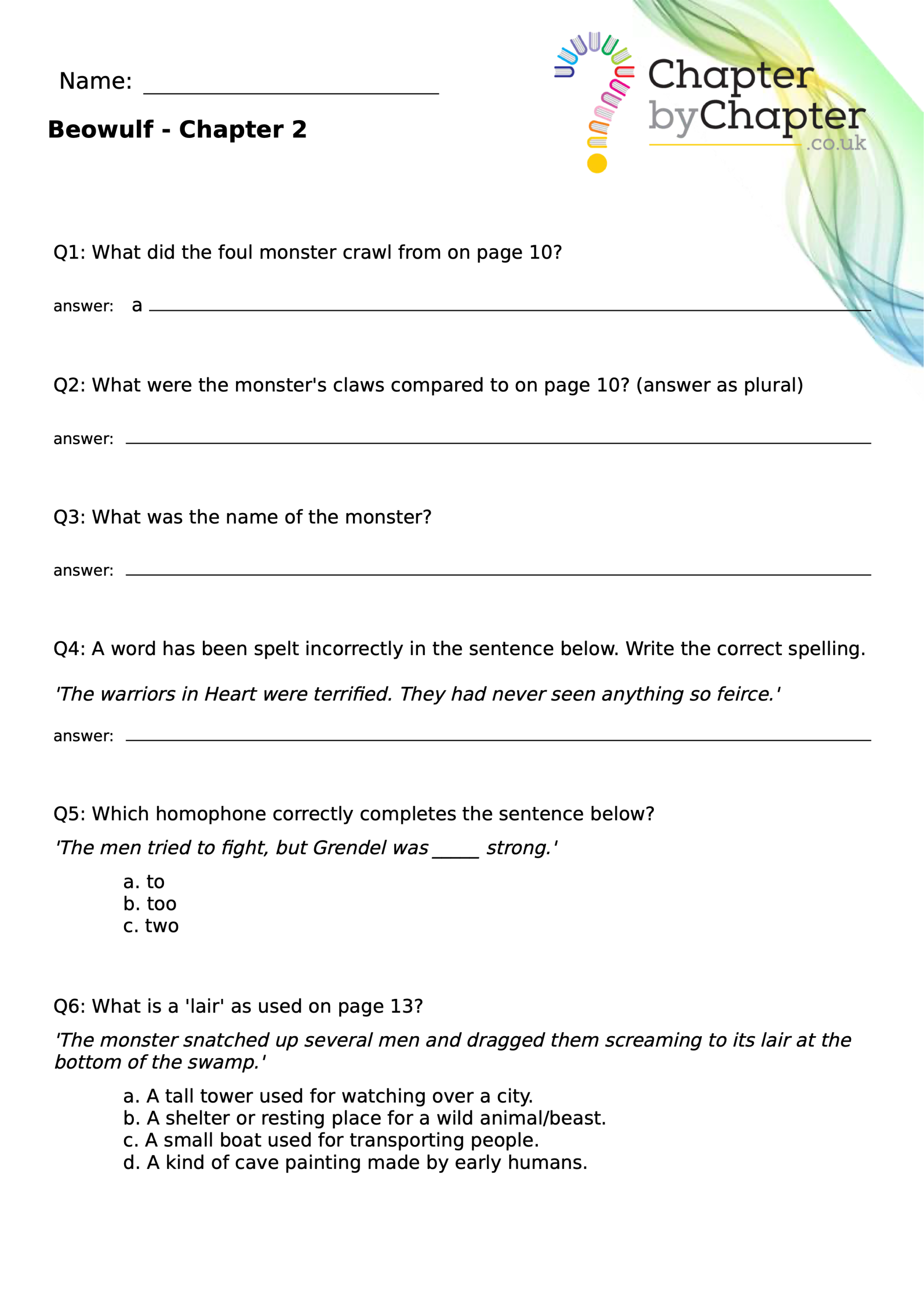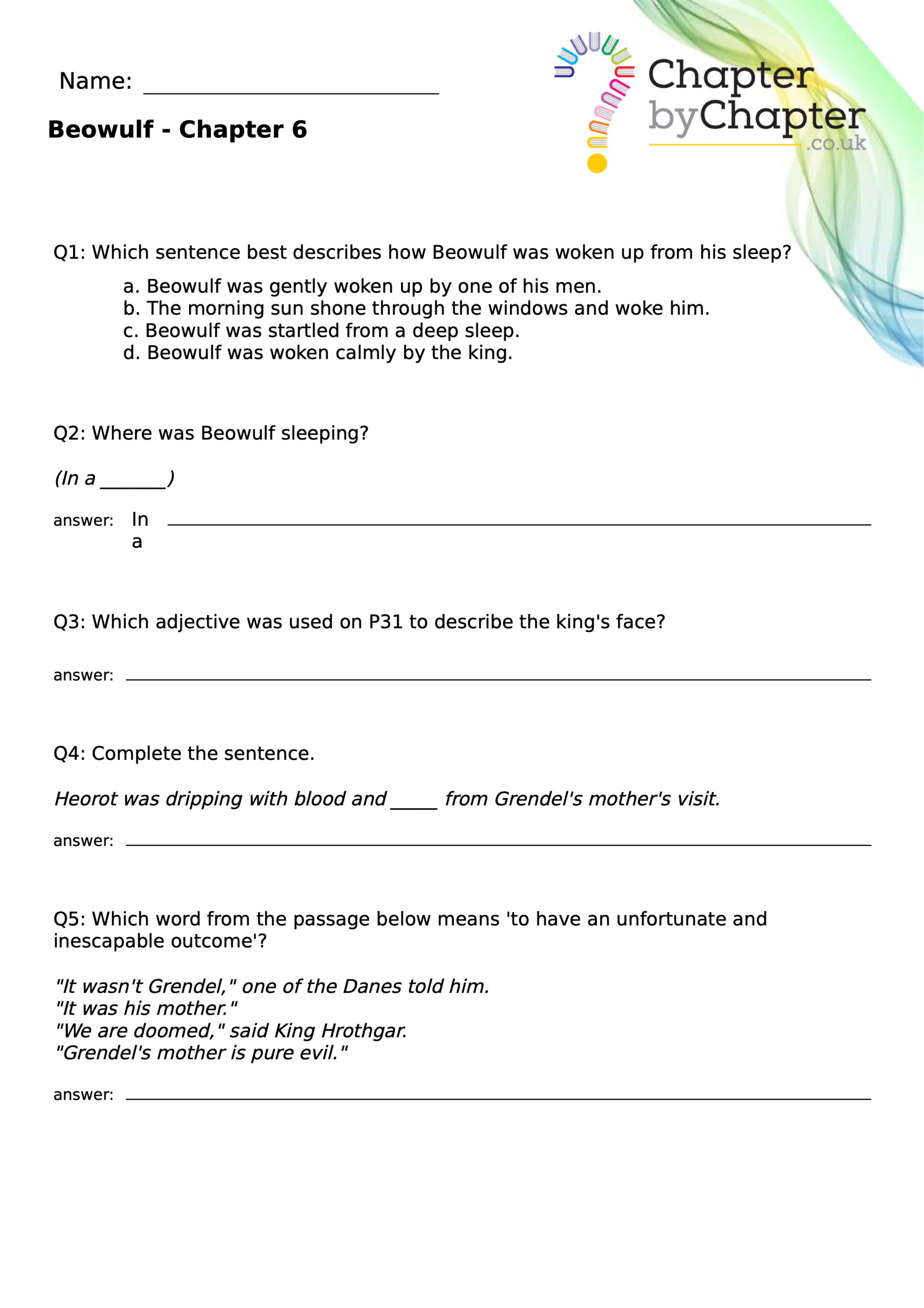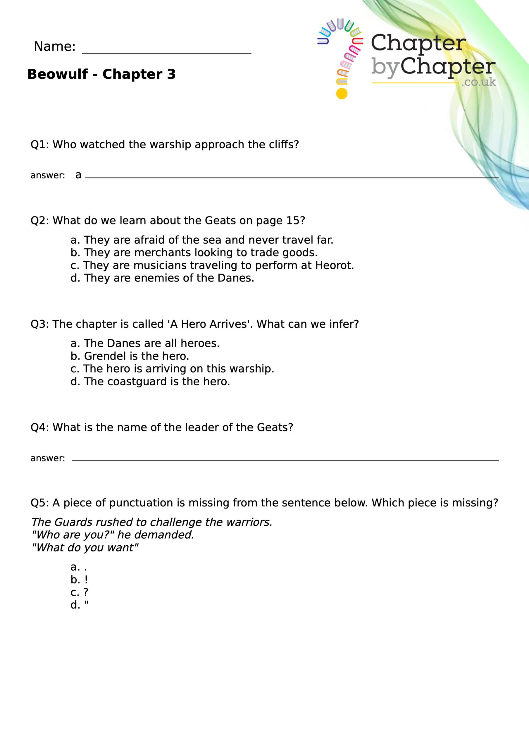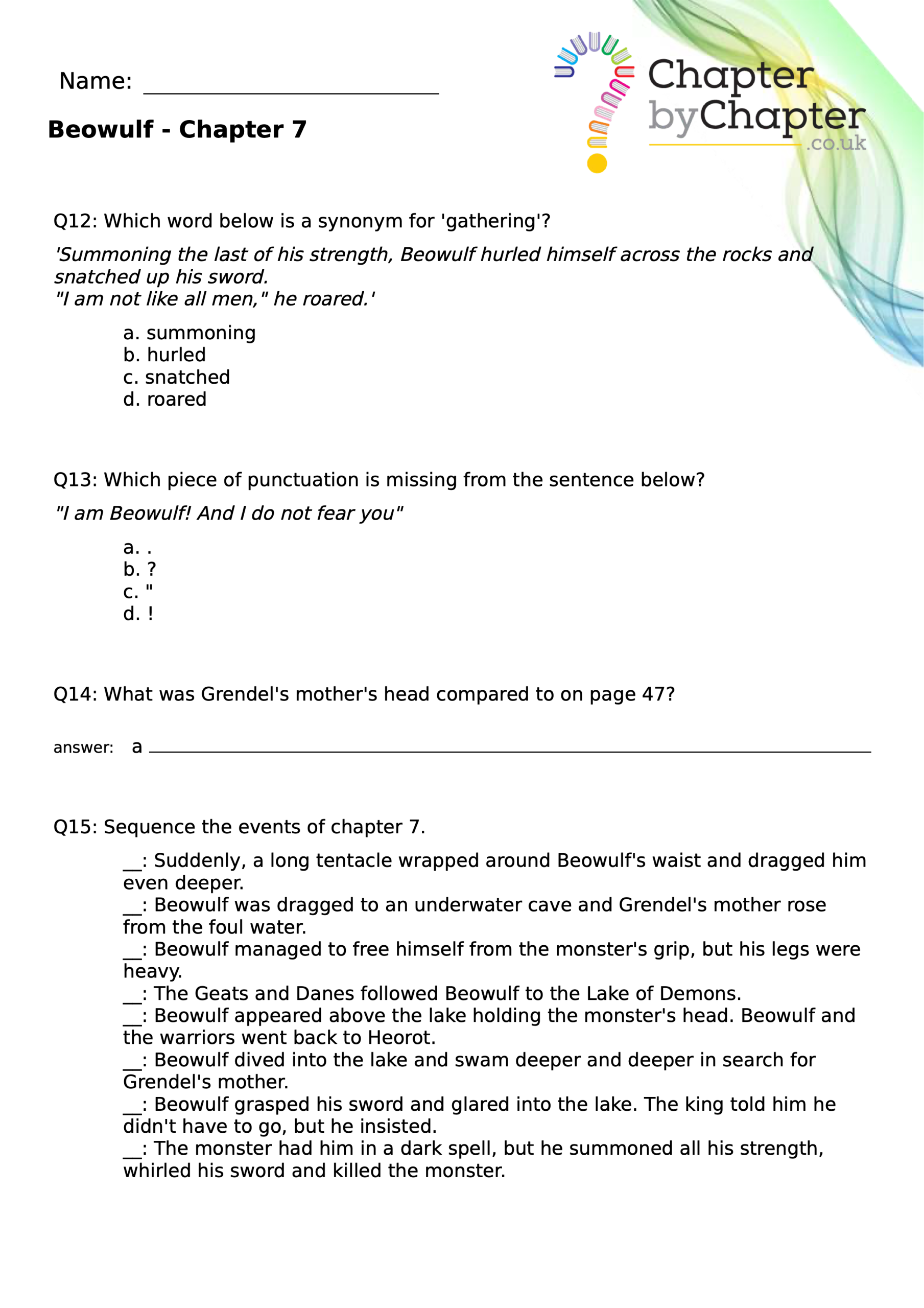 This teaching resource is for Chapter 4 of Beowulf and consists of 10 questions.