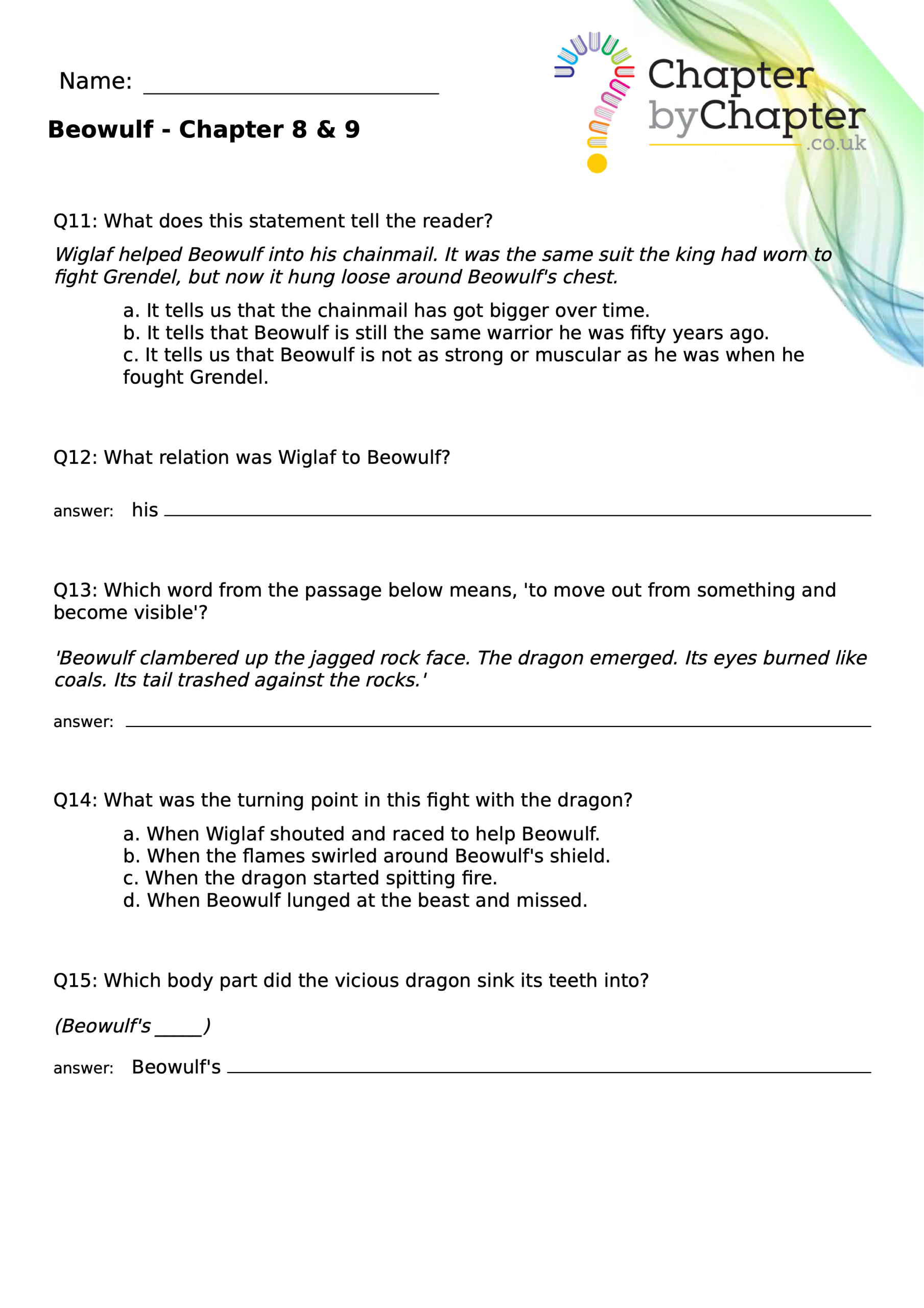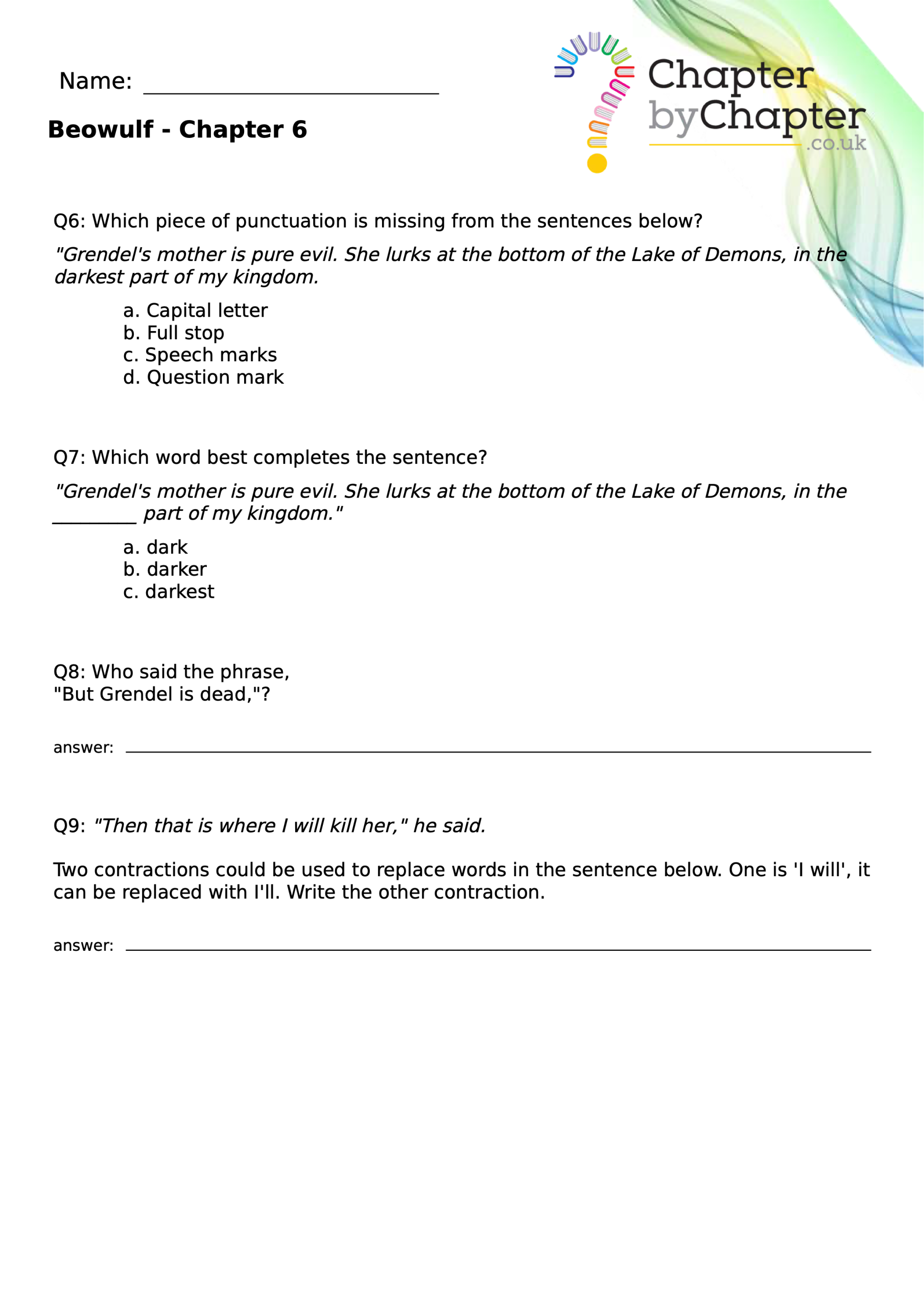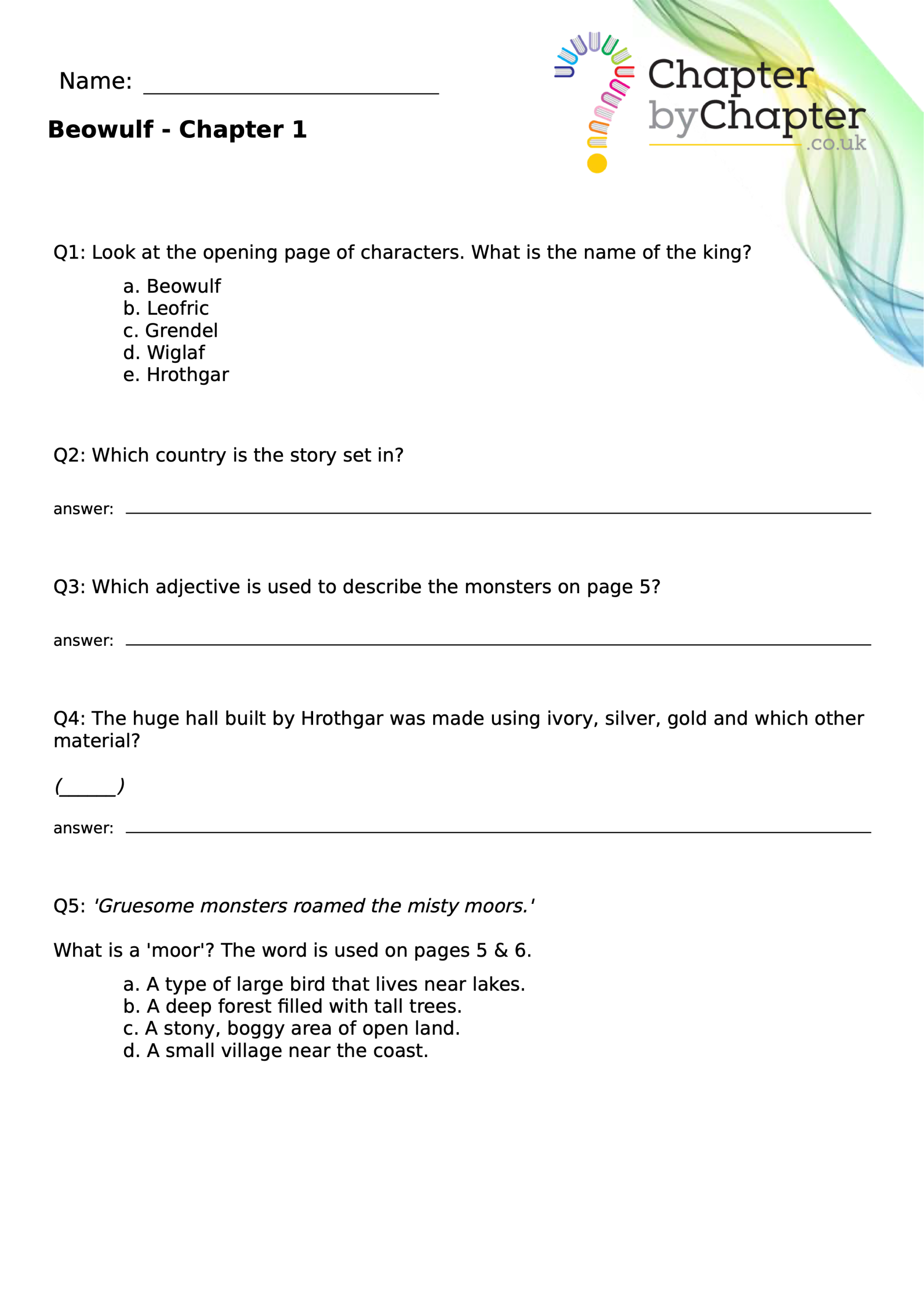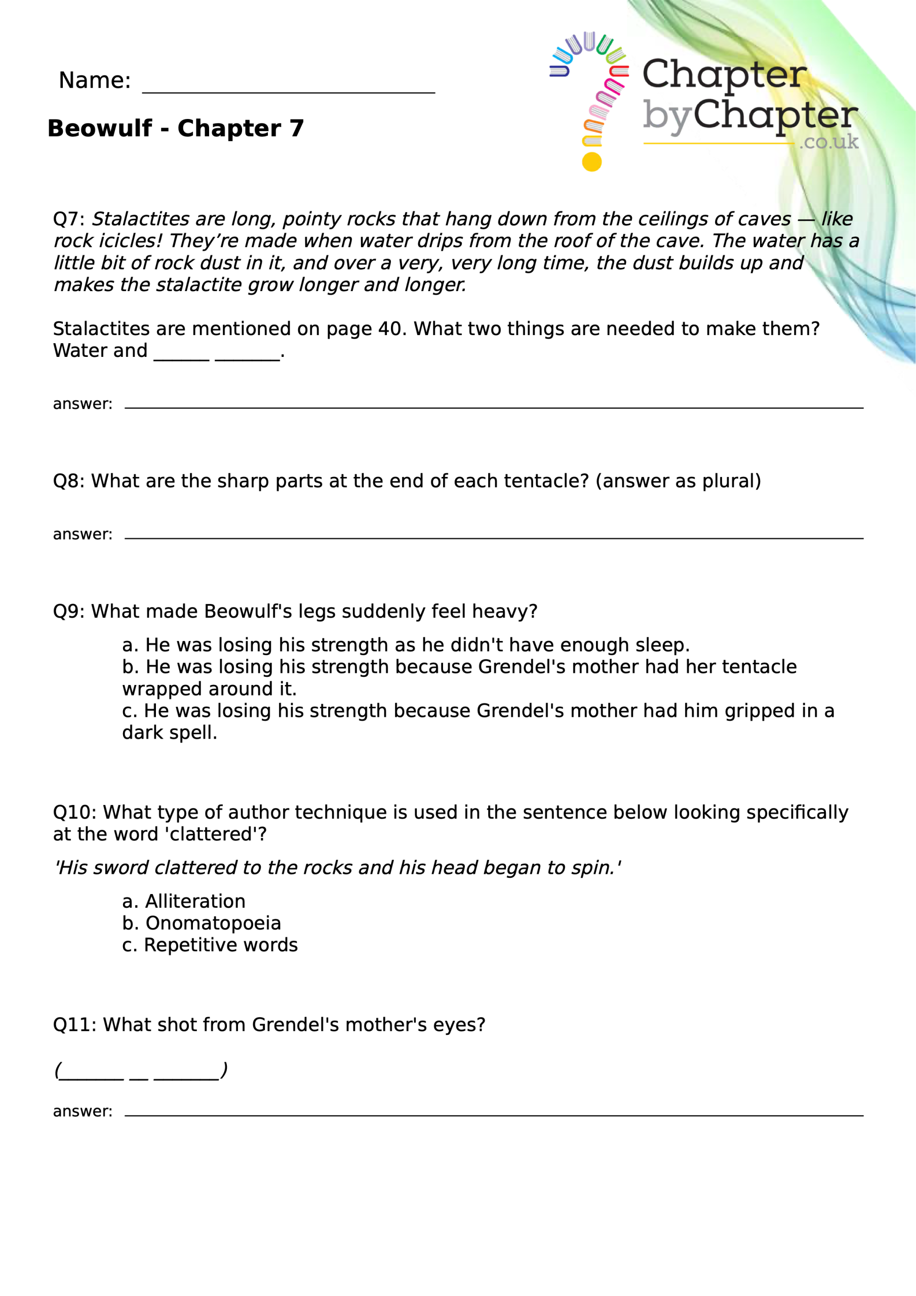 This teaching resource is for Chapter 4 of Beowulf and consists of 10 questions.