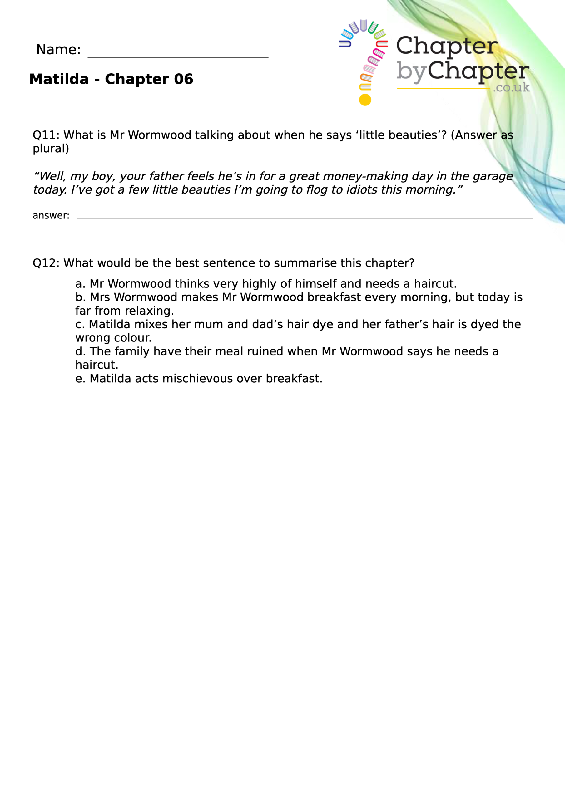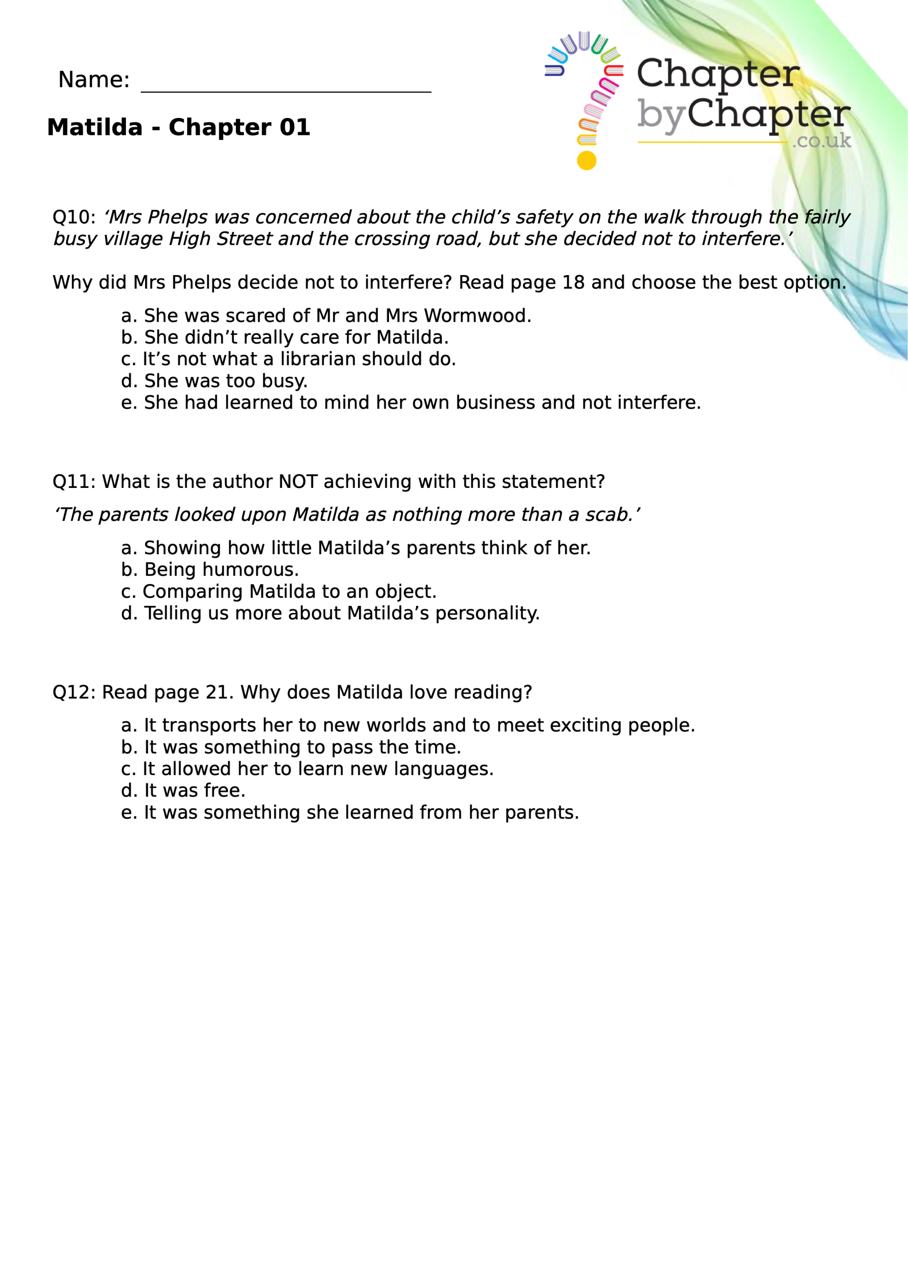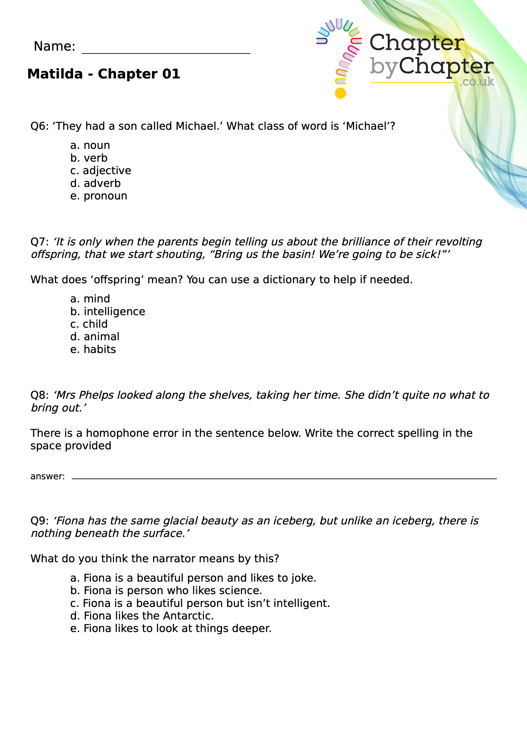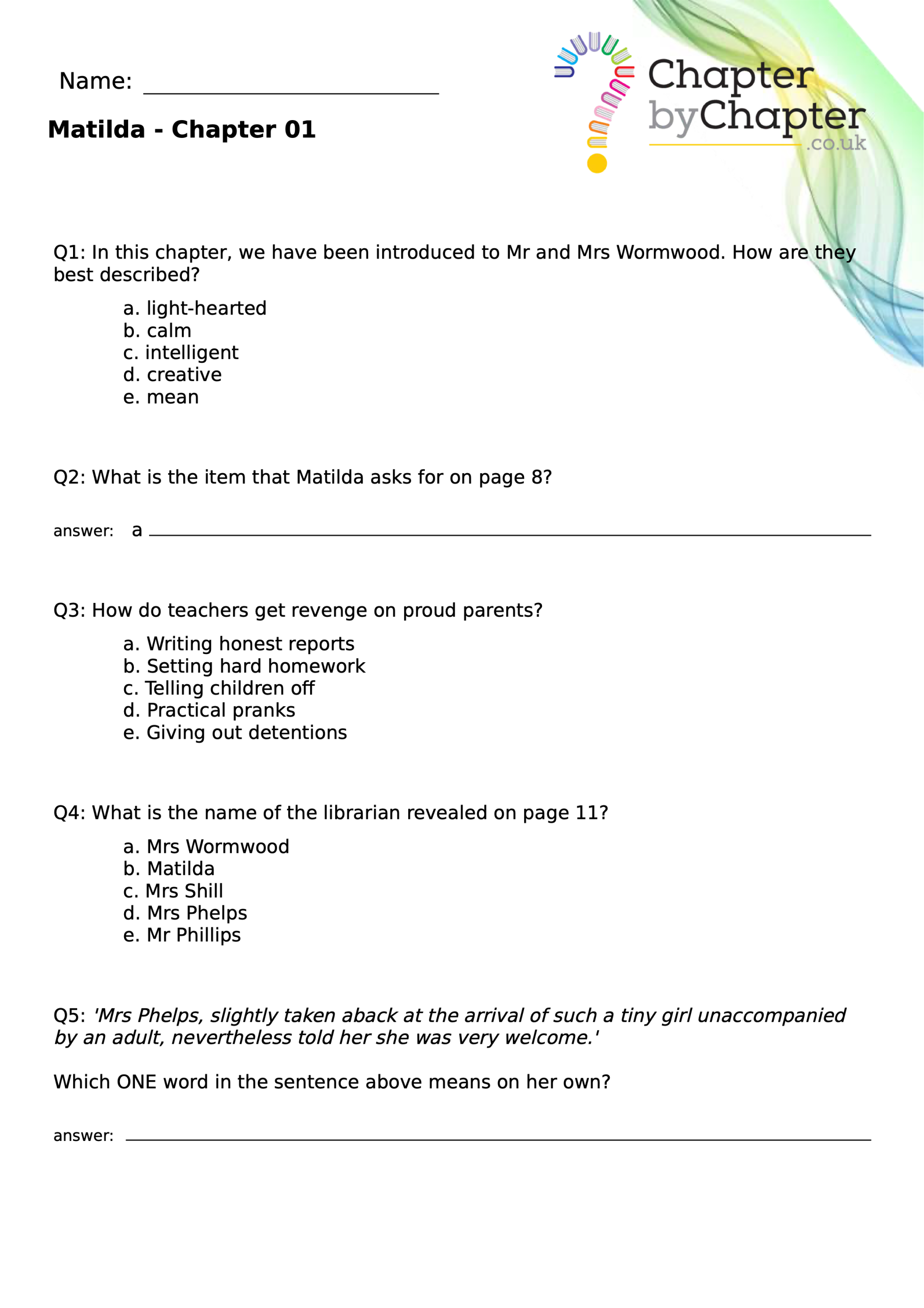 The first comprehension set for Chapter 1 of Matilda includes 12 questions that vary in style to cover: retrieval questions, SPAG, inference and more.