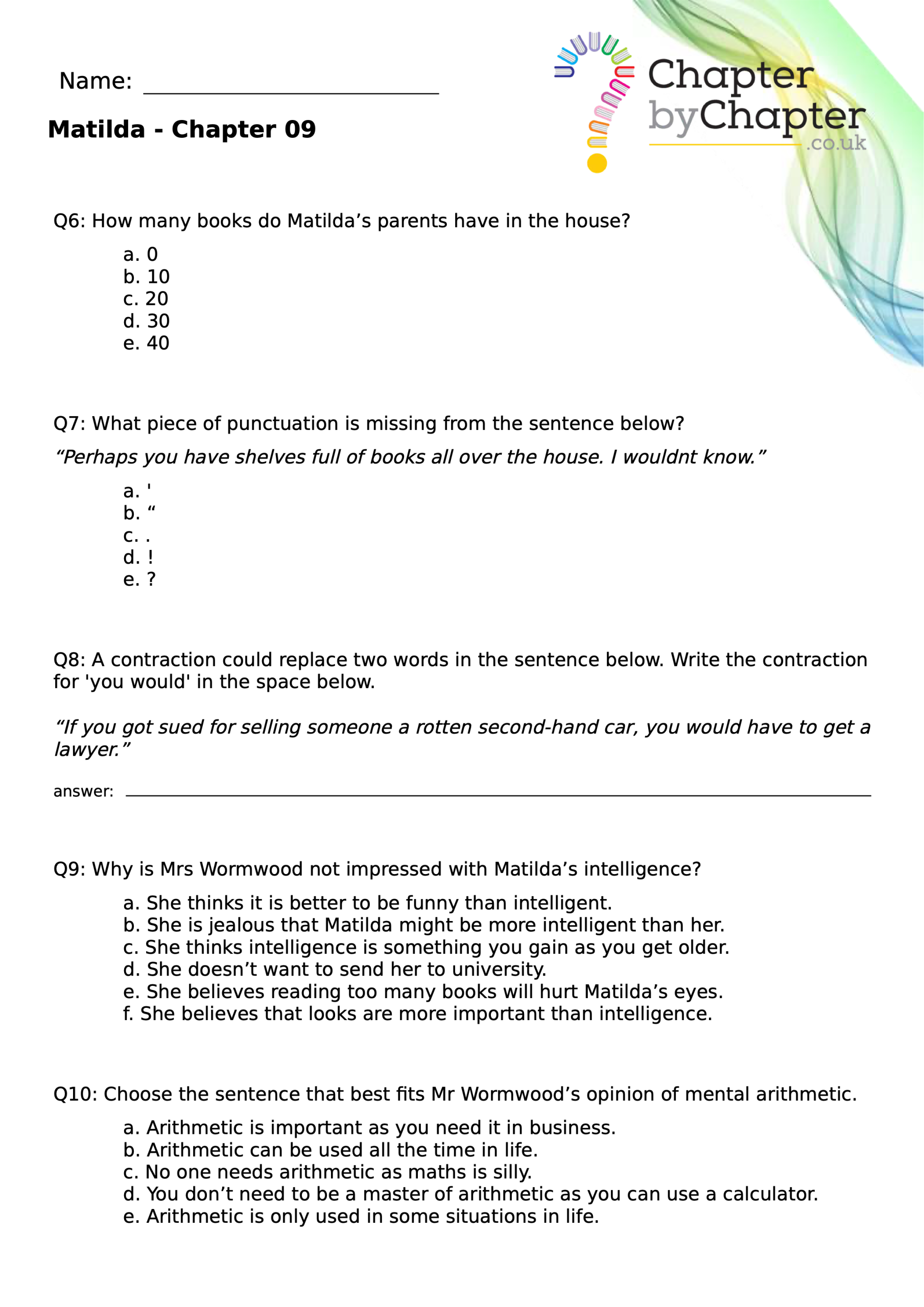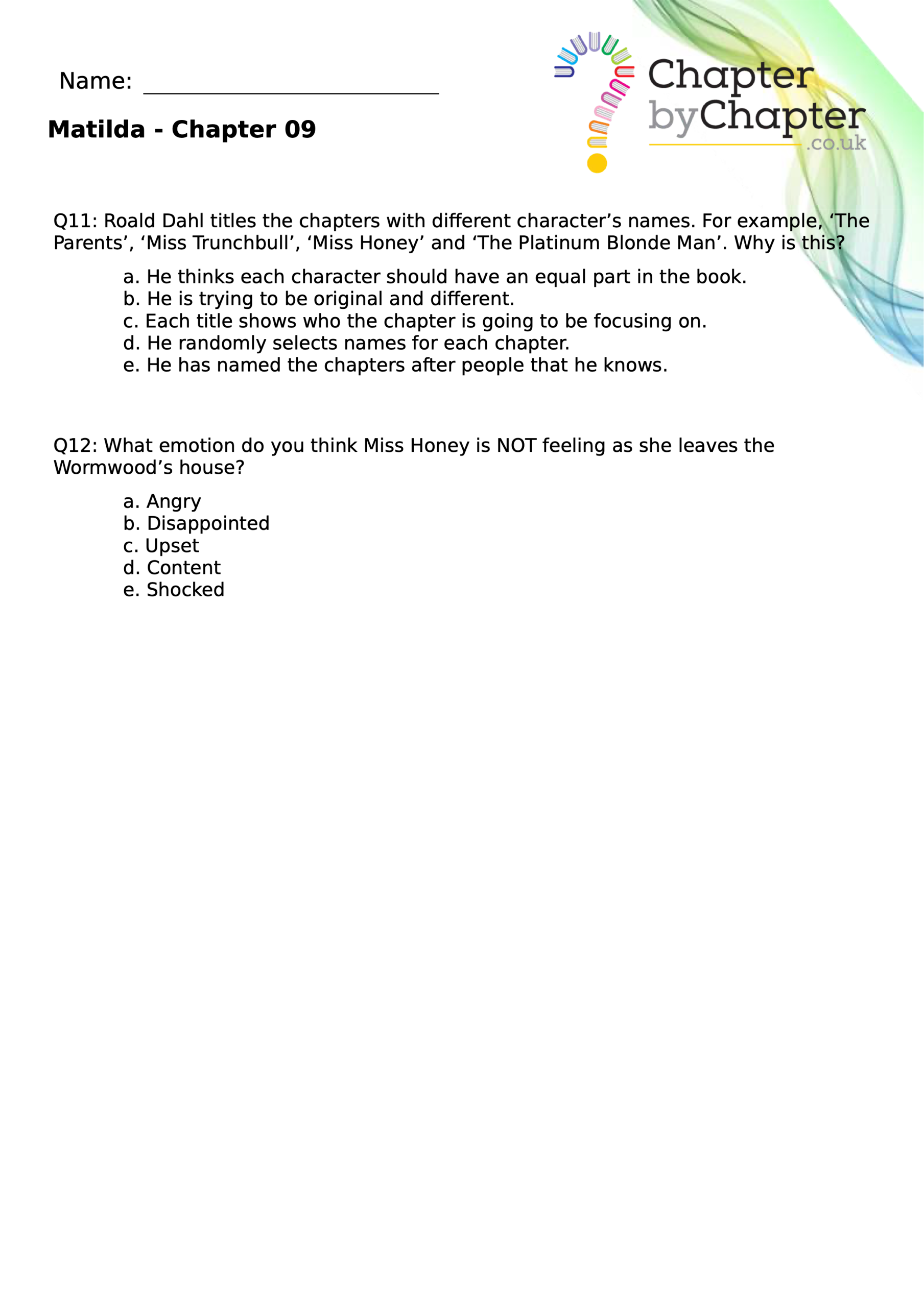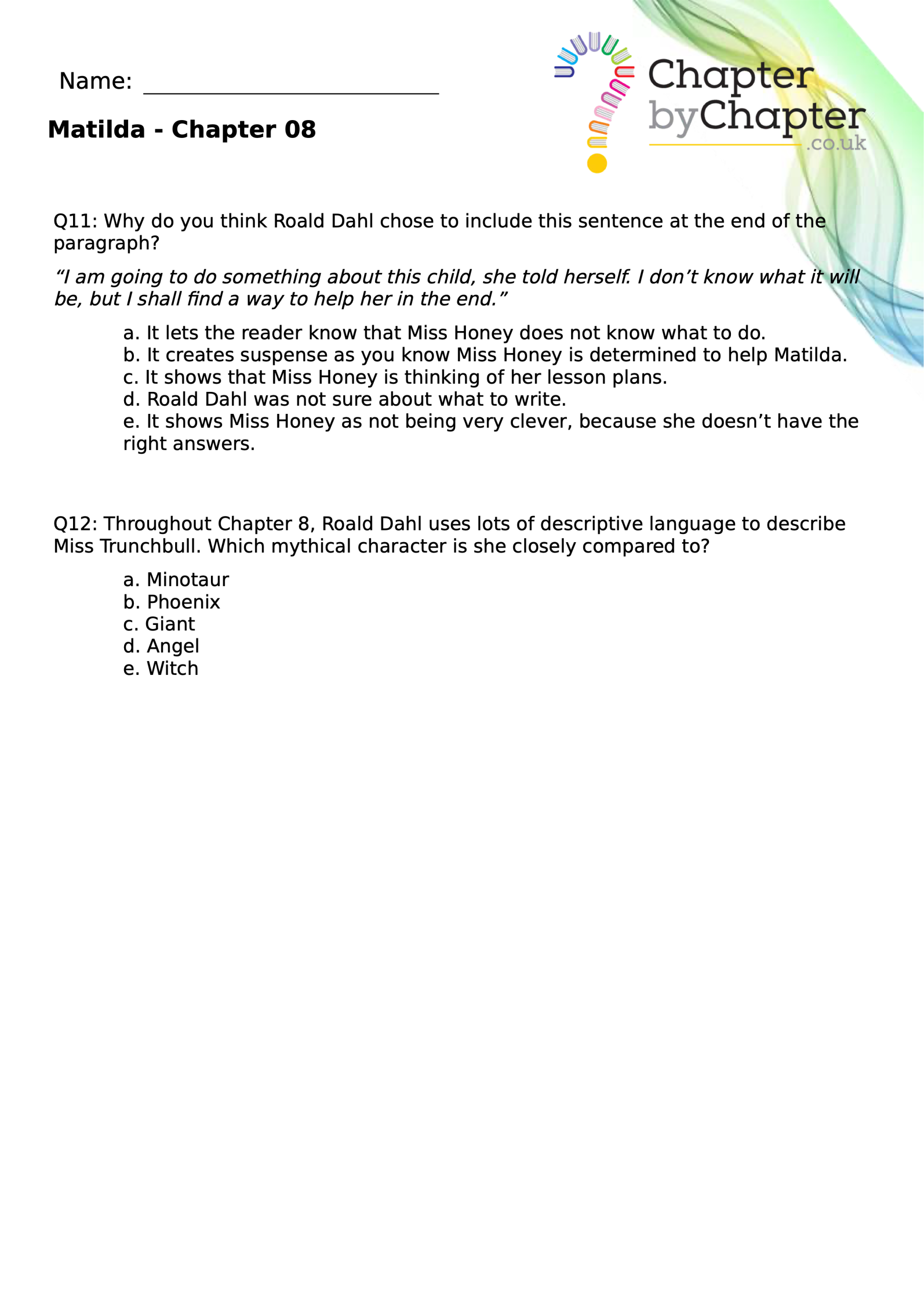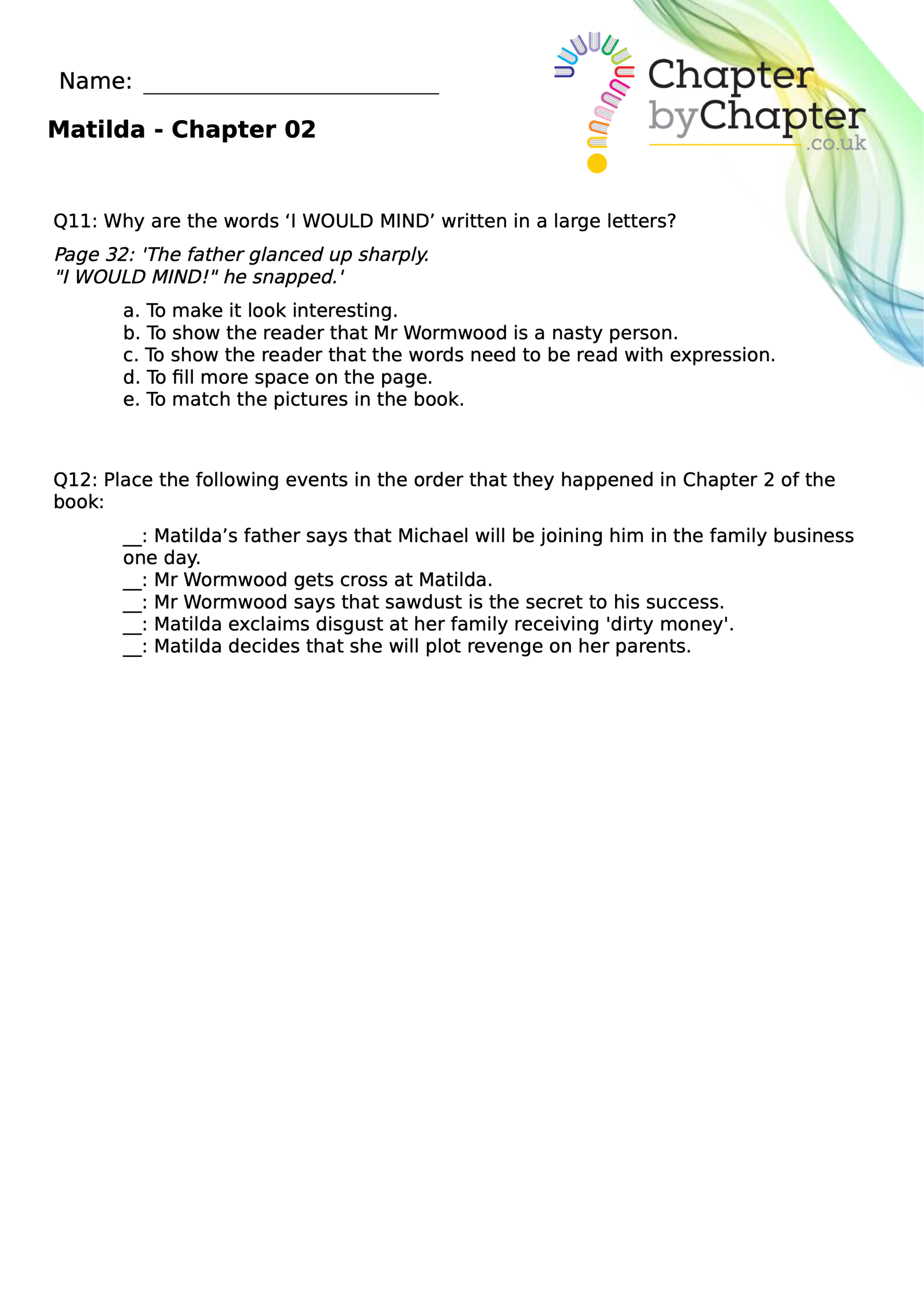 The first comprehension set for Chapter 1 of Matilda includes 12 questions that vary in style to cover: retrieval questions, SPAG, inference and more.