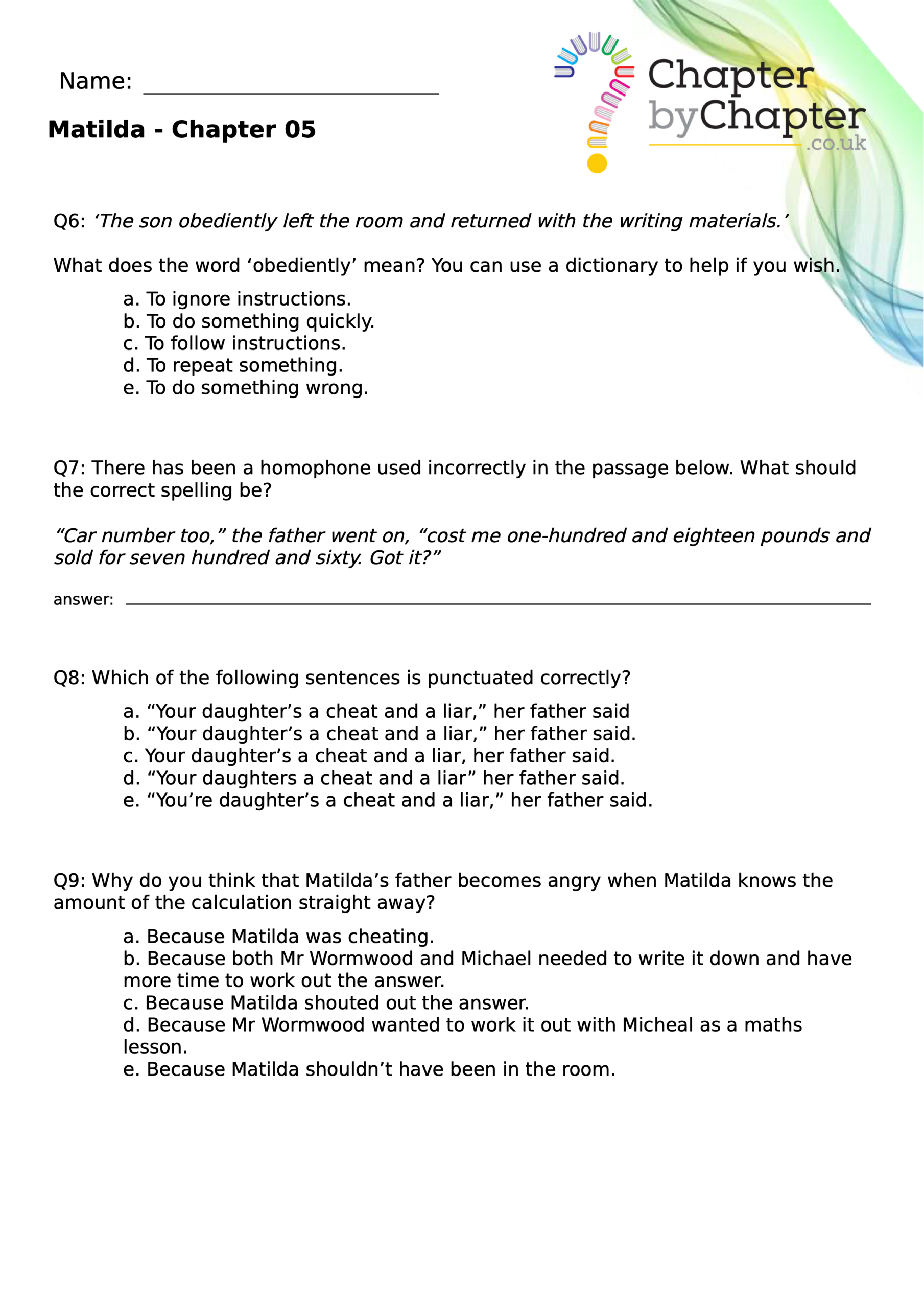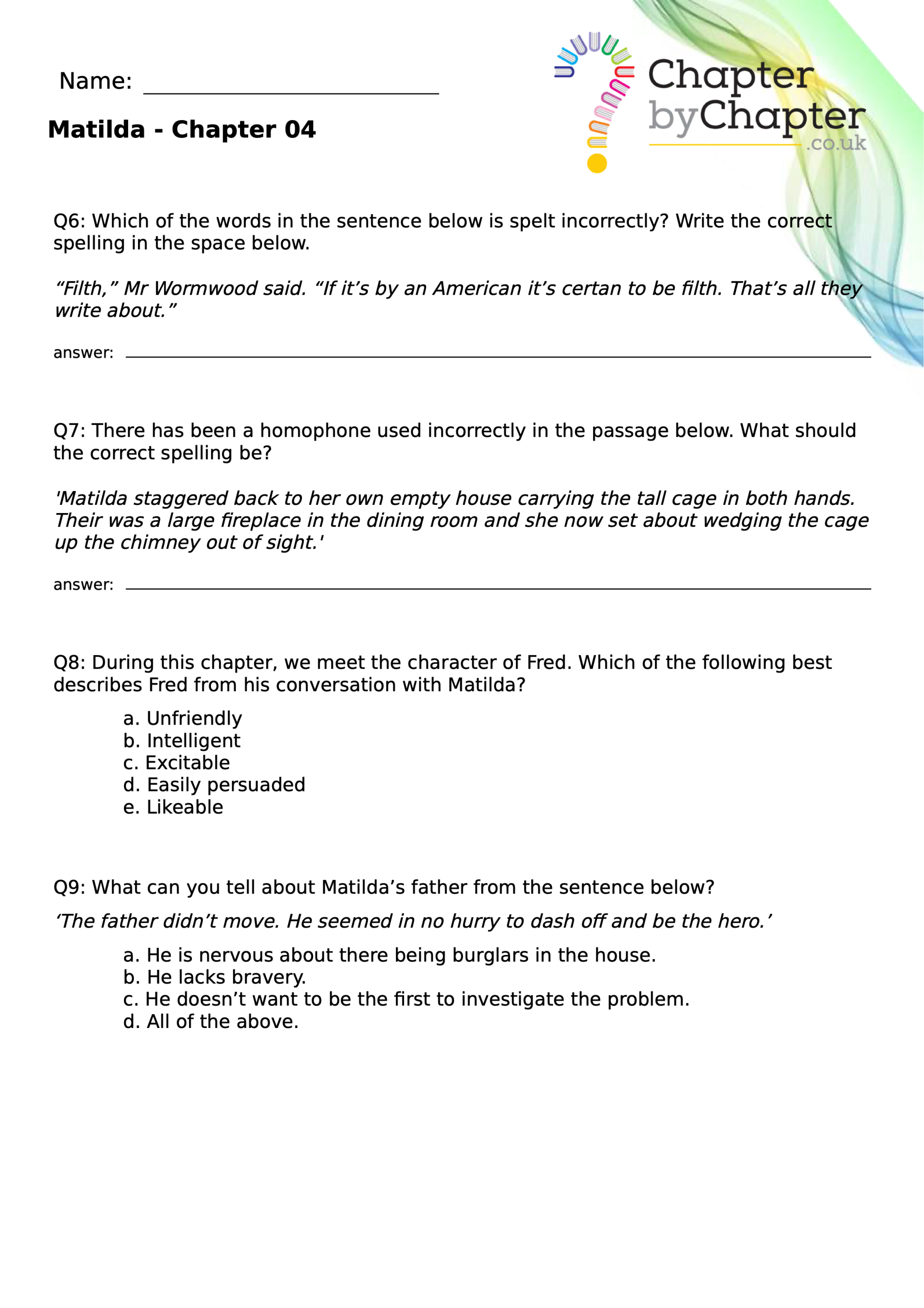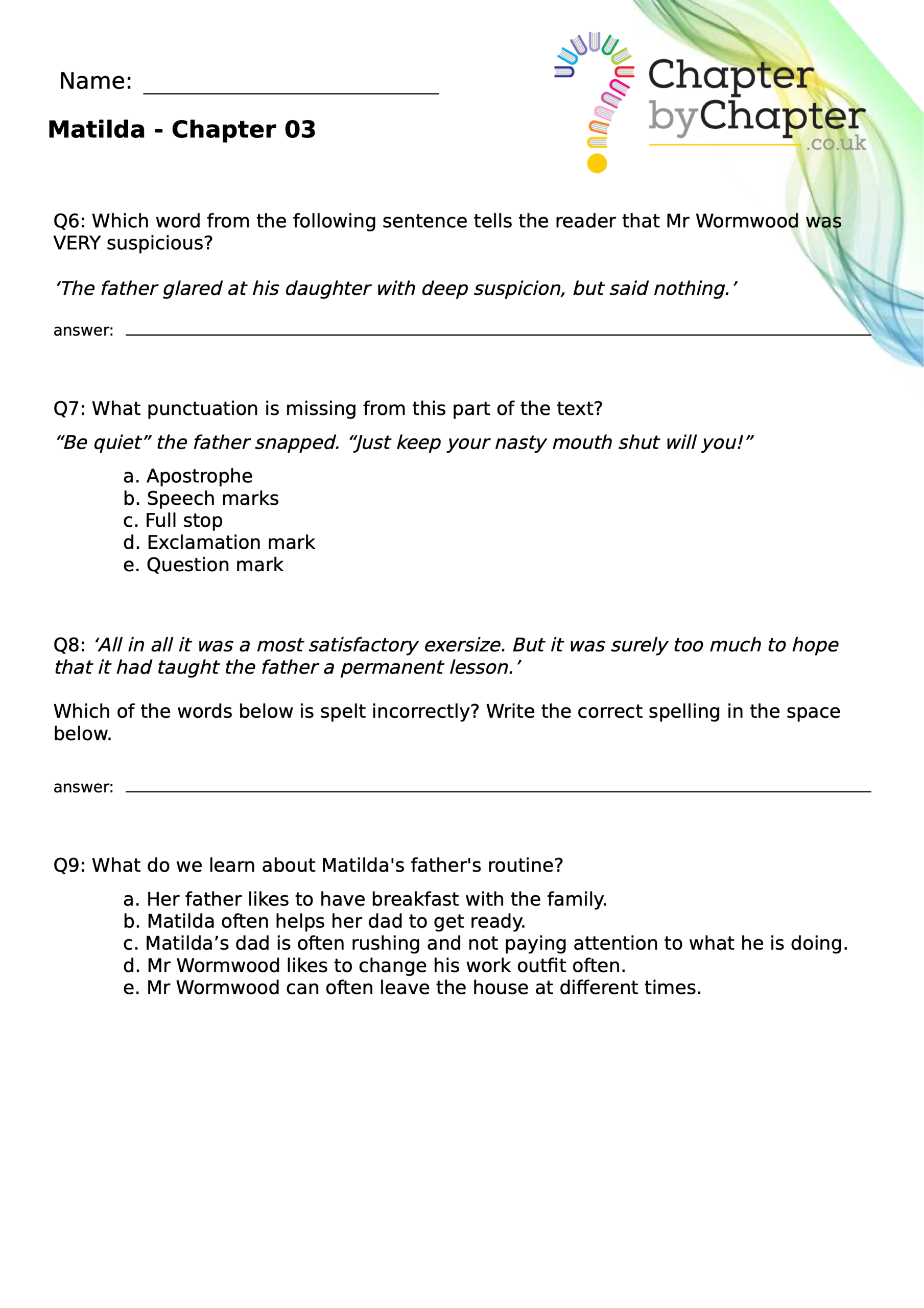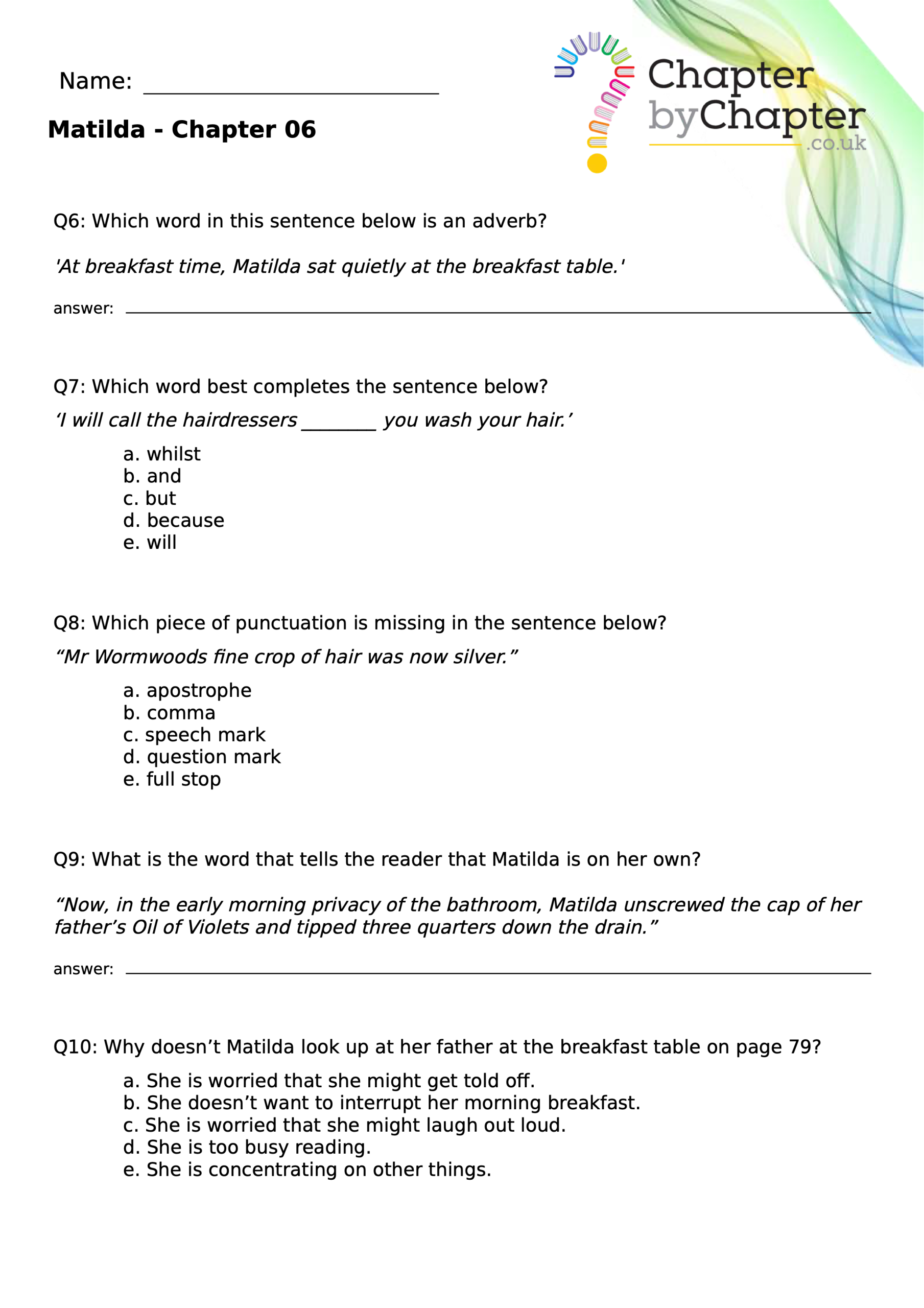 Pupils can practise grammar, punctuation, and spelling in context with our comprehension pack for Matilda from questions 5-8, tied directly to each chapter.
