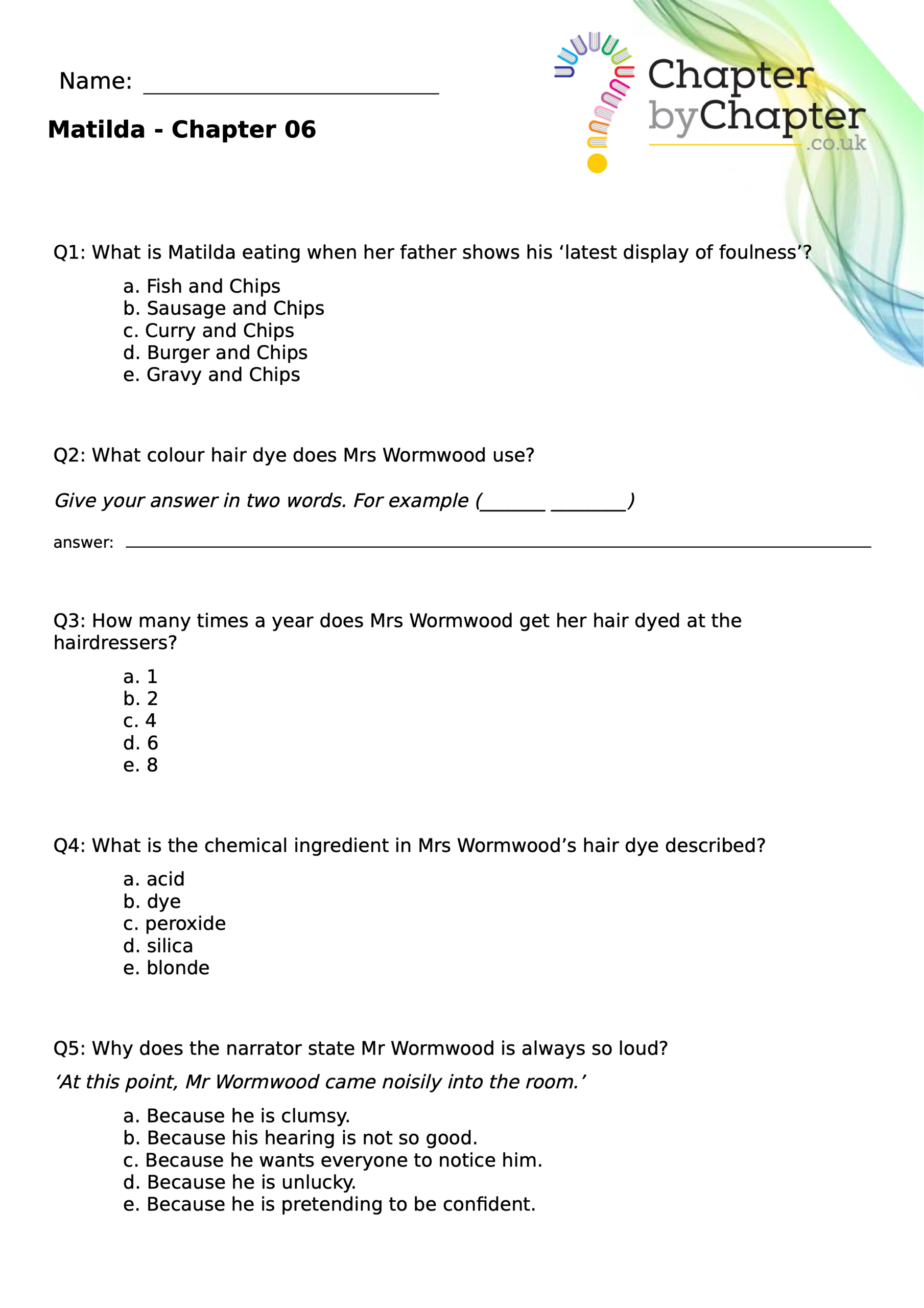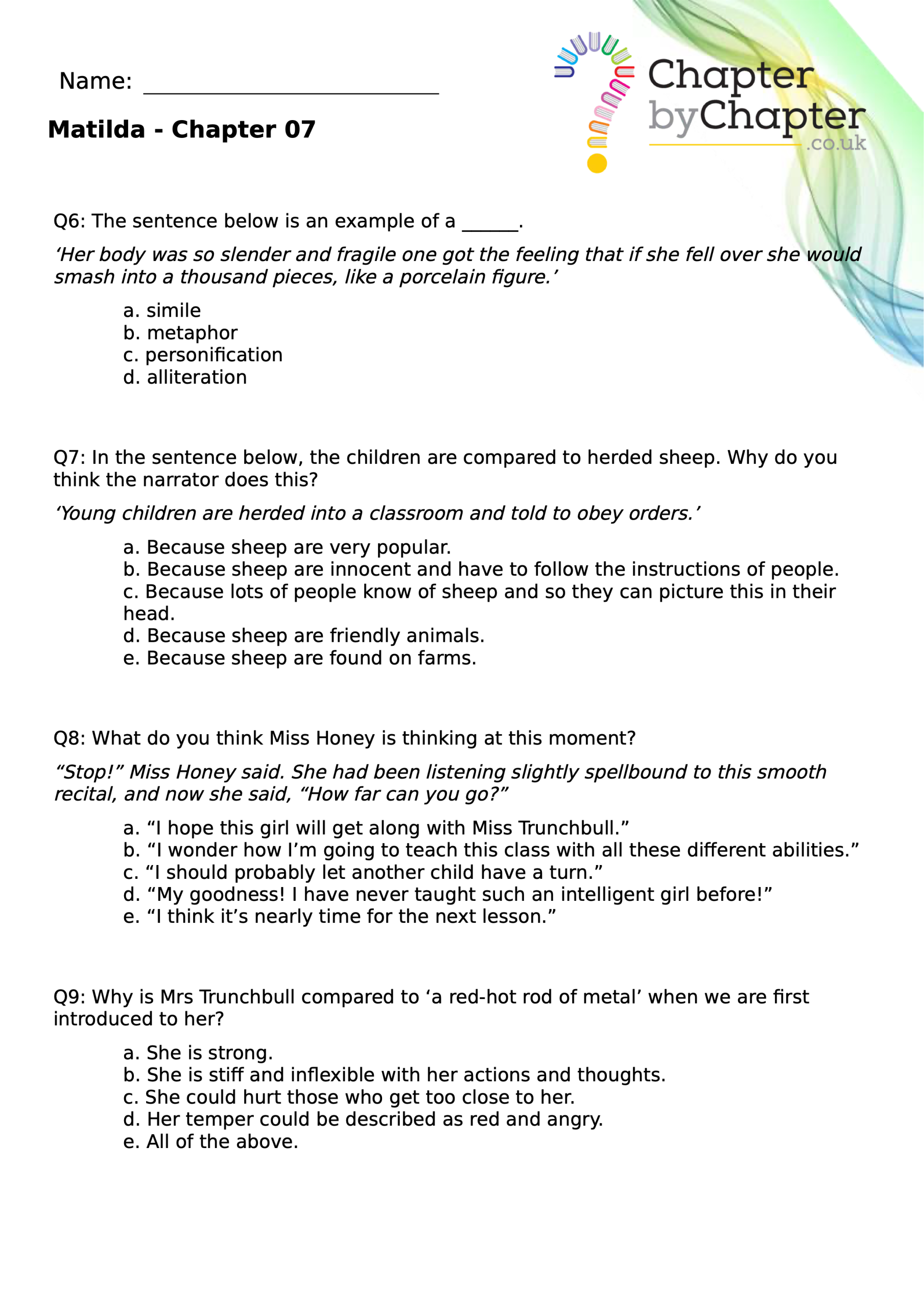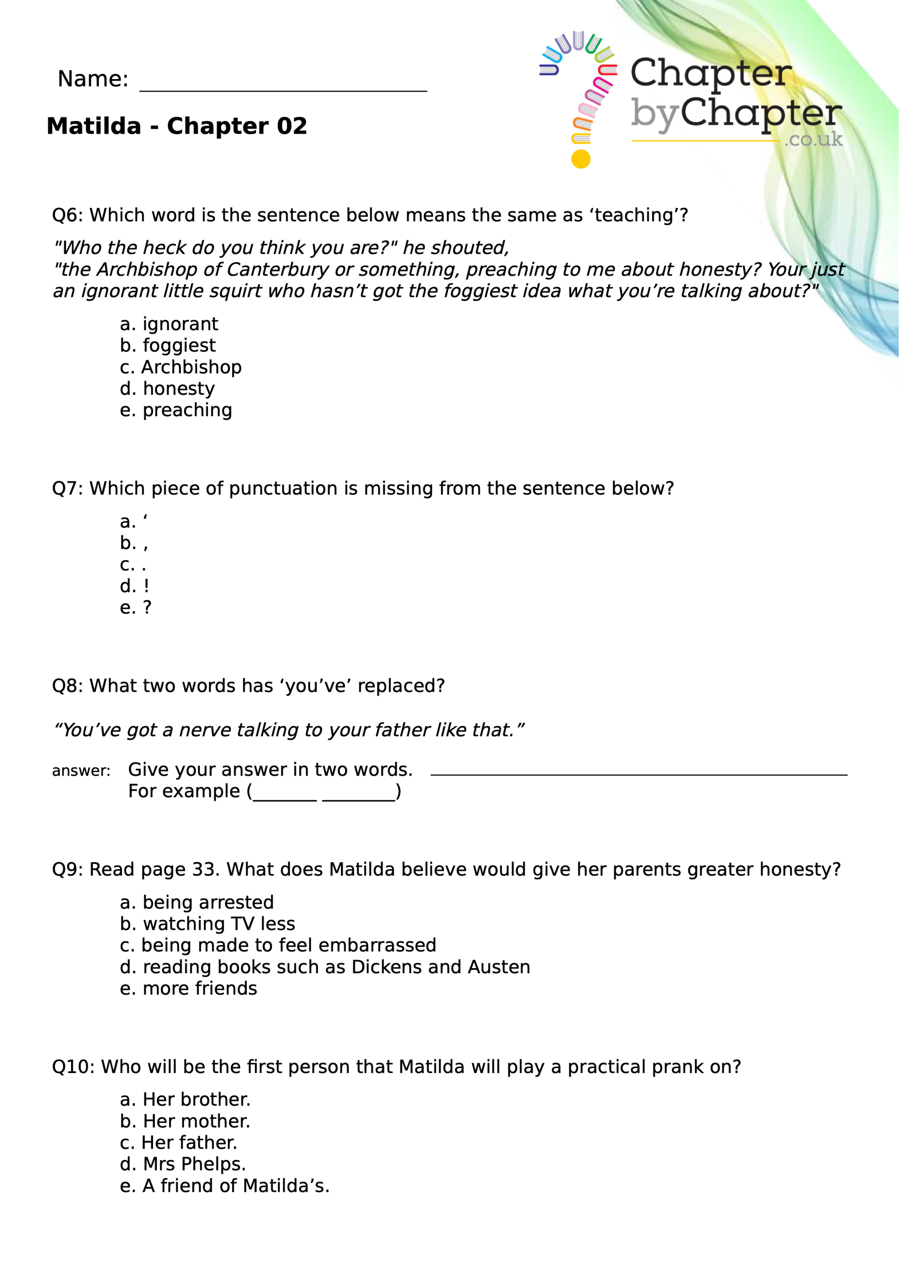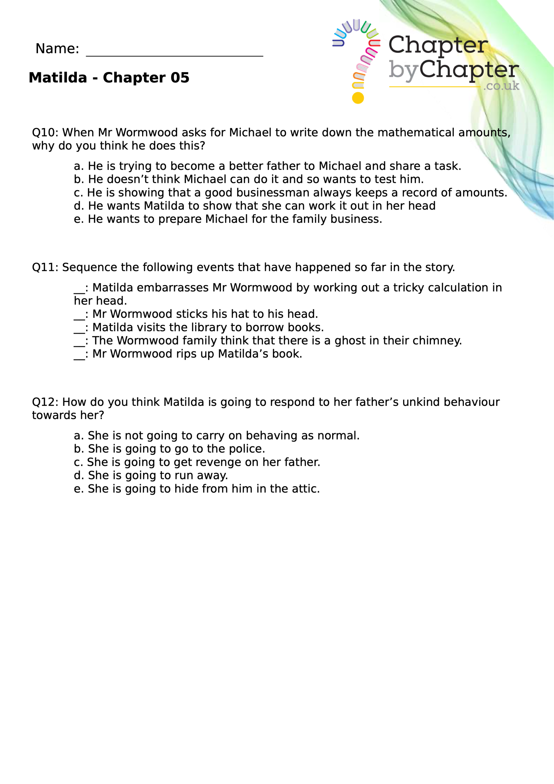 Pupils can practise grammar, punctuation, and spelling in context with our comprehension pack for Matilda from questions 5-8, tied directly to each chapter.