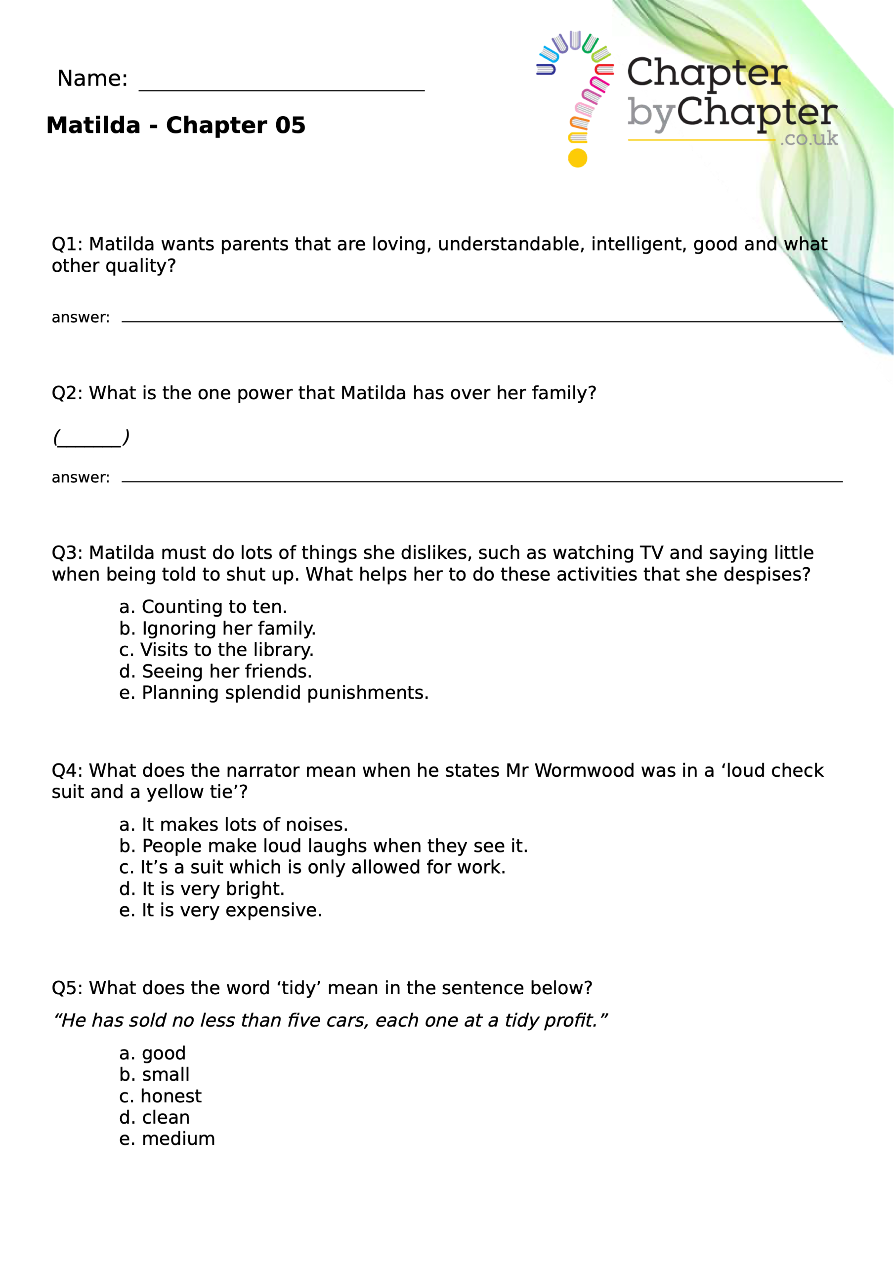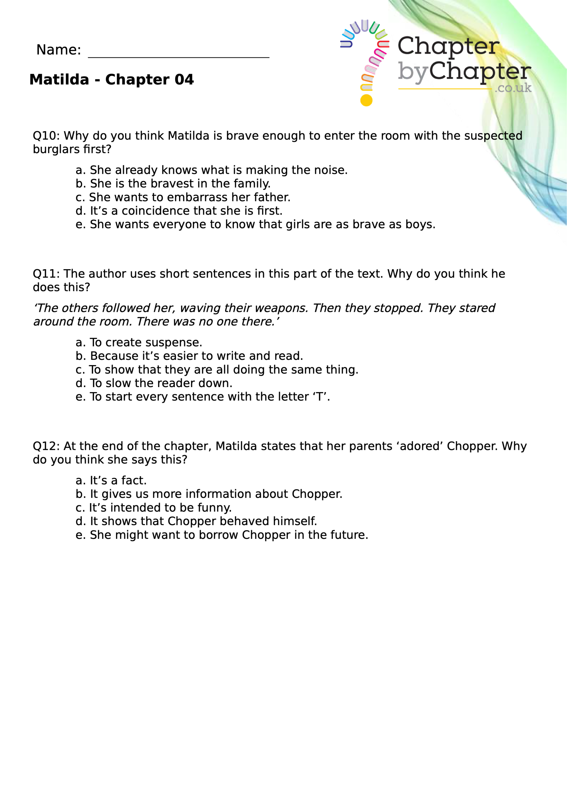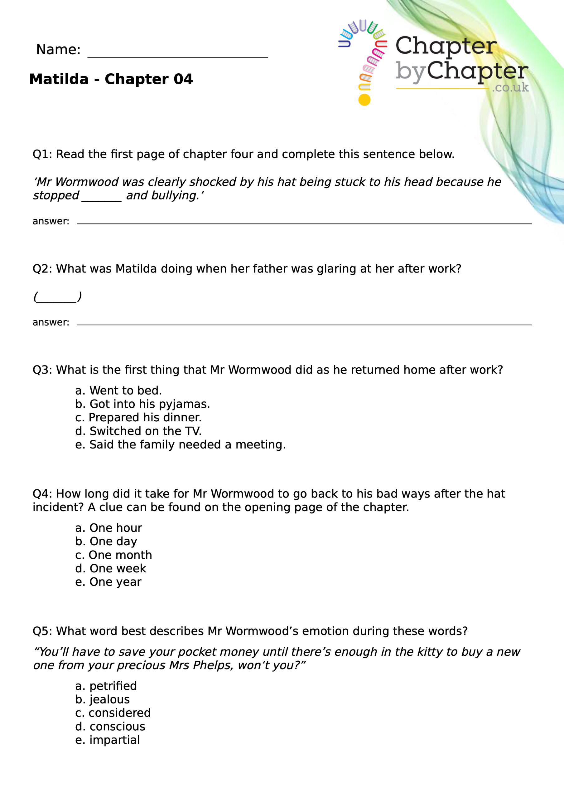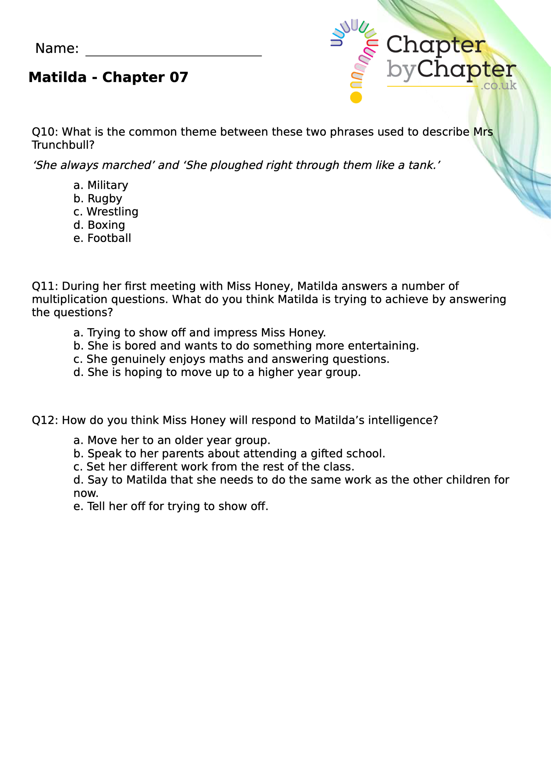 Pupils can practise grammar, punctuation, and spelling in context with our comprehension pack for Matilda from questions 5-8, tied directly to each chapter.