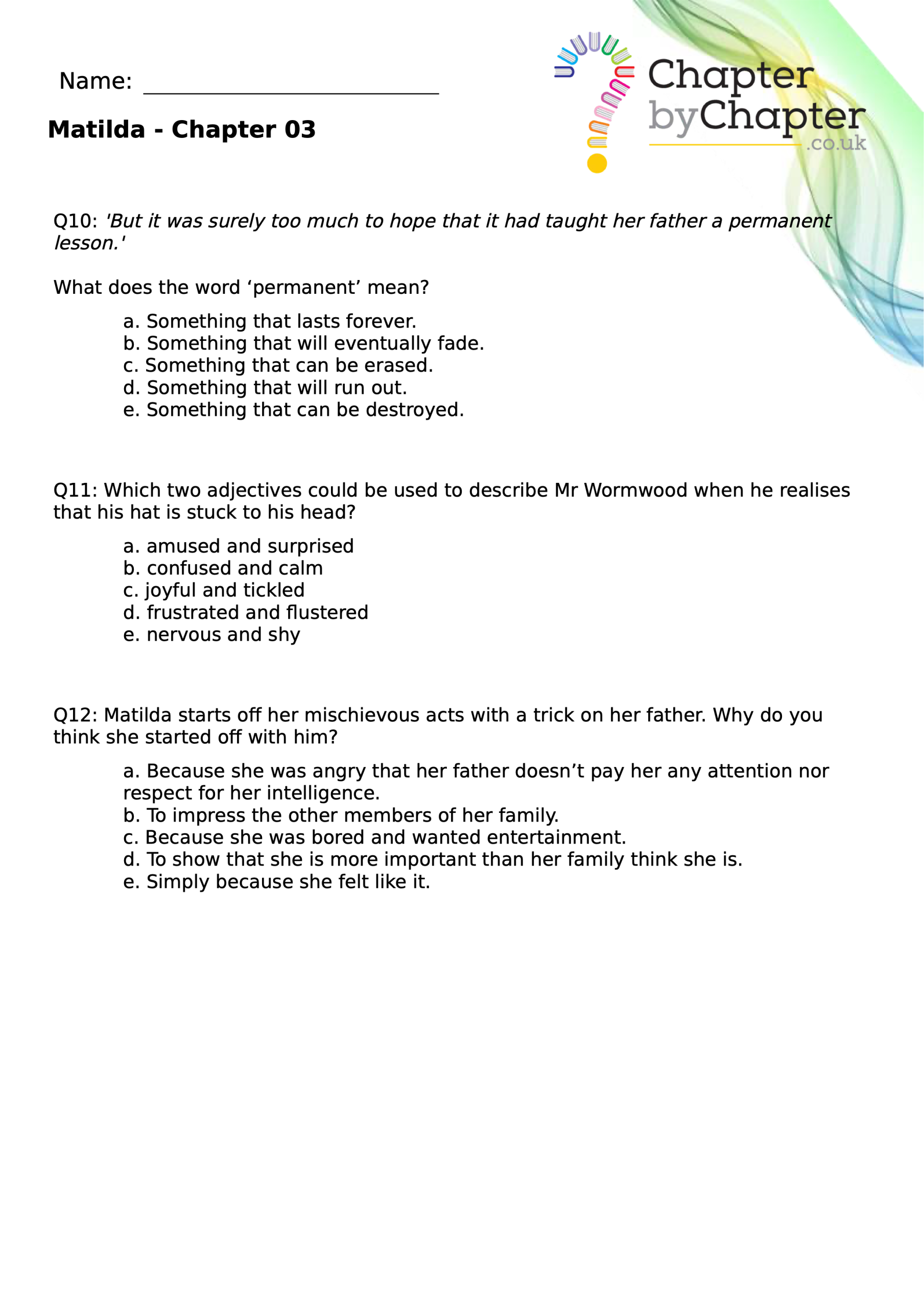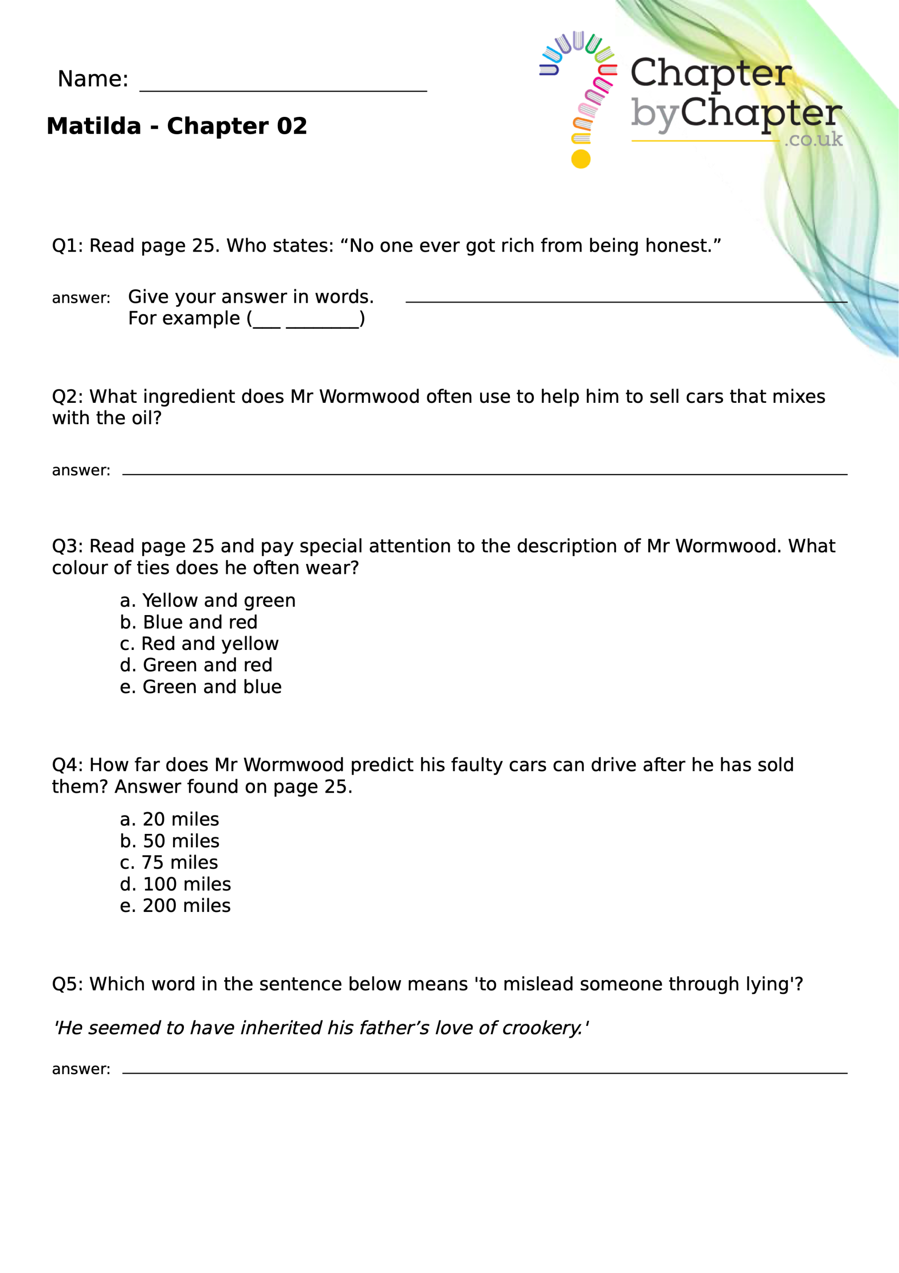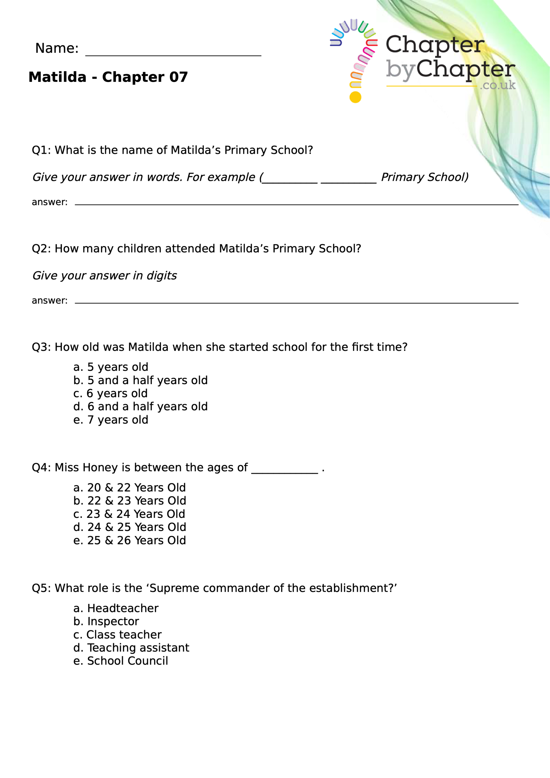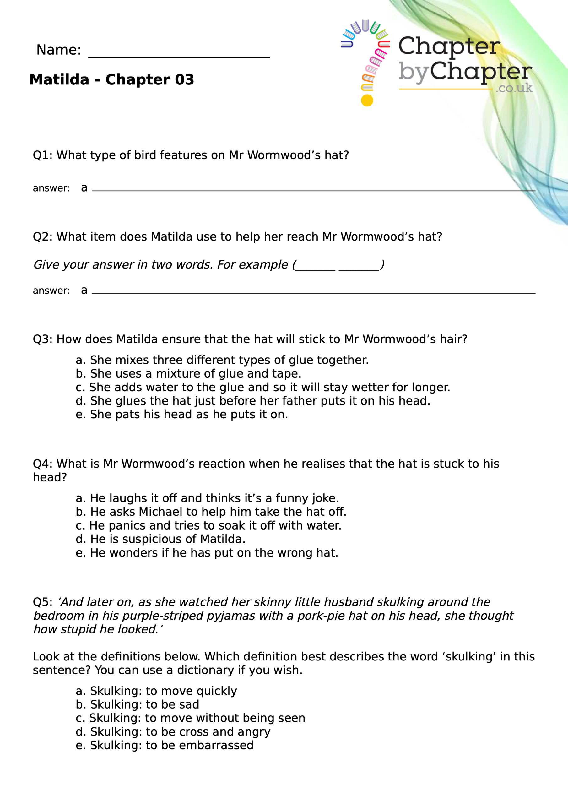 Pupils can practise grammar, punctuation, and spelling in context with our comprehension pack for Matilda from questions 5-8, tied directly to each chapter.