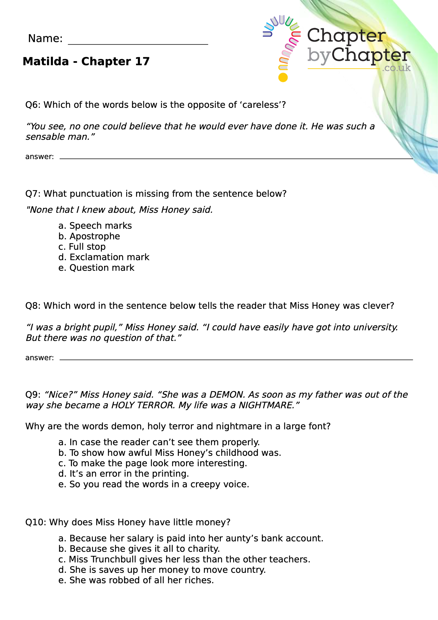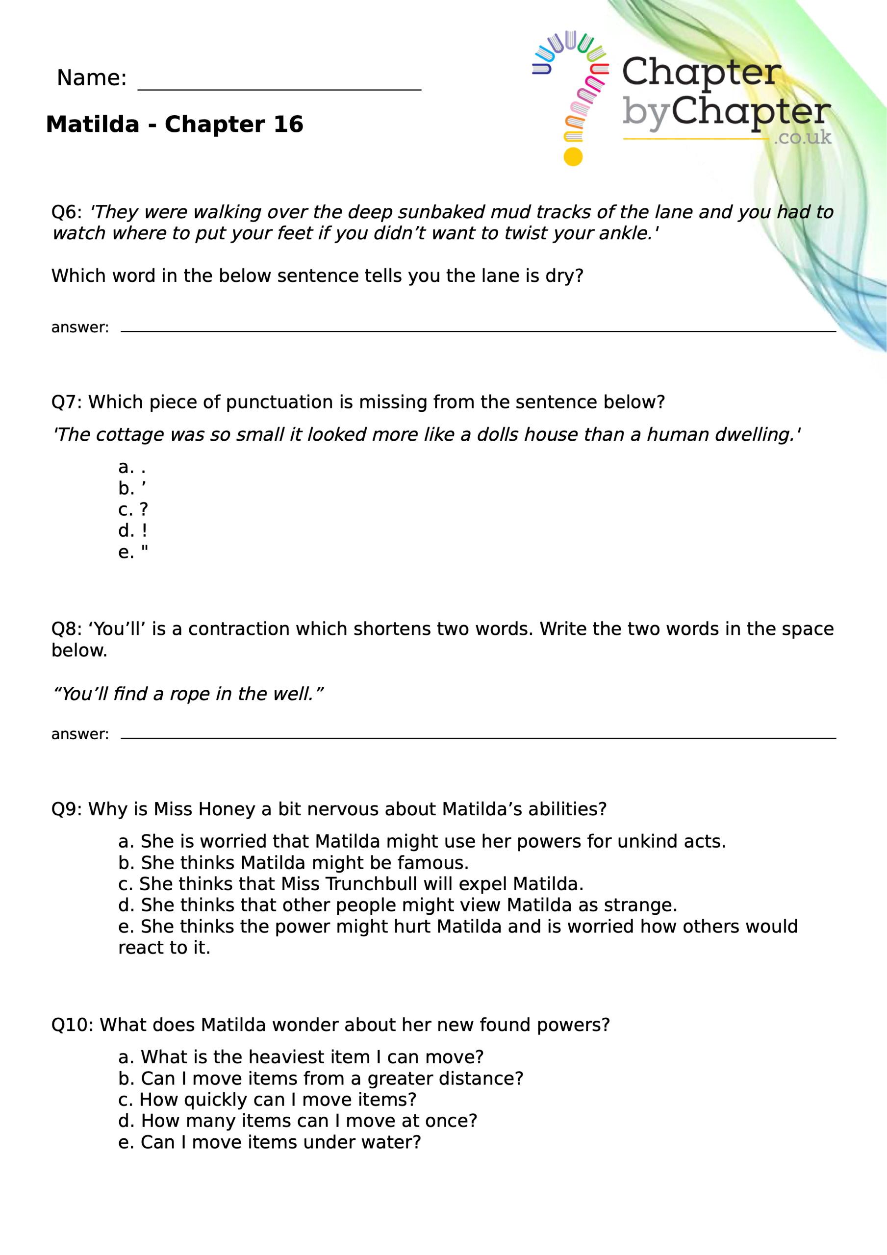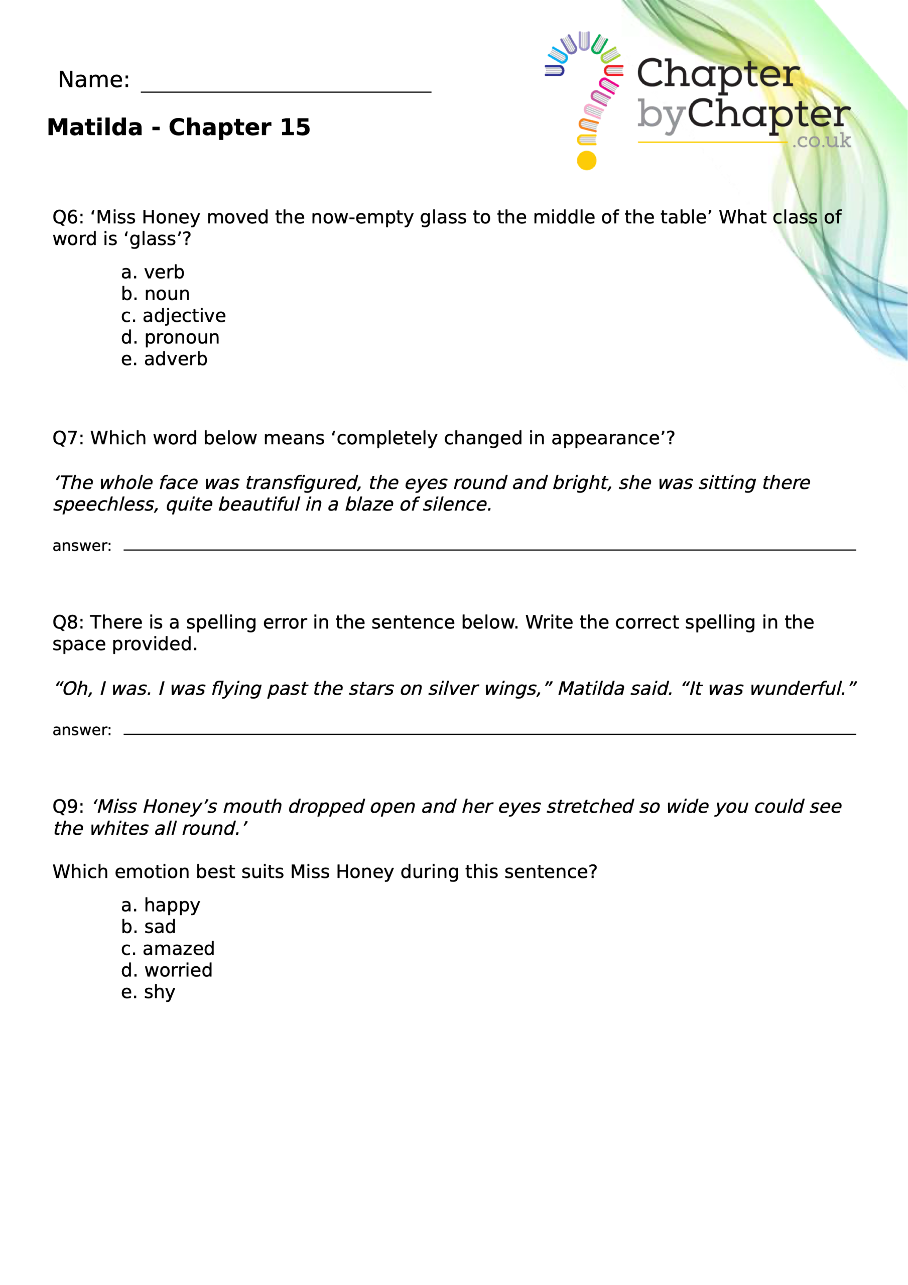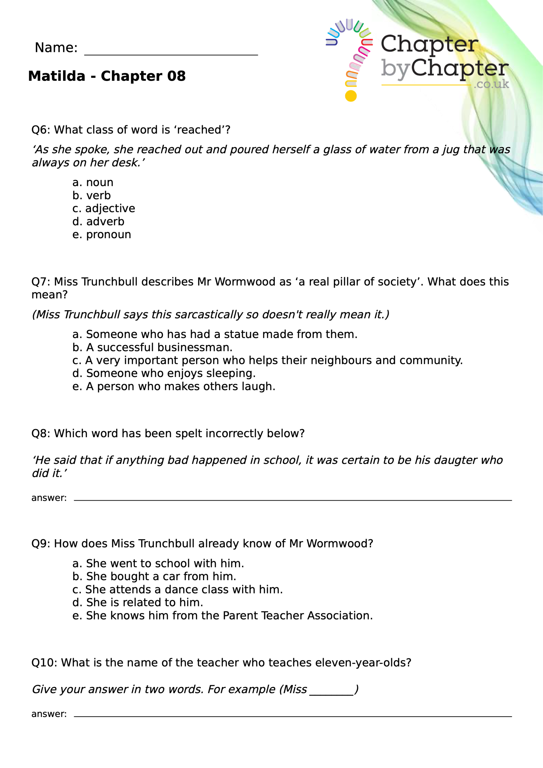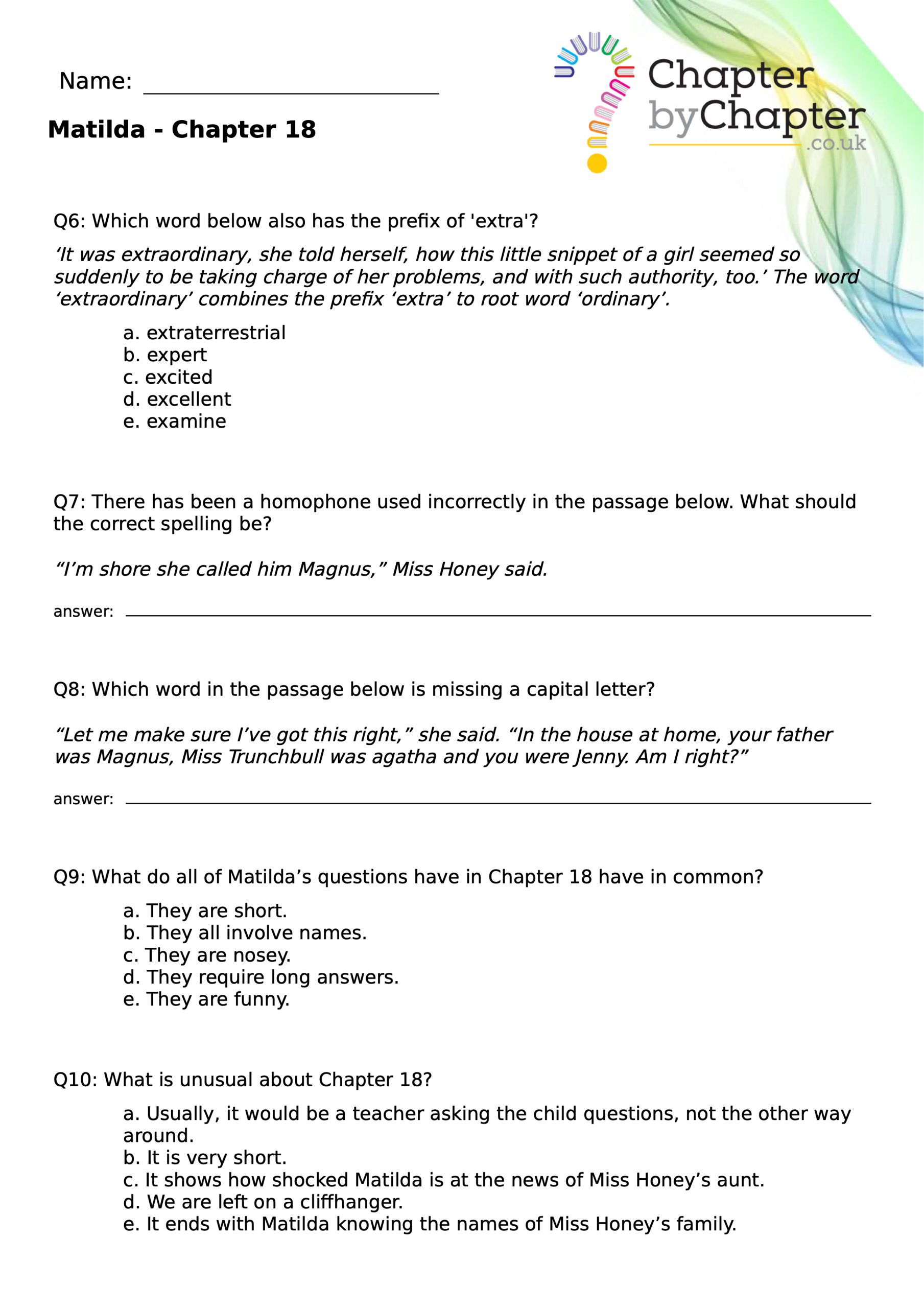 With chapter-by-chapter questions for Matilda, our worksheets help pupils practise comprehension, grammar, spelling, and punctuation all in one place.