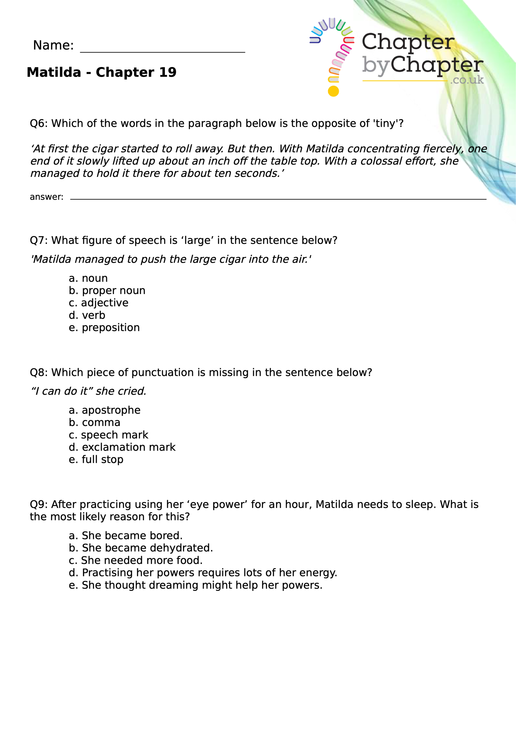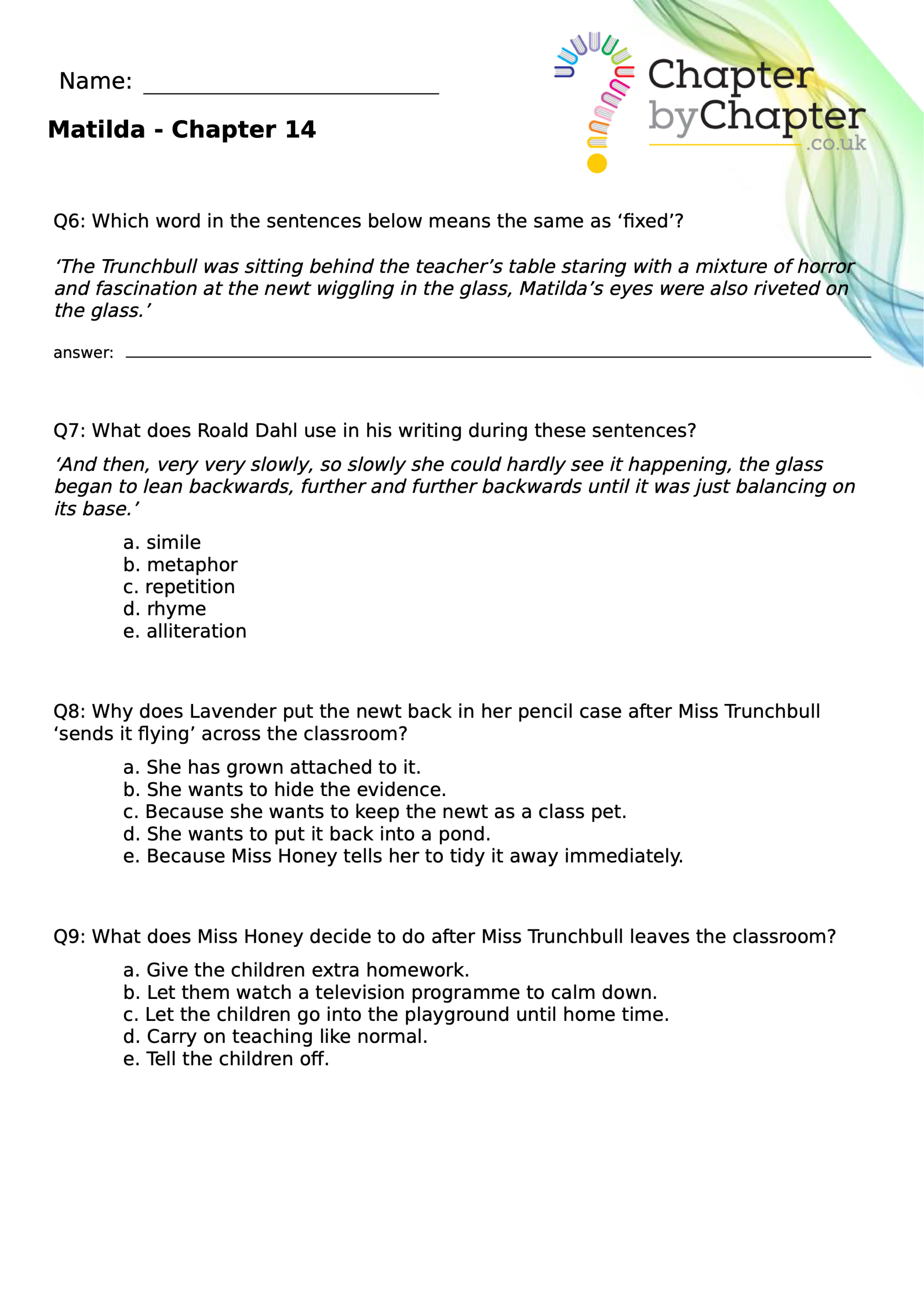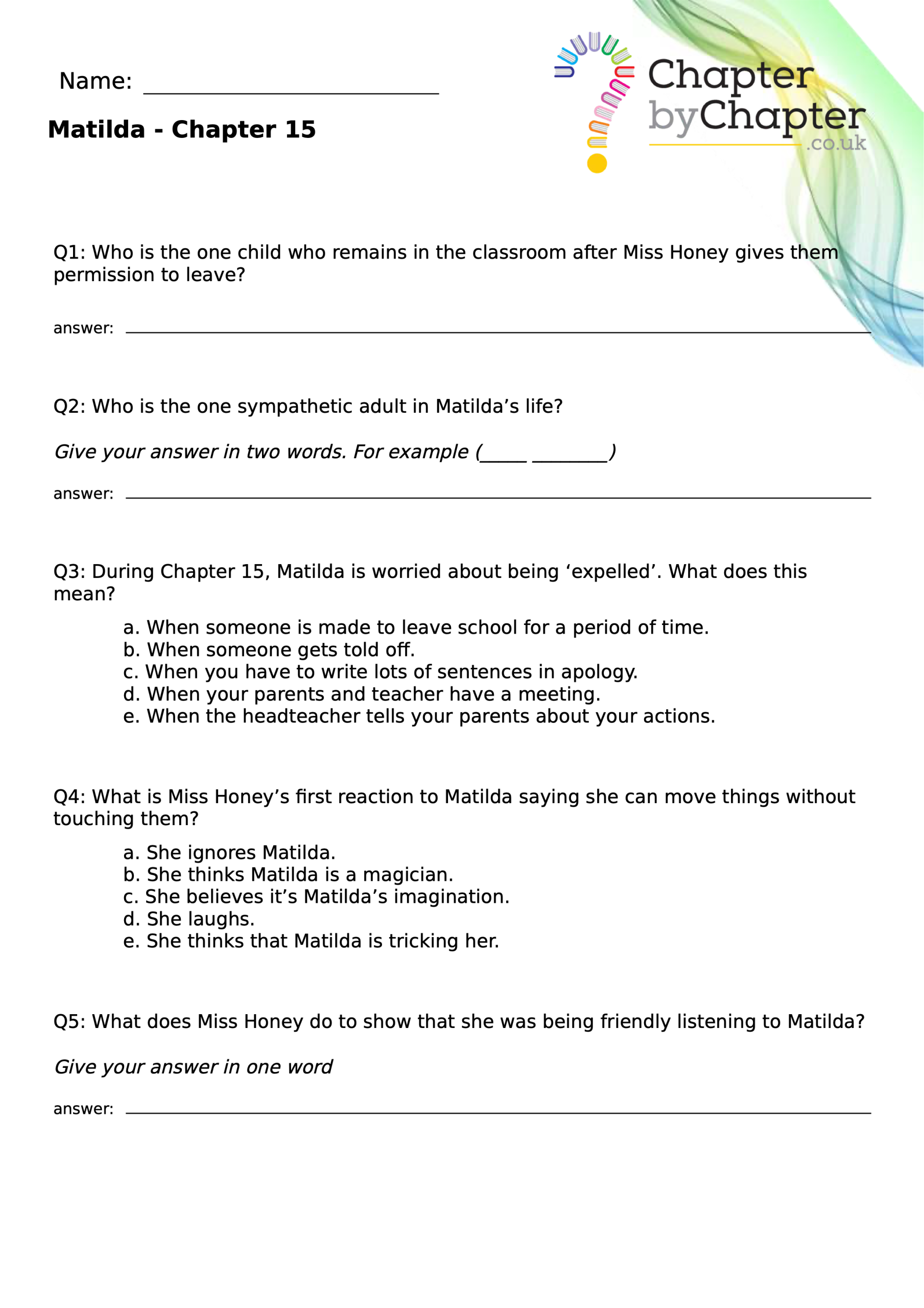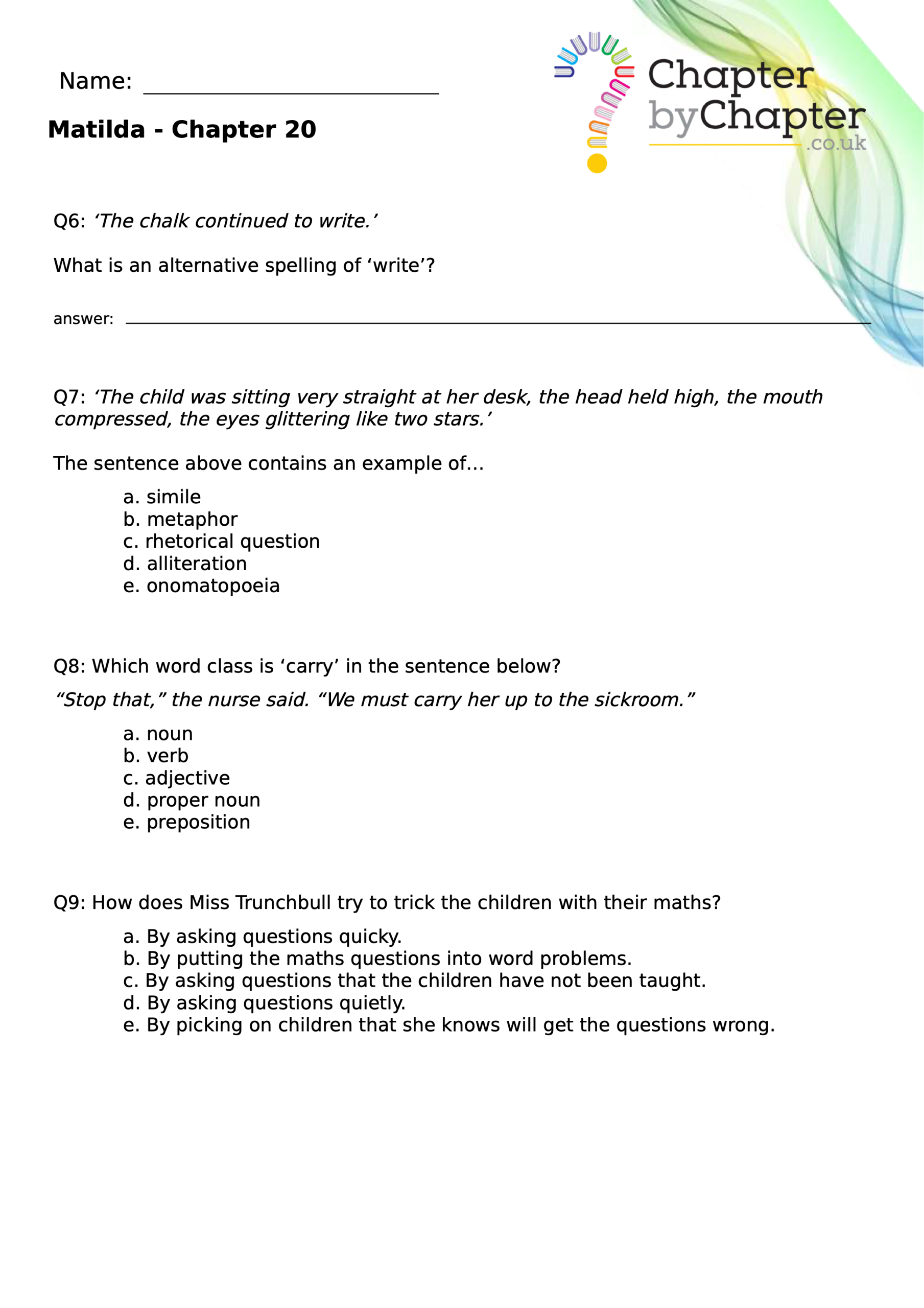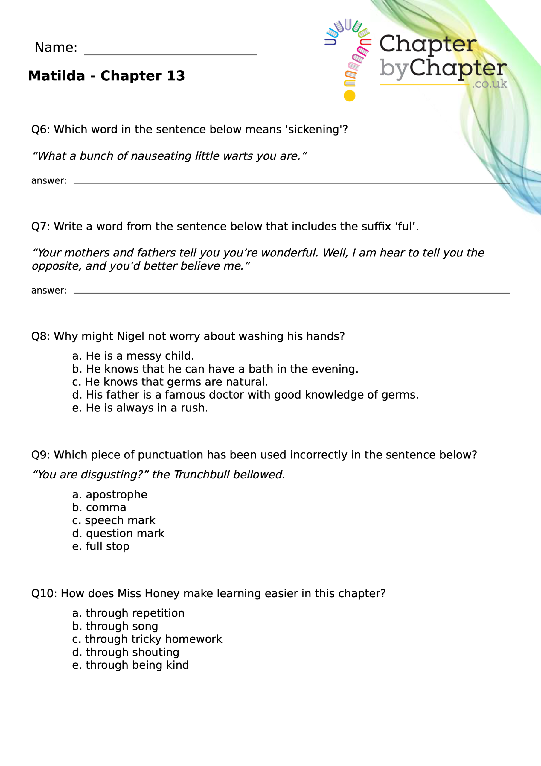 With chapter-by-chapter questions for Matilda, our worksheets help pupils practise comprehension, grammar, spelling, and punctuation all in one place.