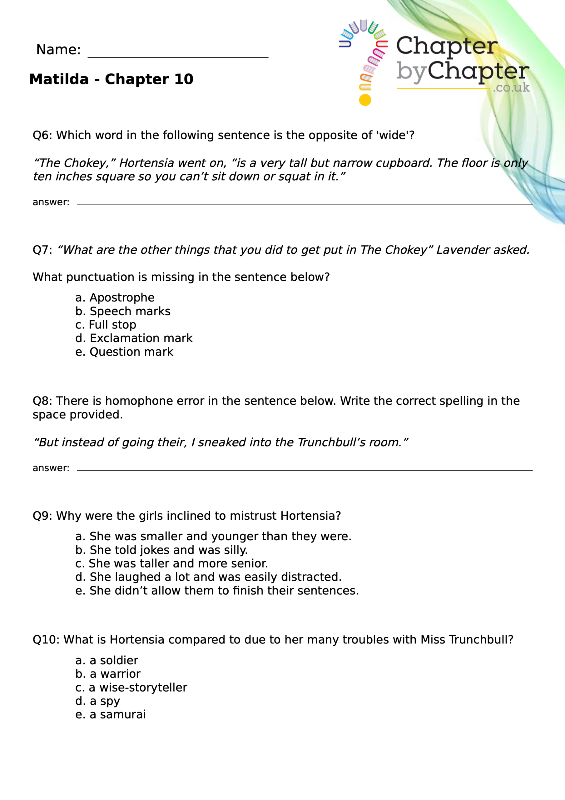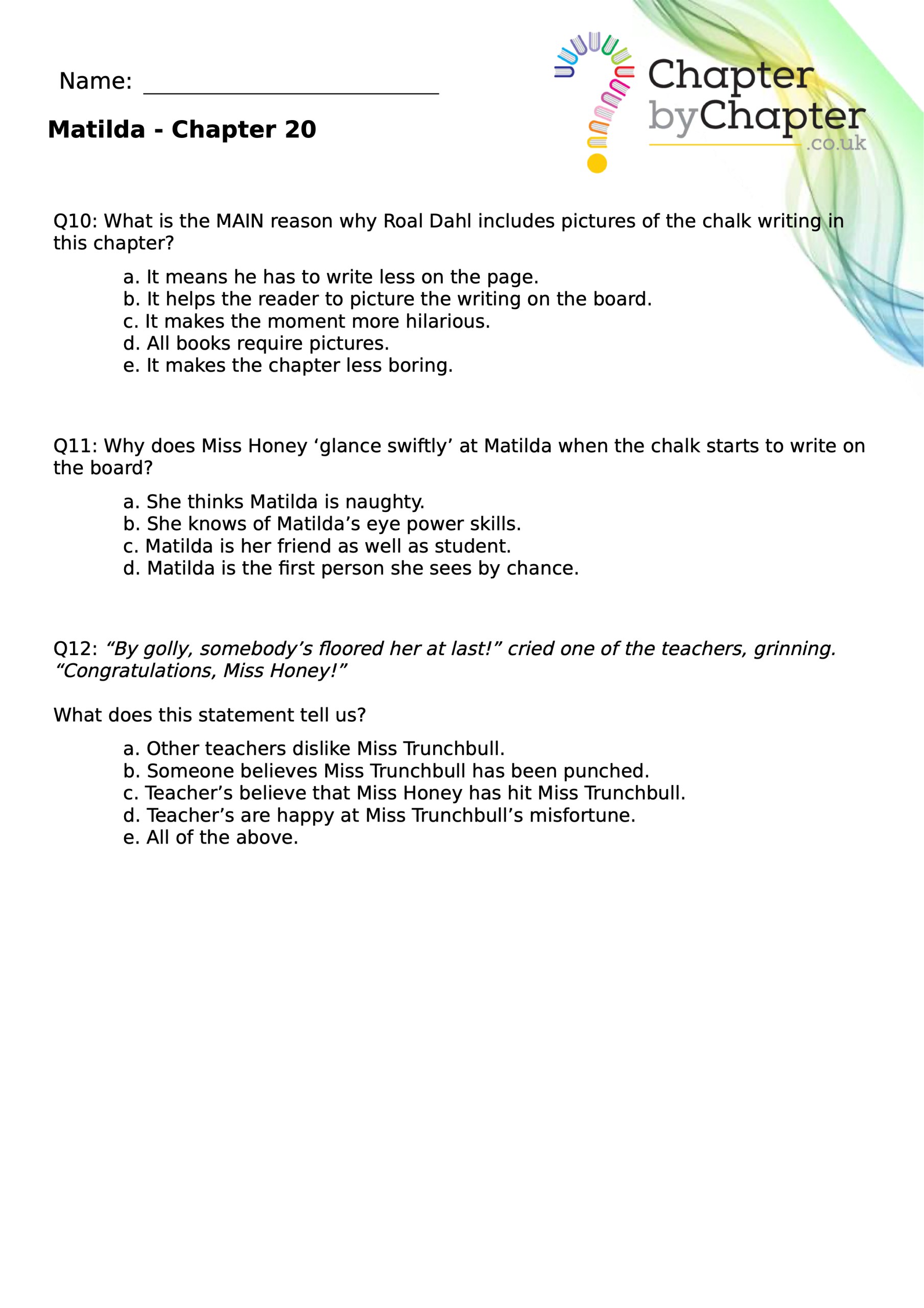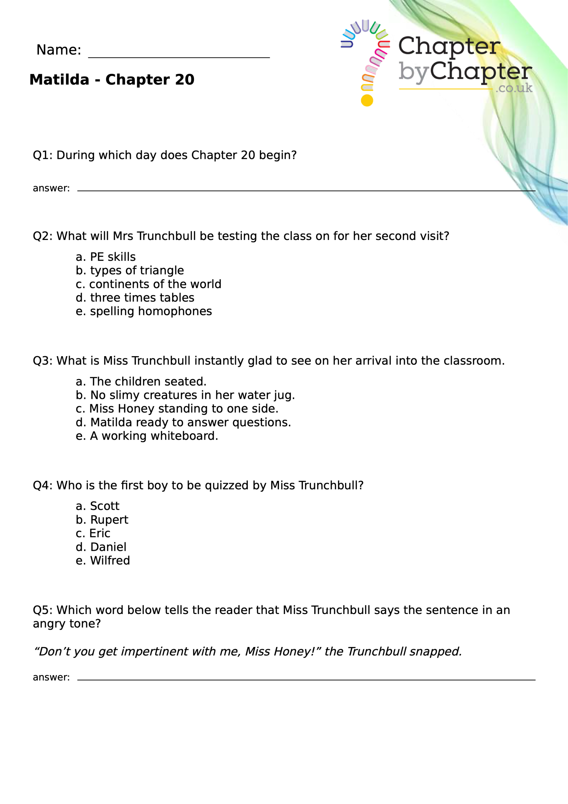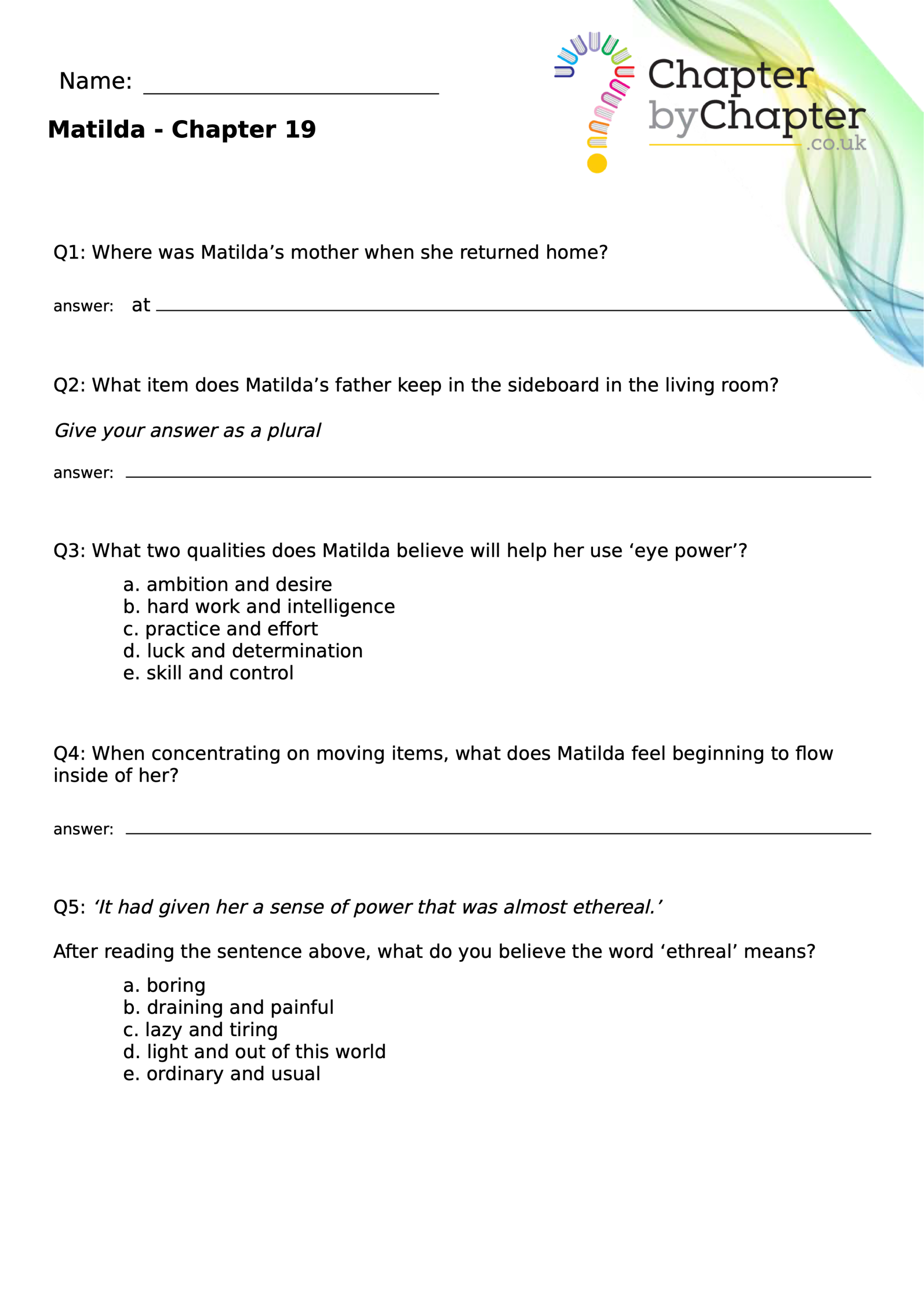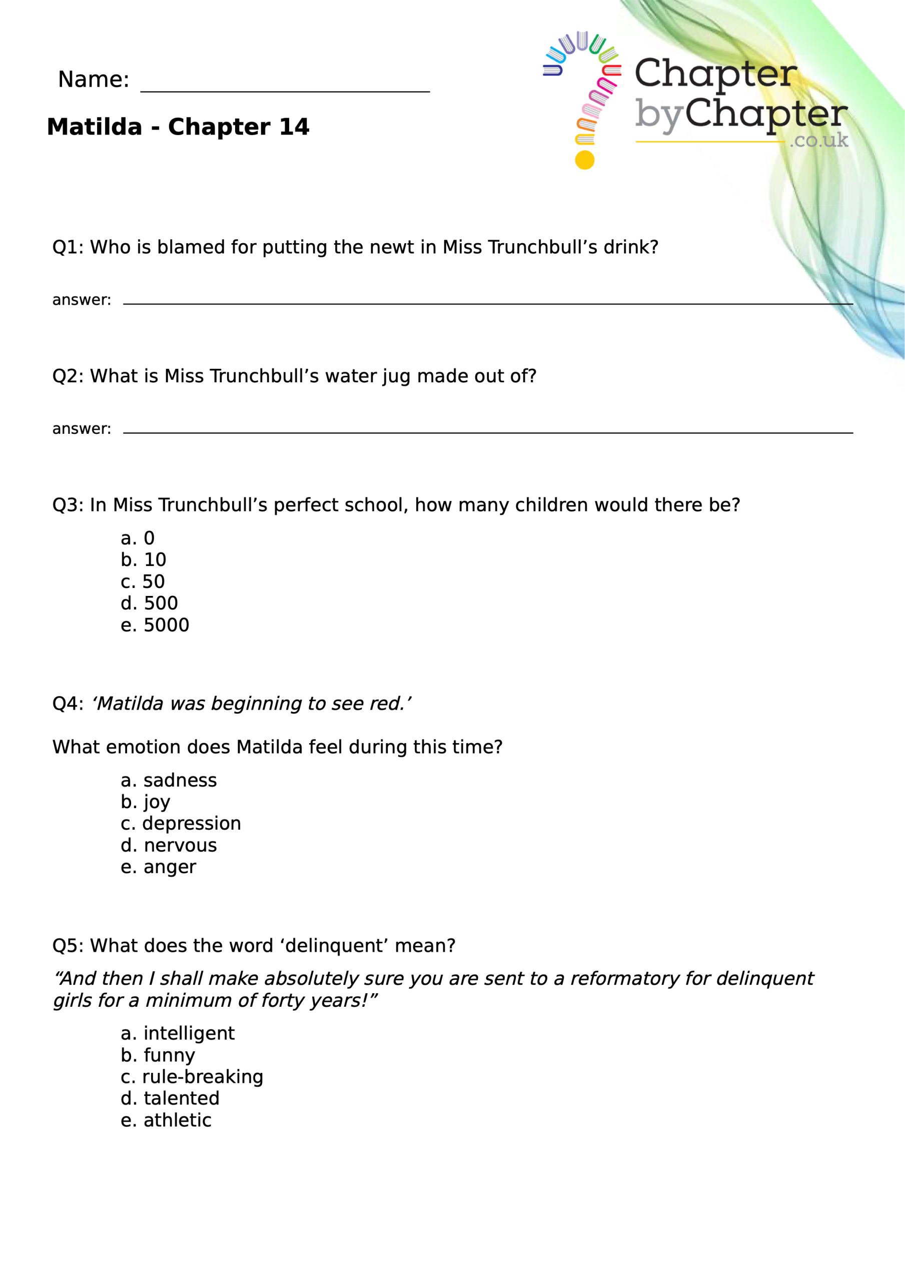 With chapter-by-chapter questions for Matilda, our worksheets help pupils practise comprehension, grammar, spelling, and punctuation all in one place.