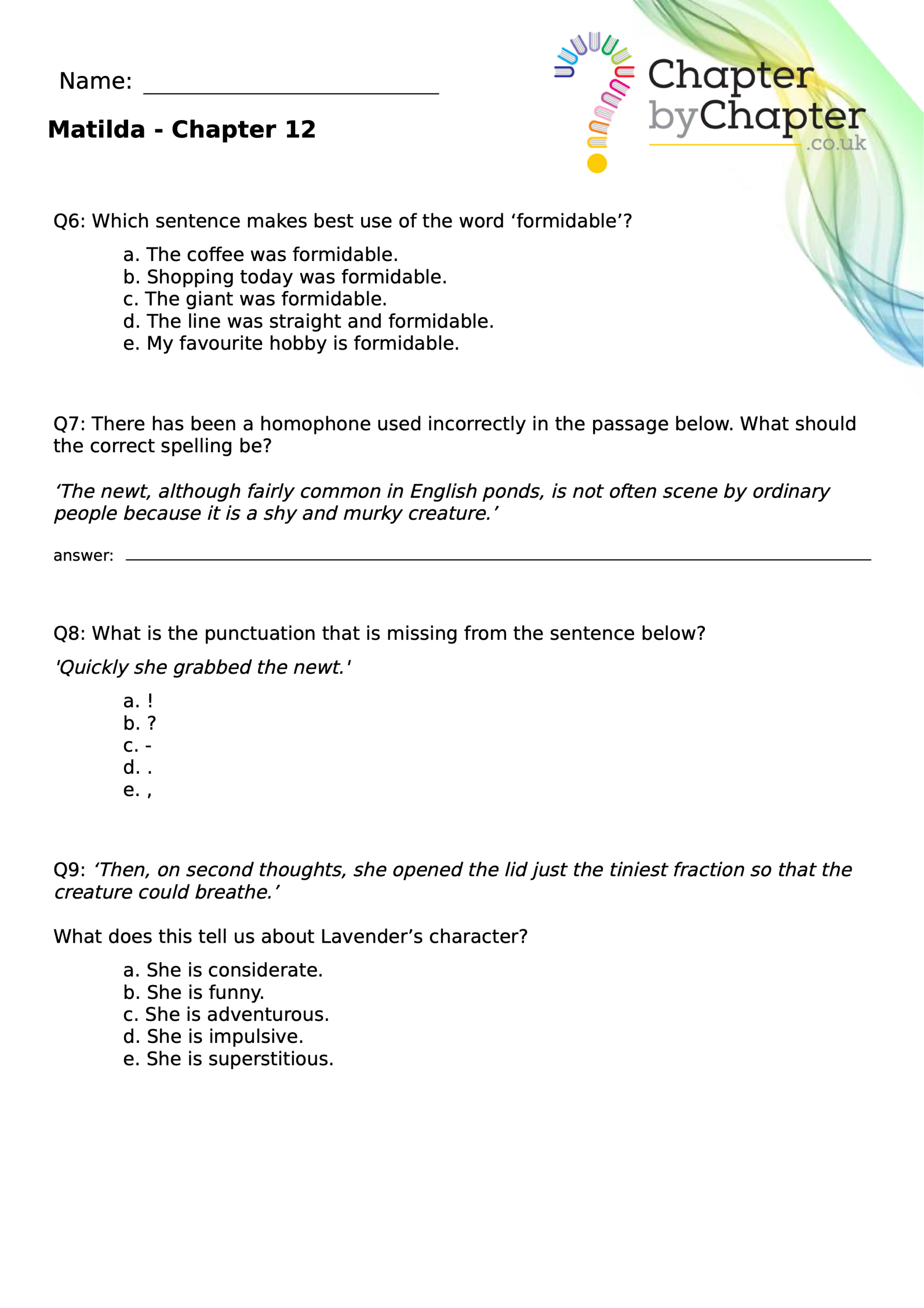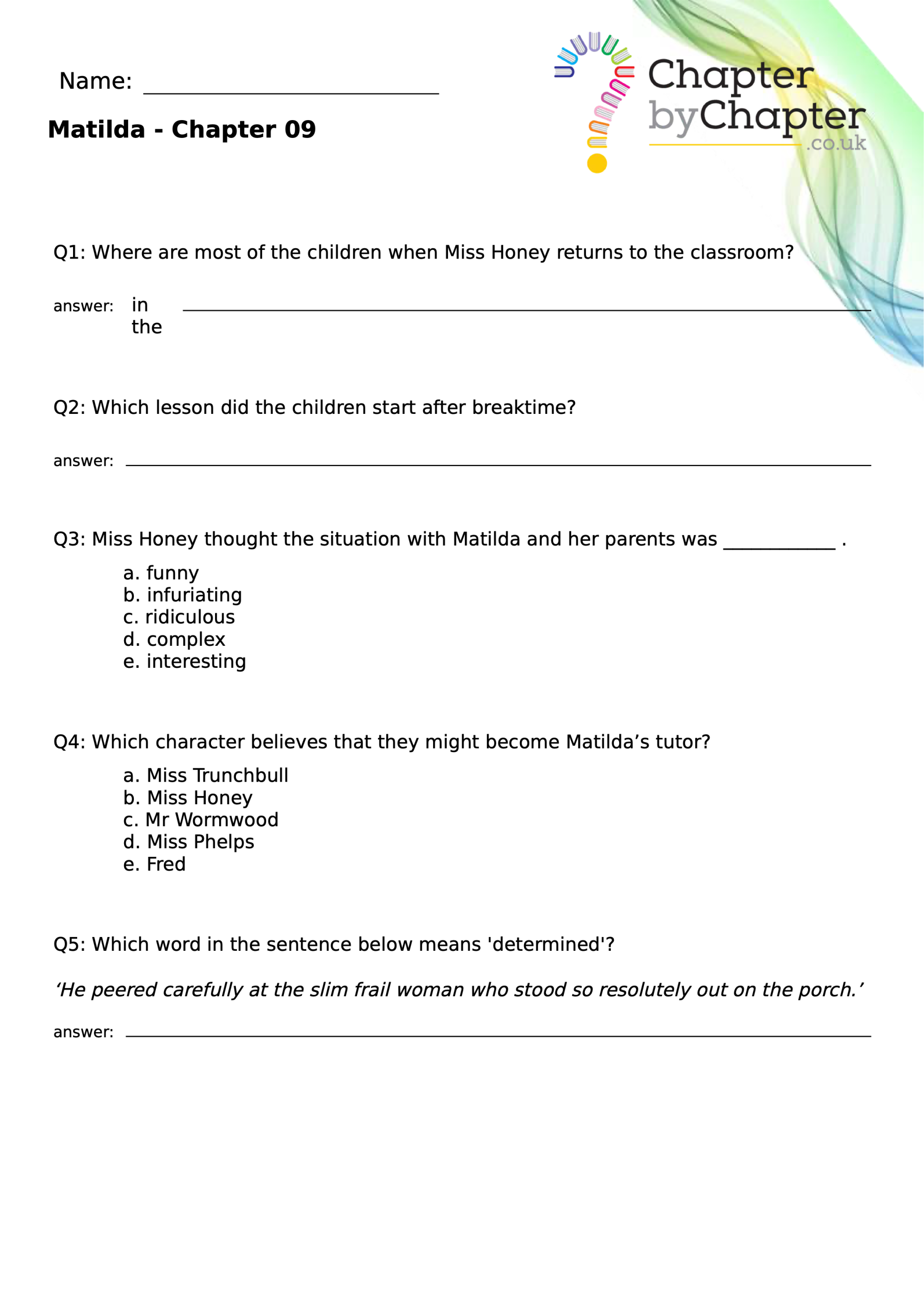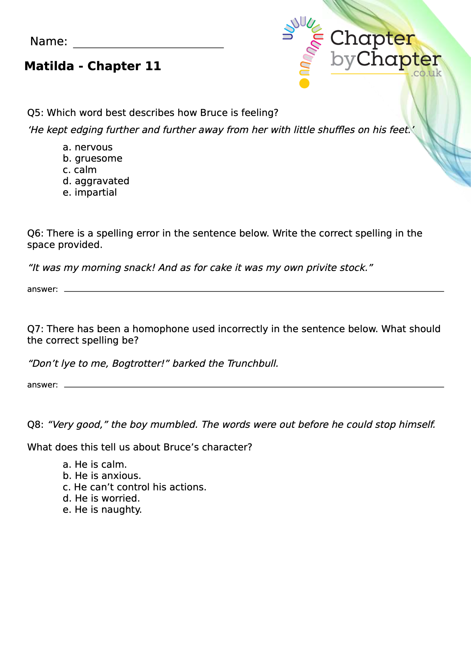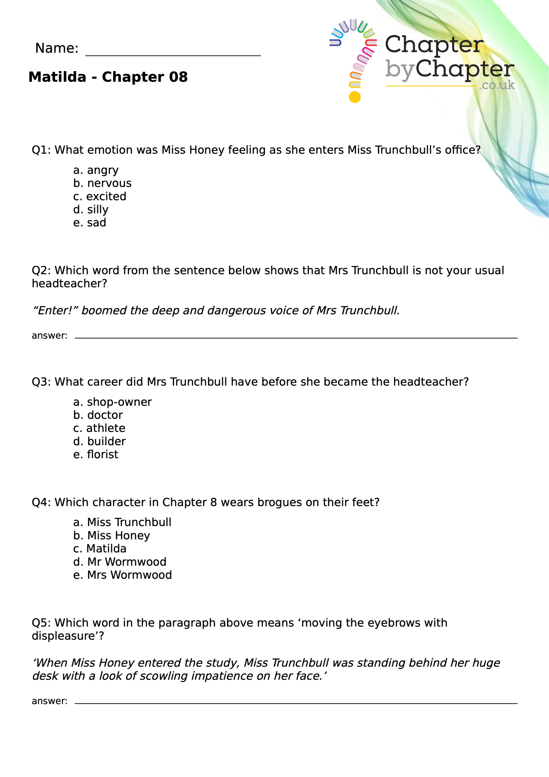 With chapter-by-chapter questions for Matilda, our worksheets help pupils practise comprehension, grammar, spelling, and punctuation all in one place.
