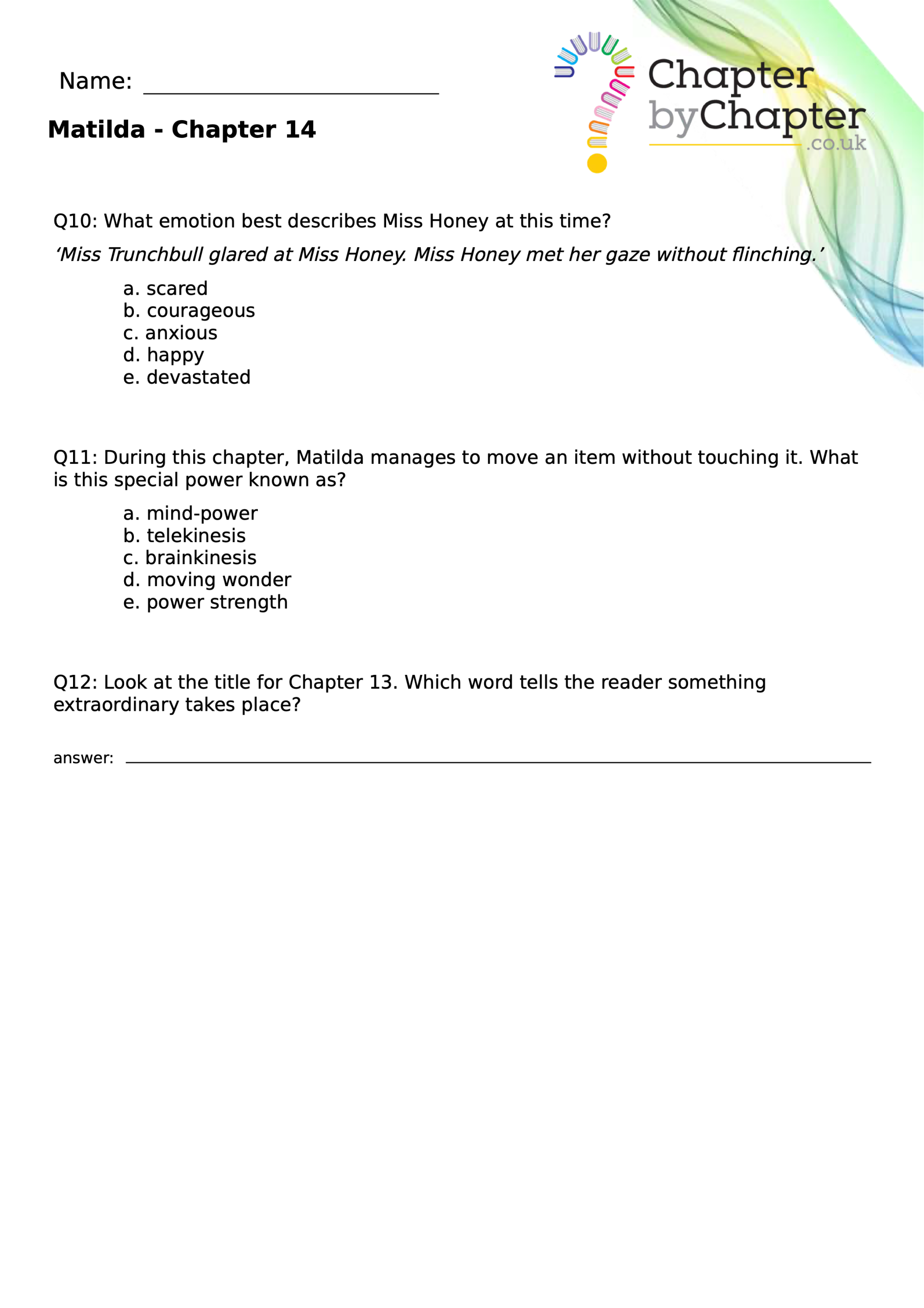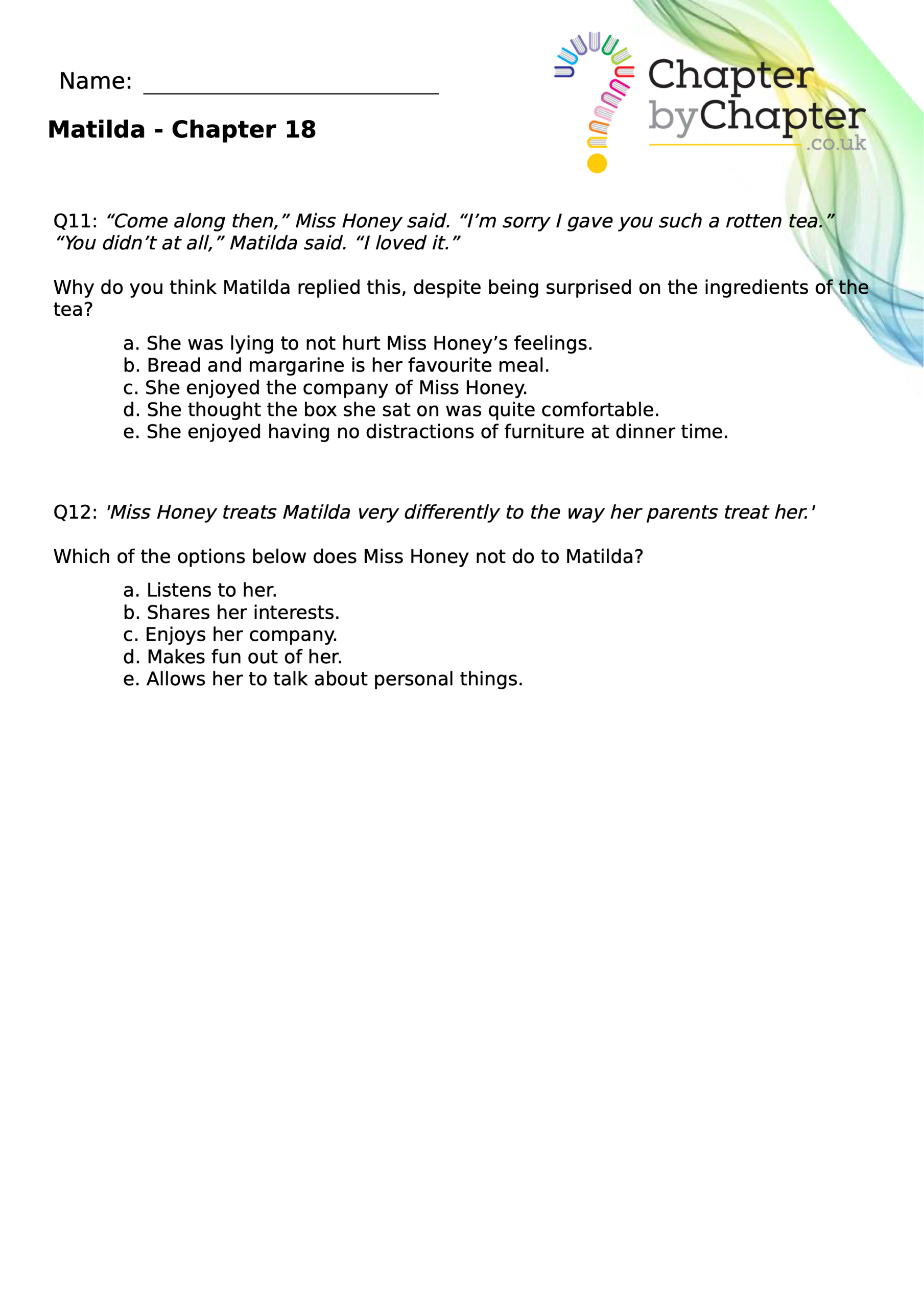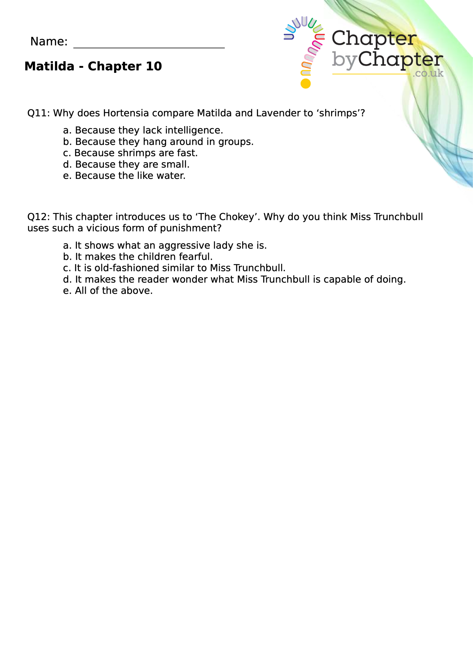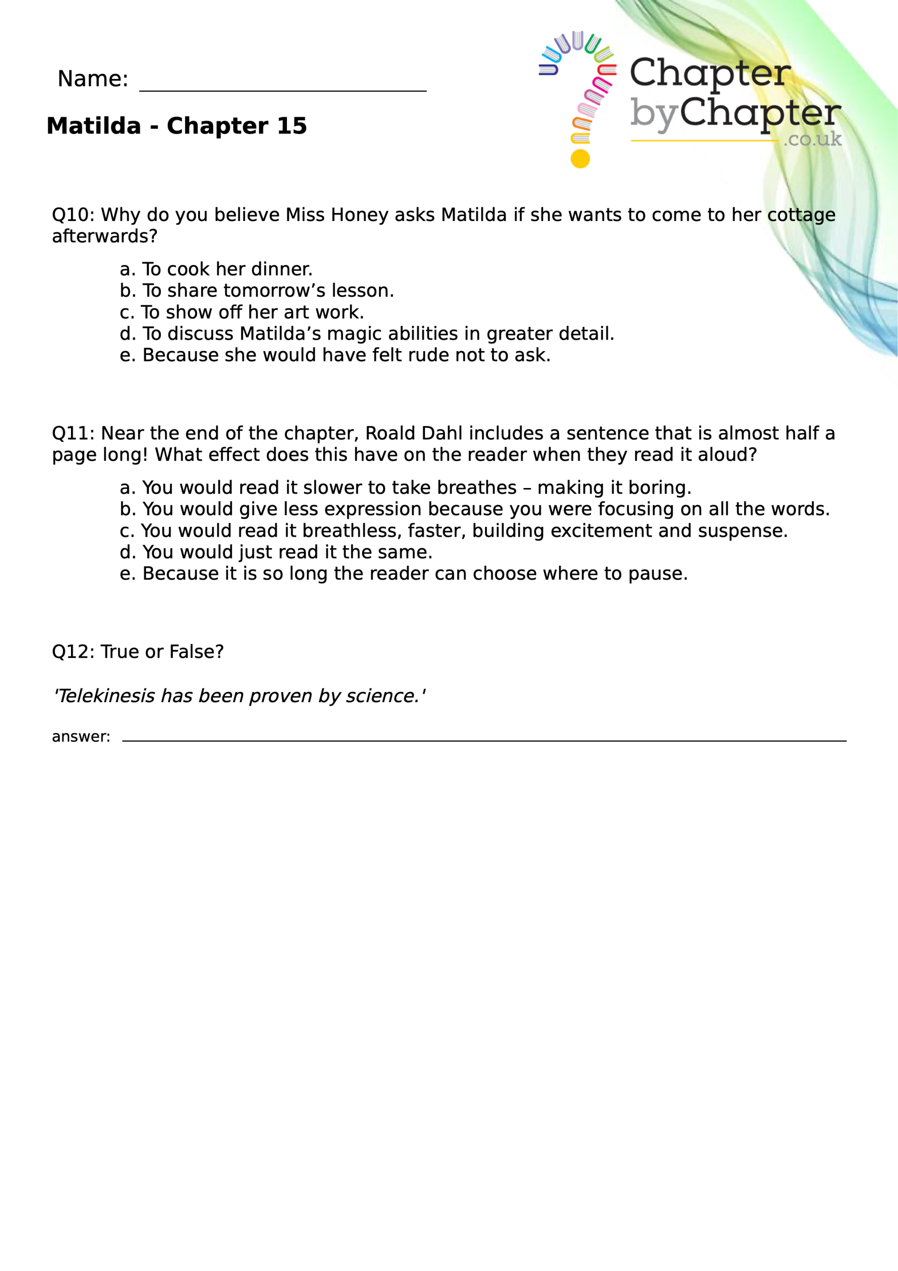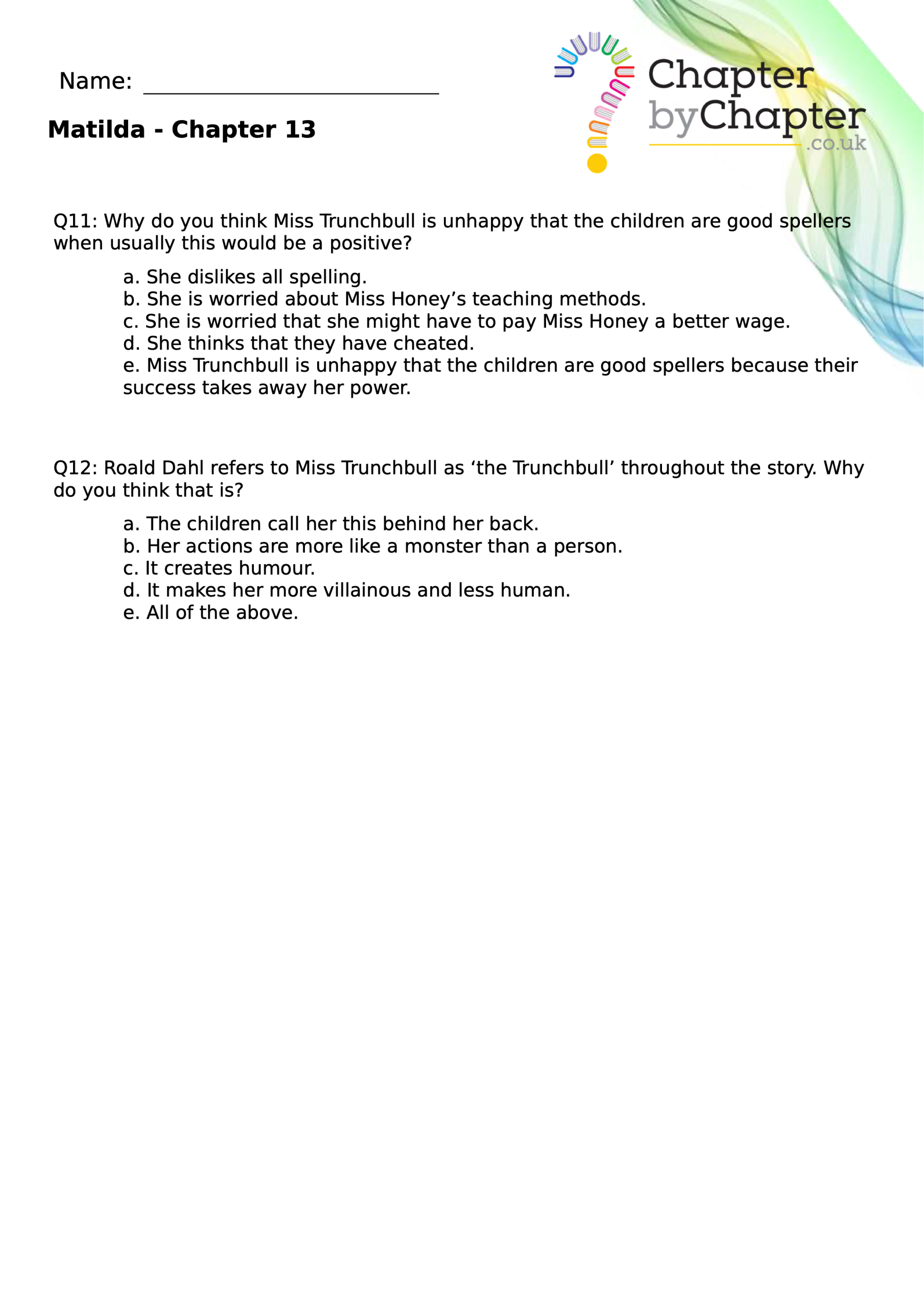 With chapter-by-chapter questions for Matilda, our worksheets help pupils practise comprehension, grammar, spelling, and punctuation all in one place.