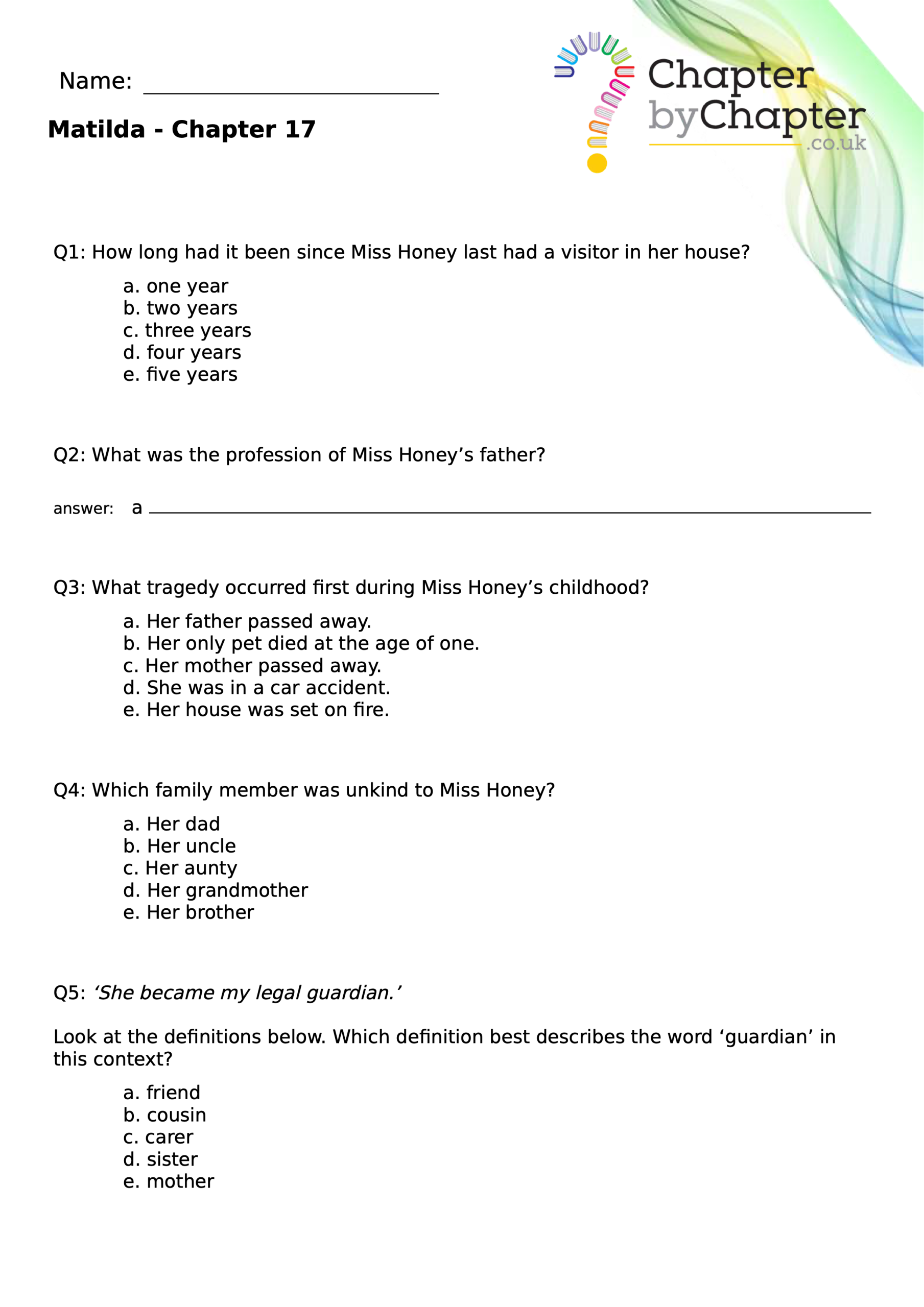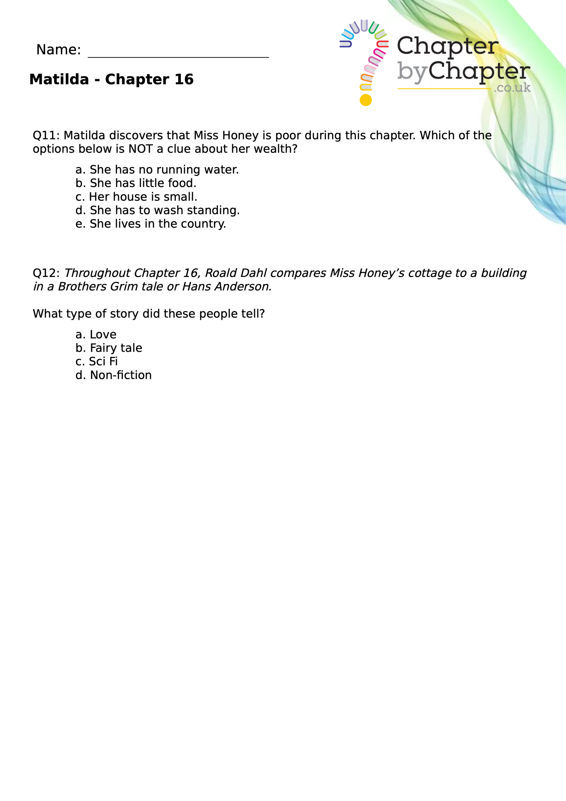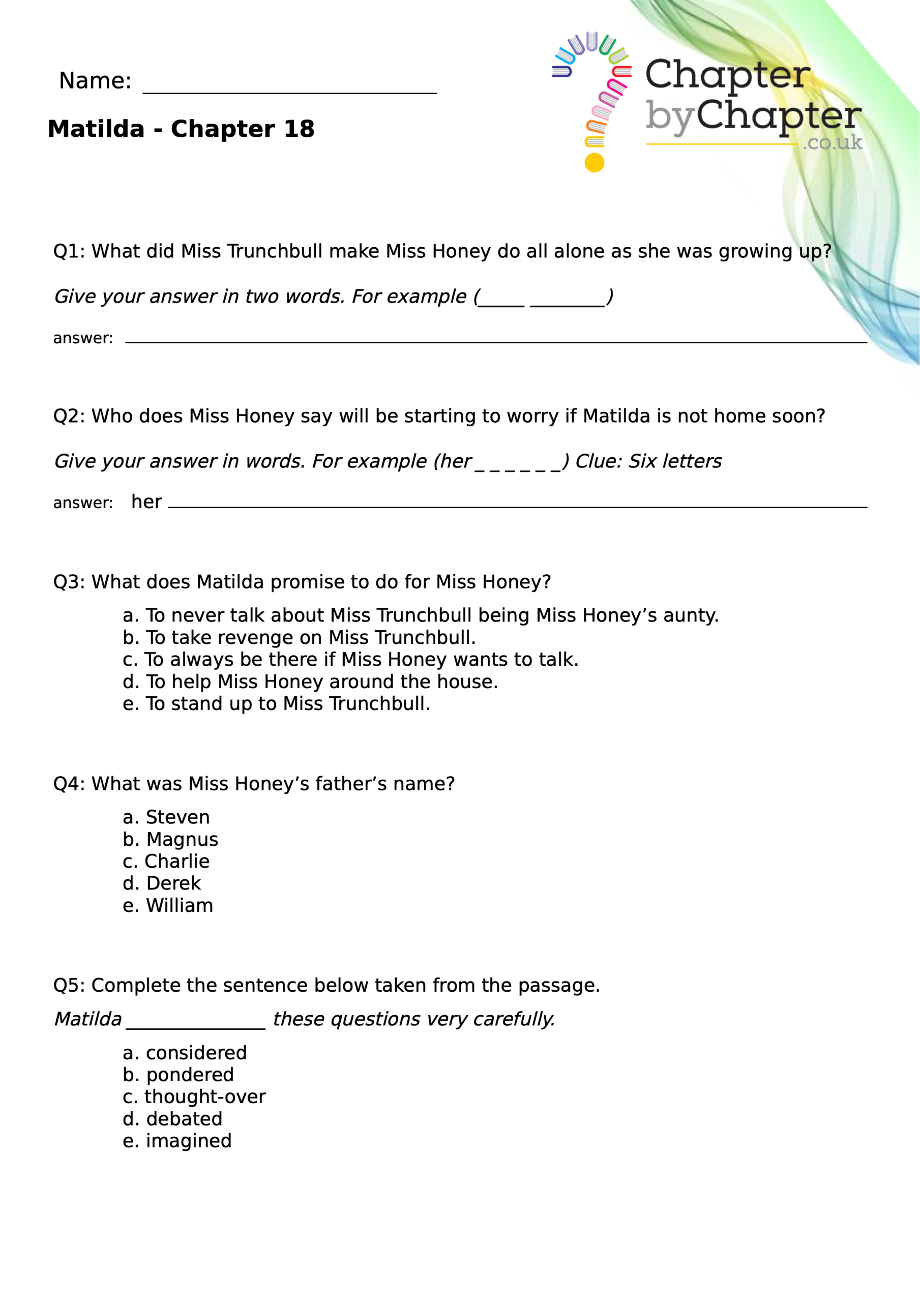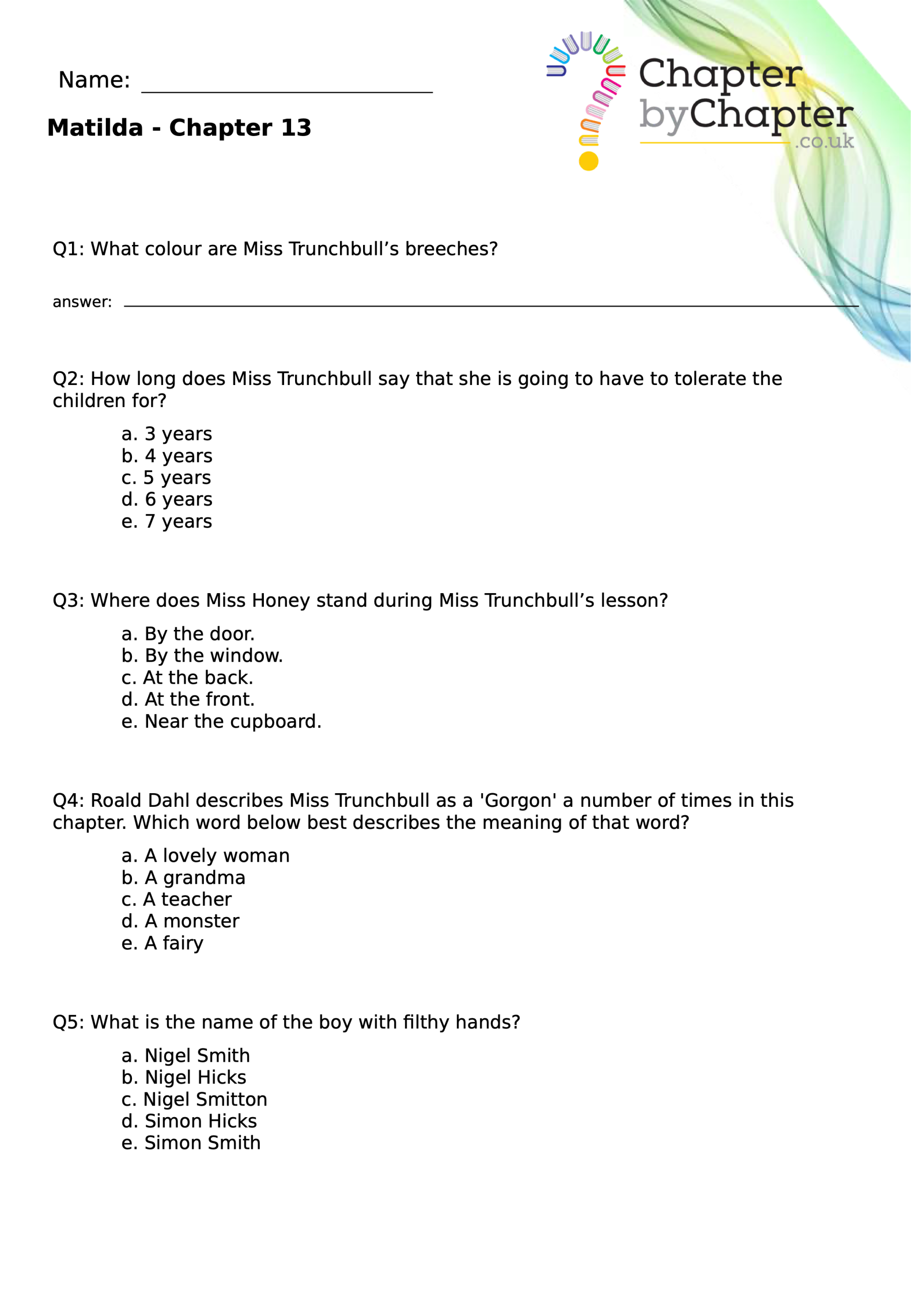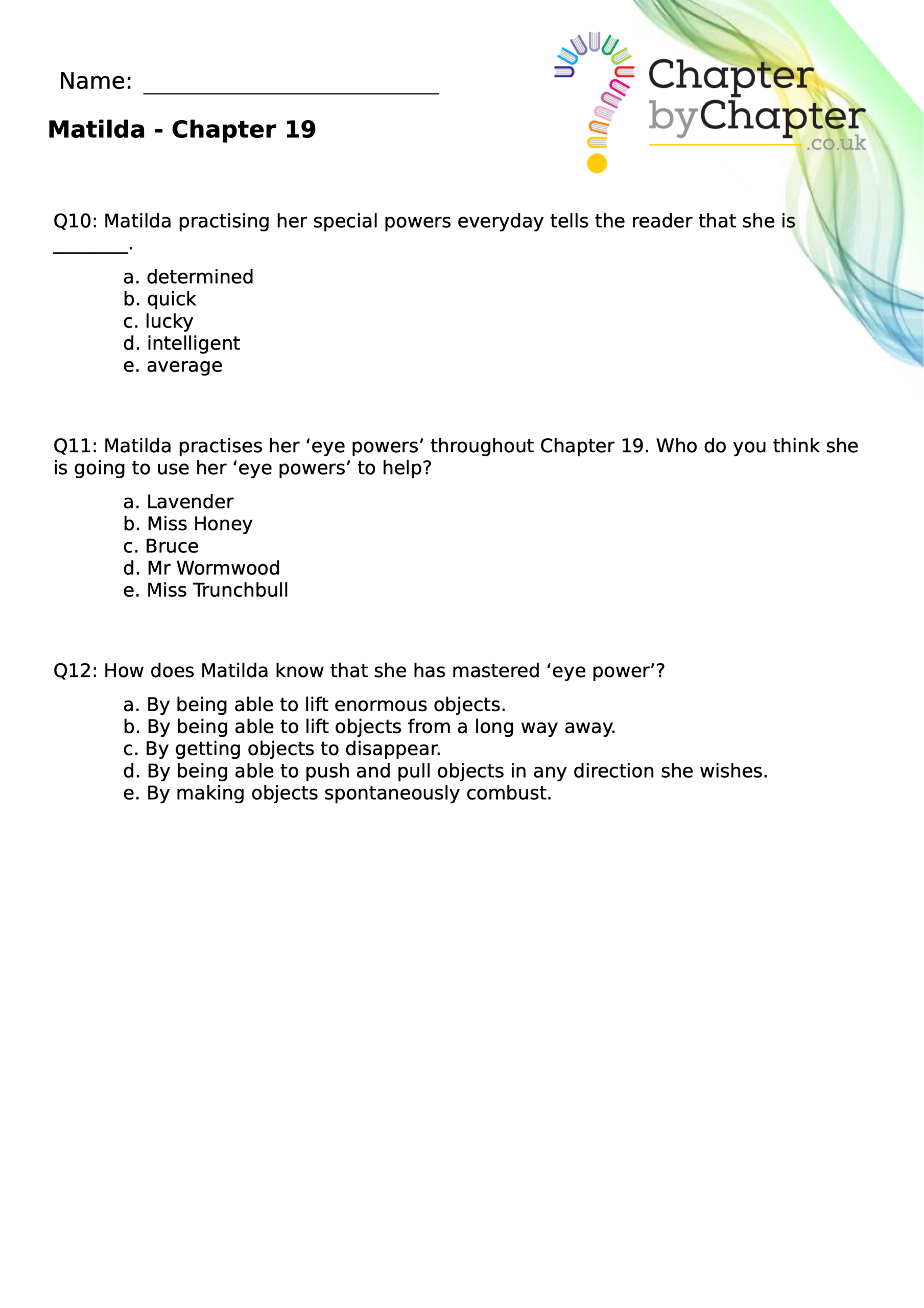 With chapter-by-chapter questions for Matilda, our worksheets help pupils practise comprehension, grammar, spelling, and punctuation all in one place.