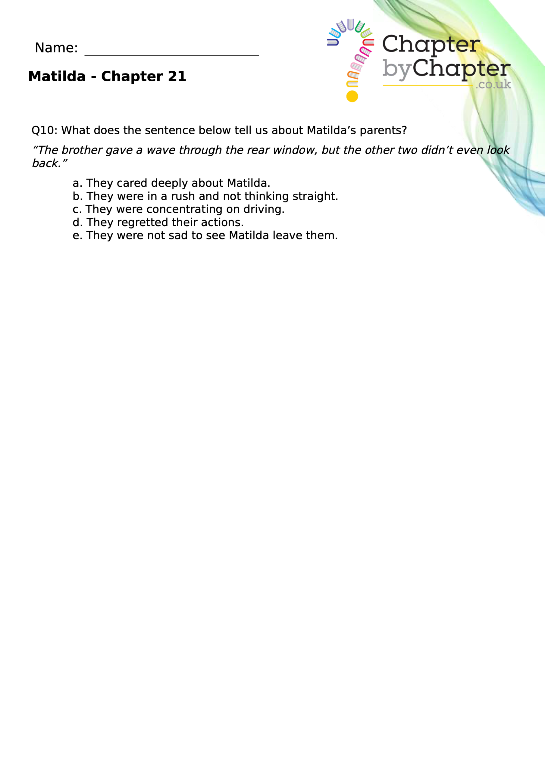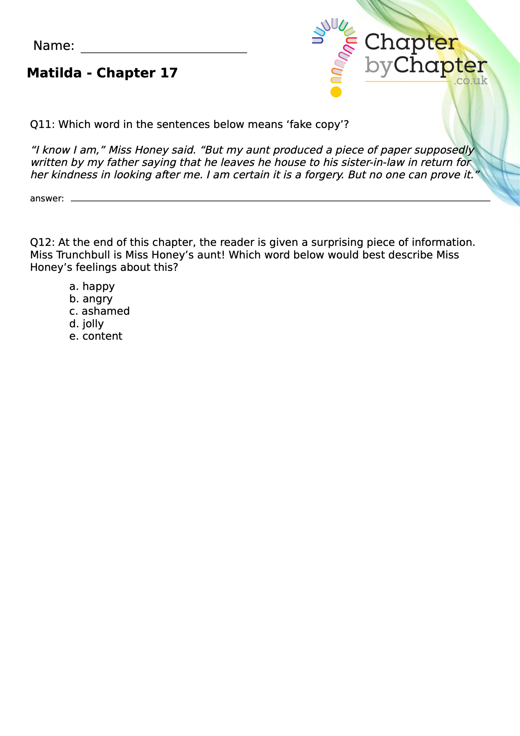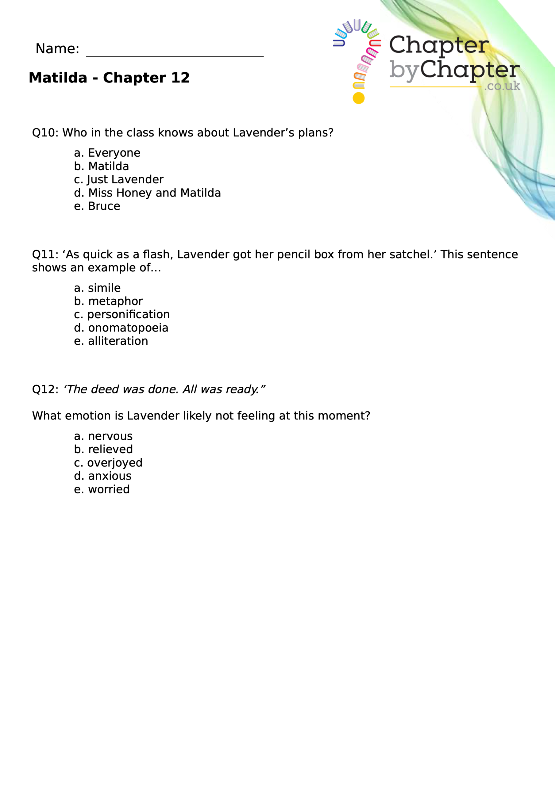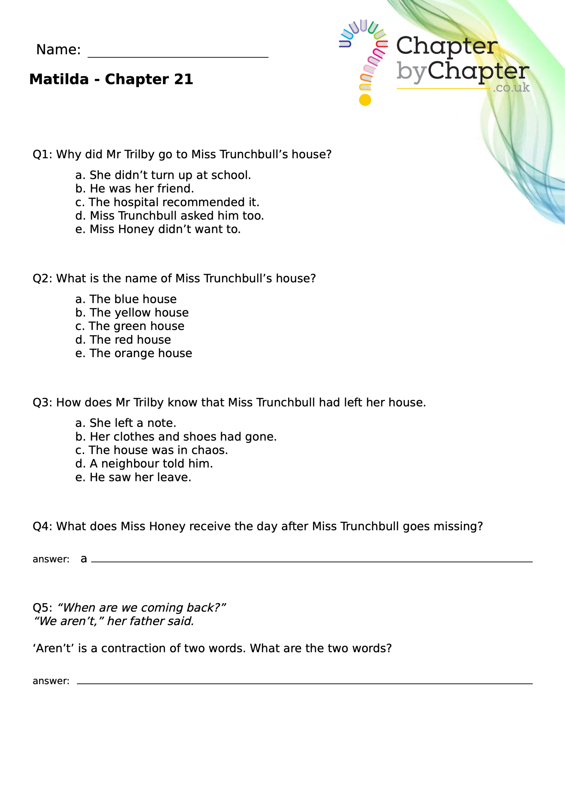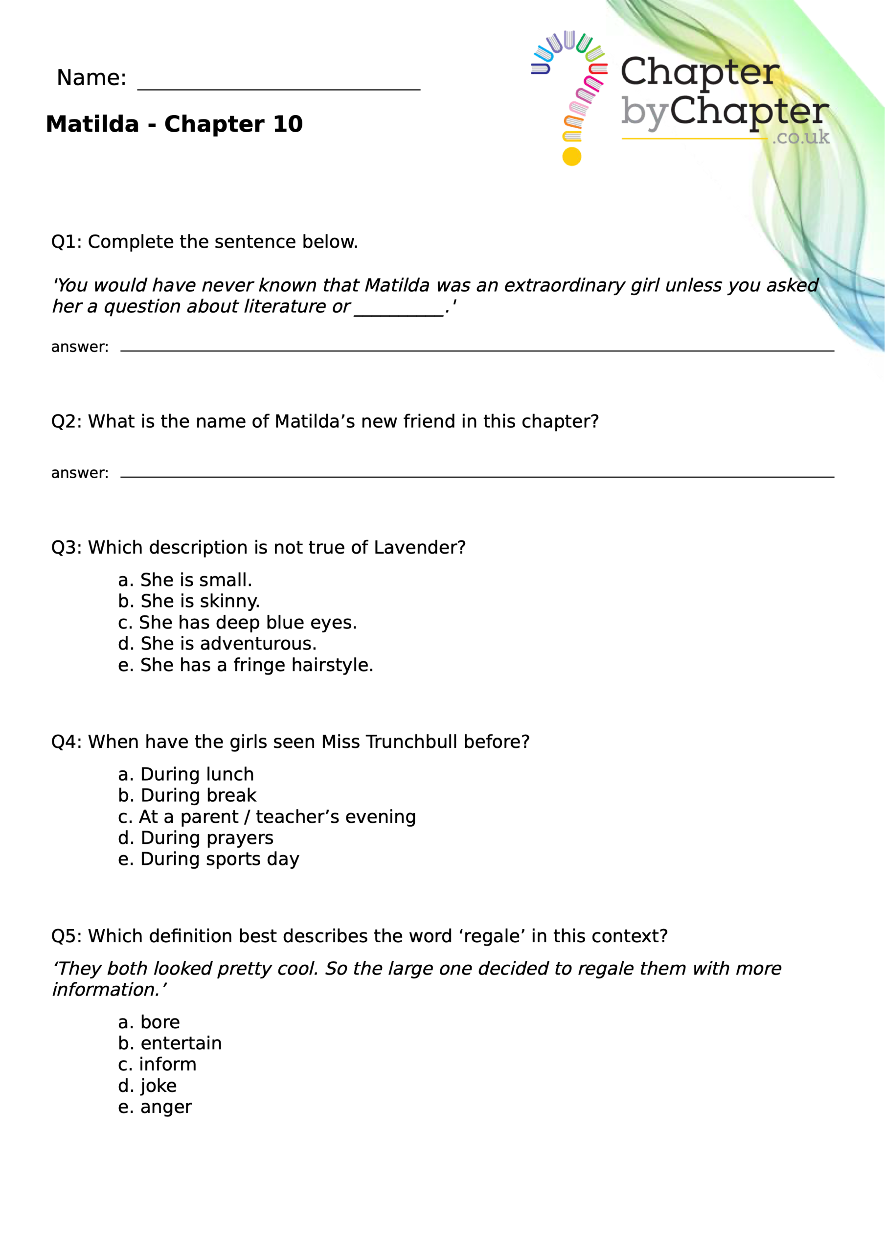 With chapter-by-chapter questions for Matilda, our worksheets help pupils practise comprehension, grammar, spelling, and punctuation all in one place.