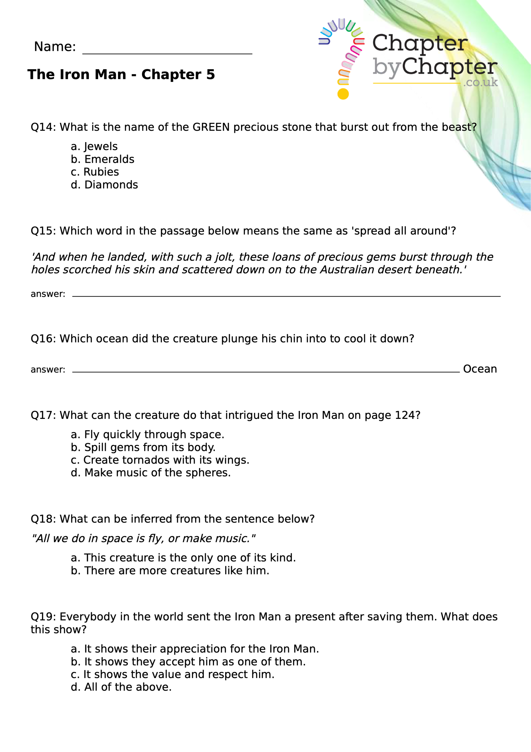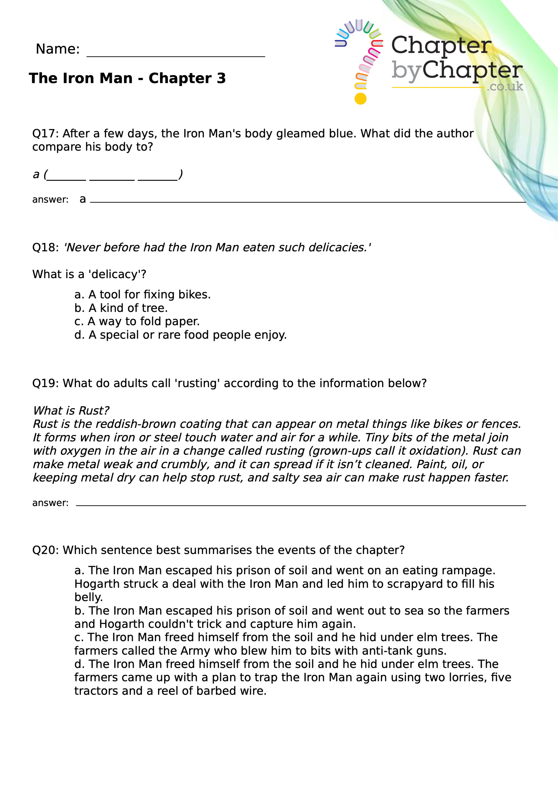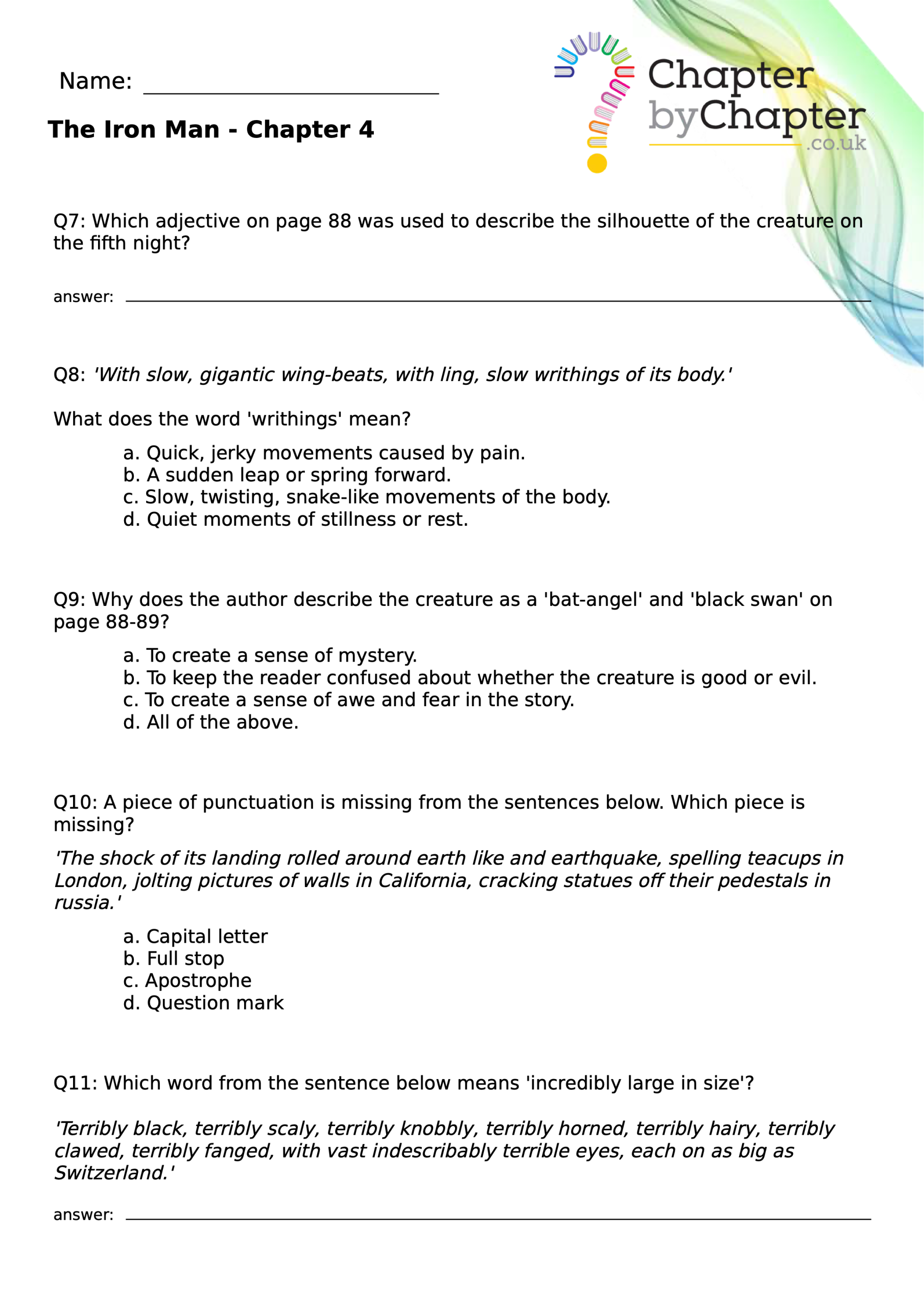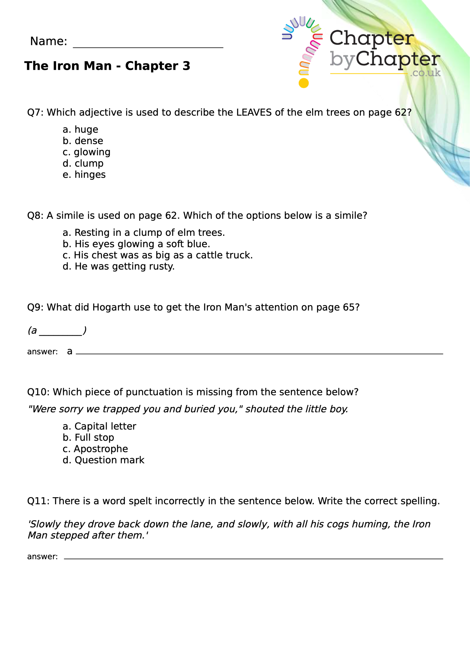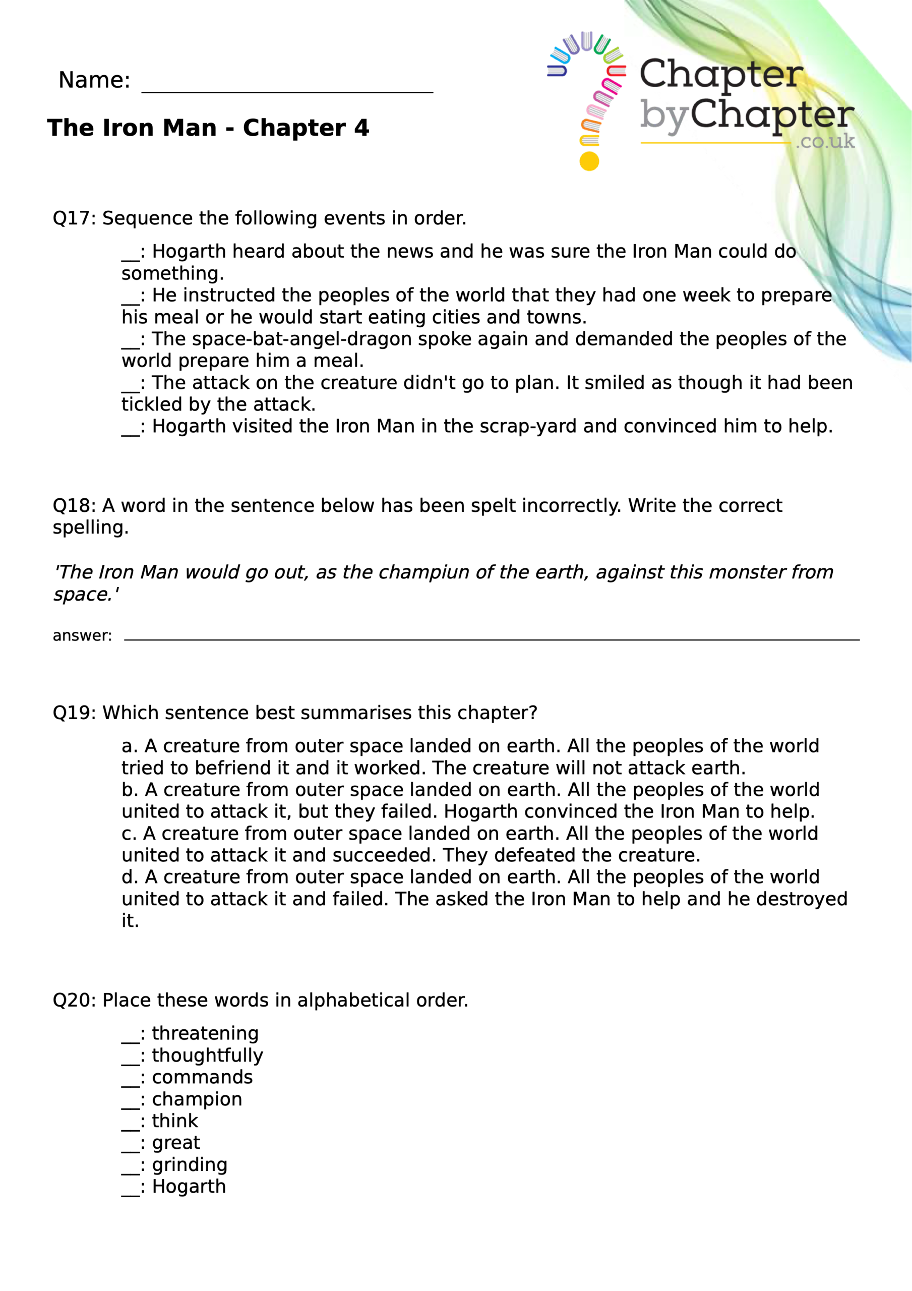 This comprehension is made up of 20 questions again linked to chapter 2 of The Iron Man, ‘The Return of the Iron Man’.