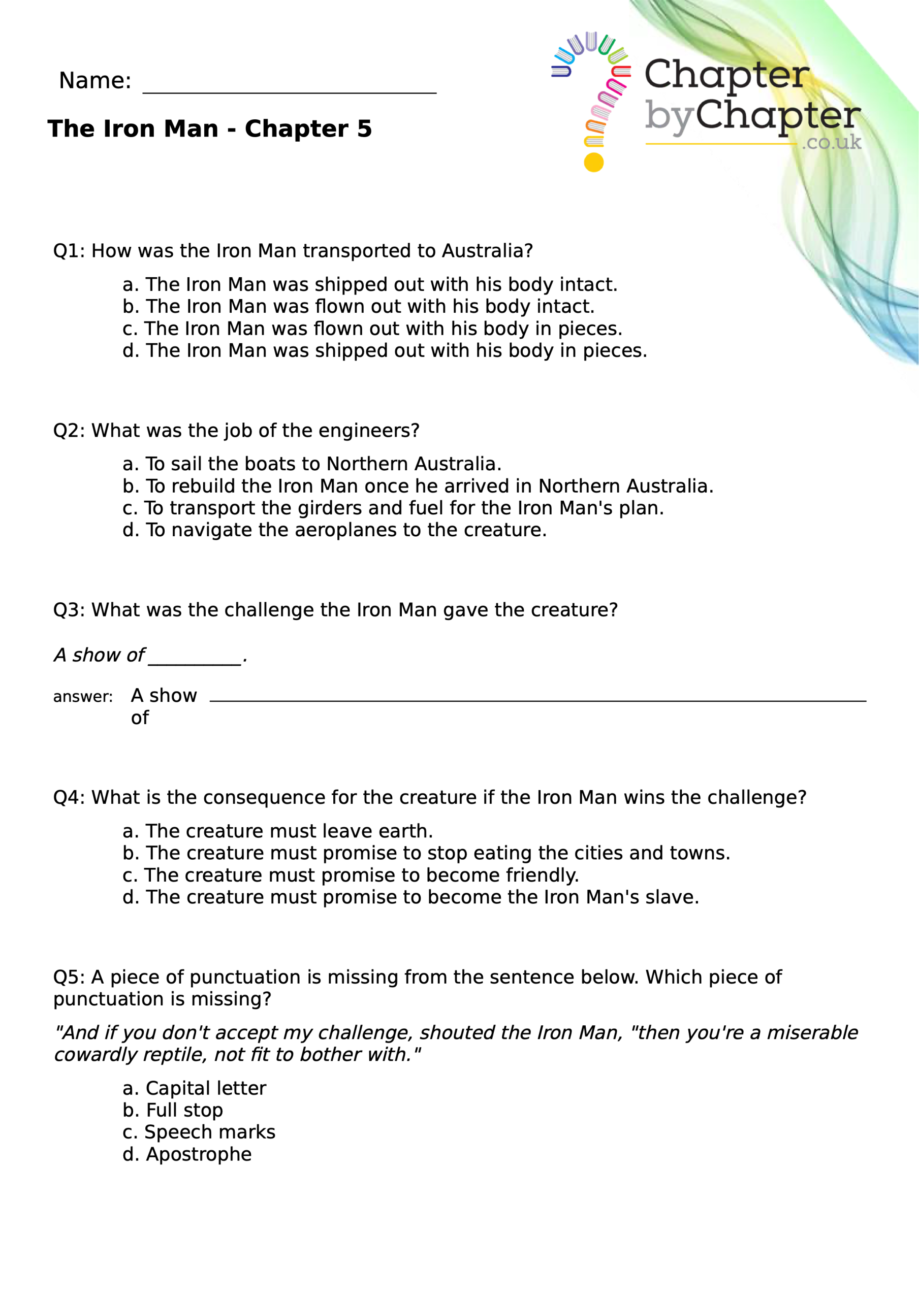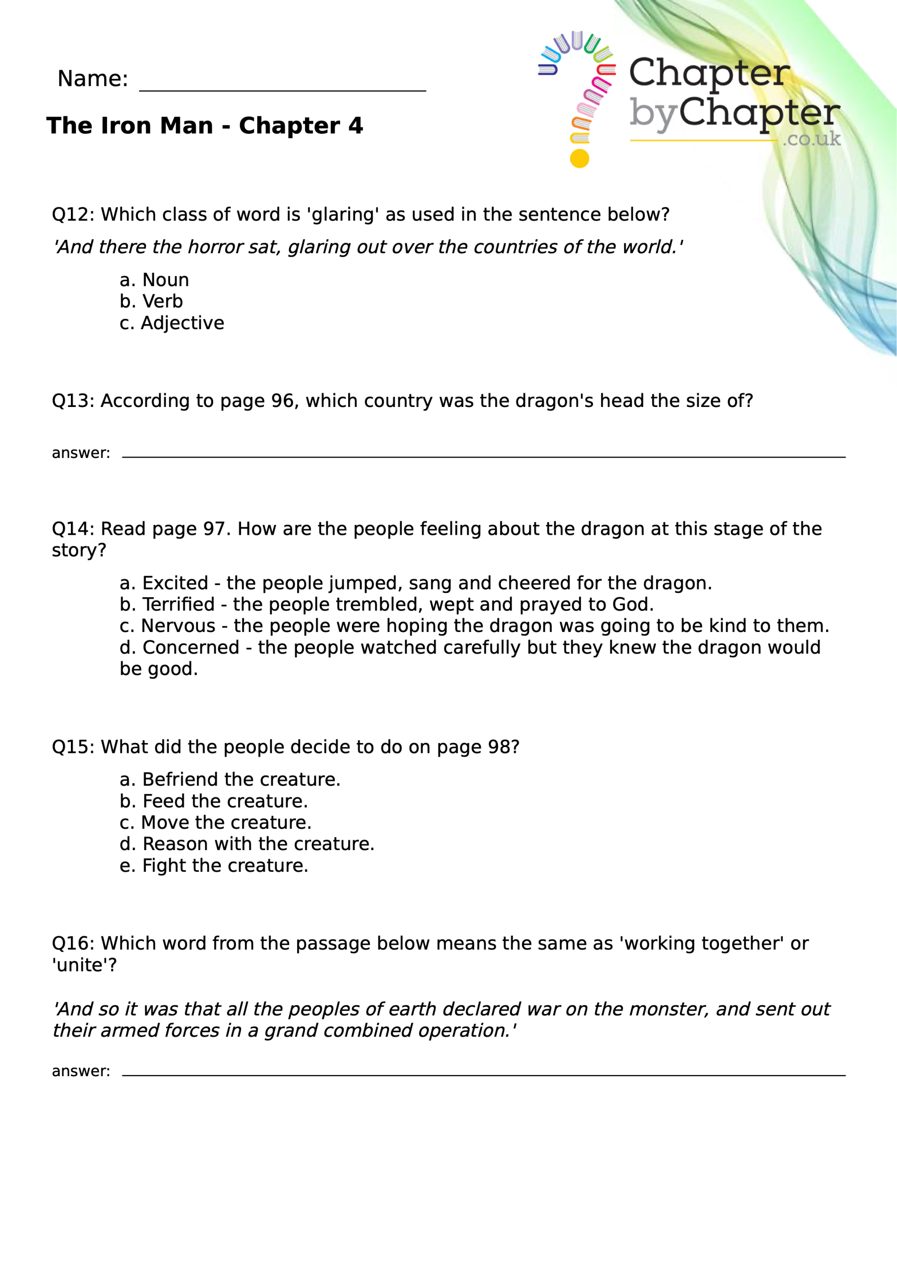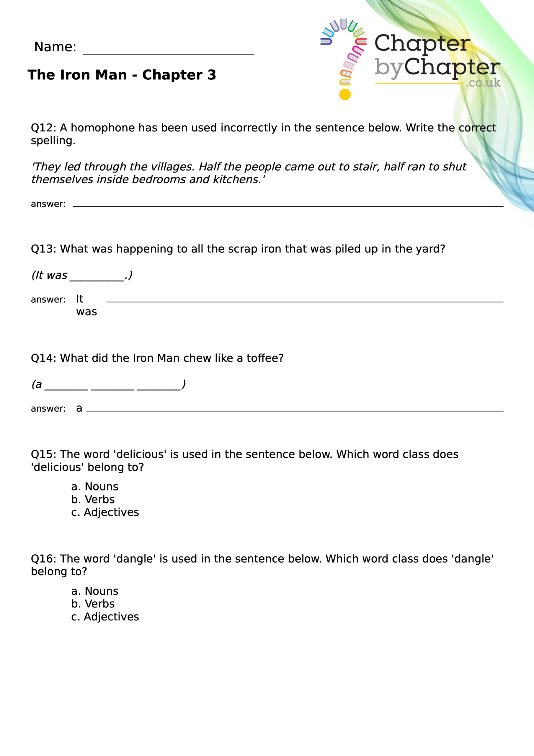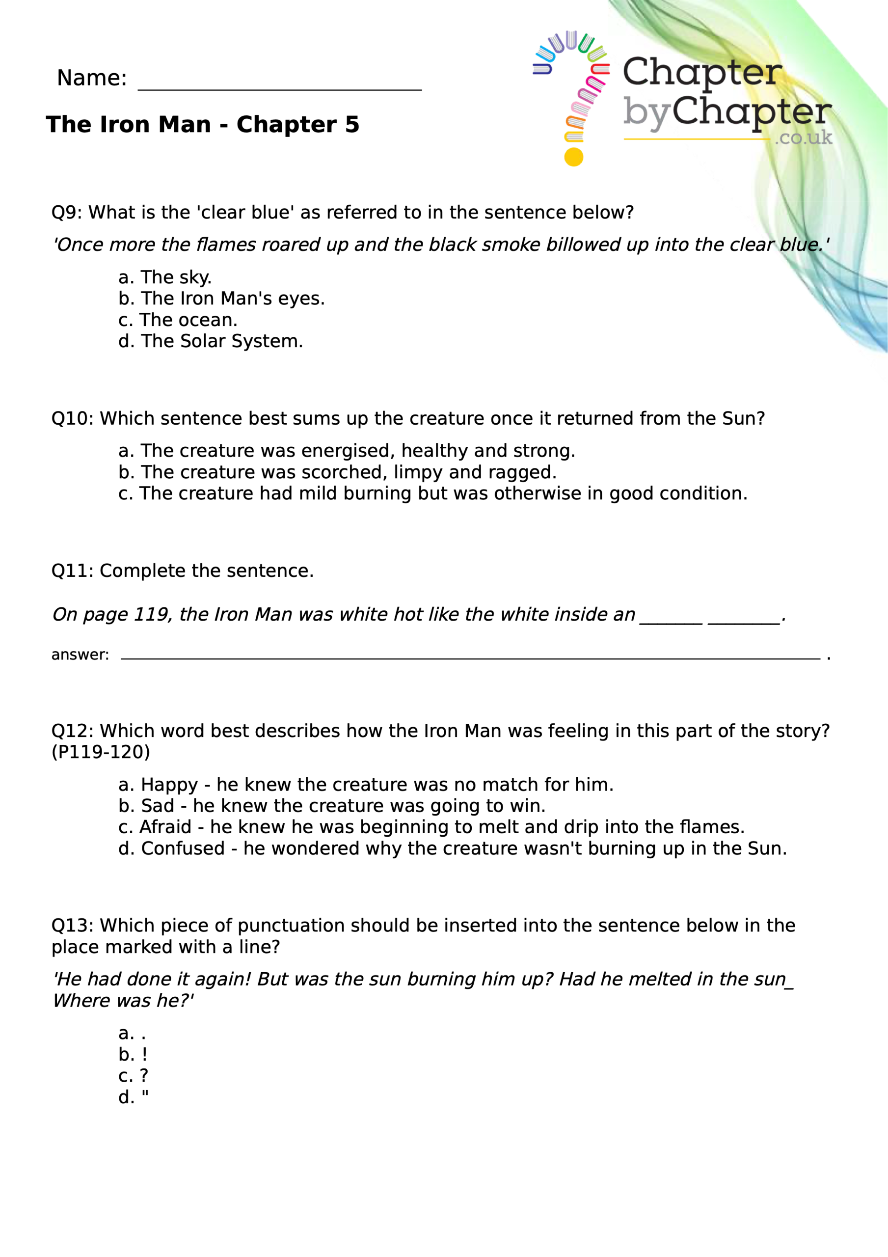 This comprehension is made up of 20 questions again linked to chapter 2 of The Iron Man, ‘The Return of the Iron Man’.
