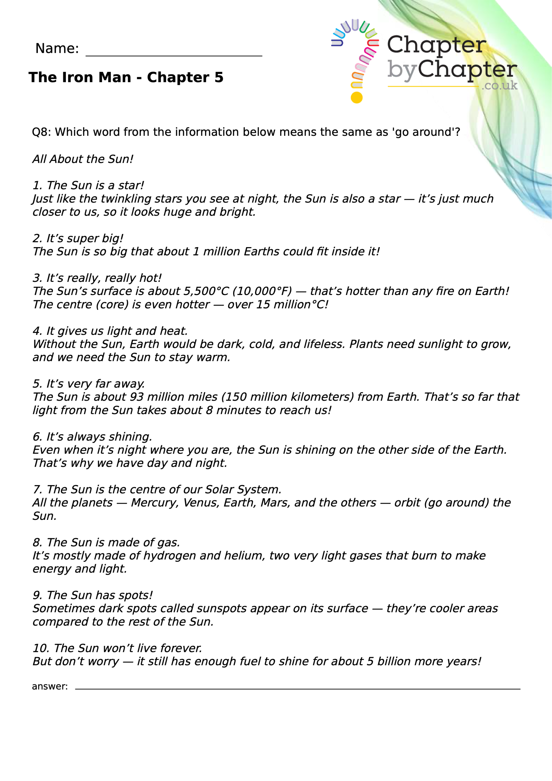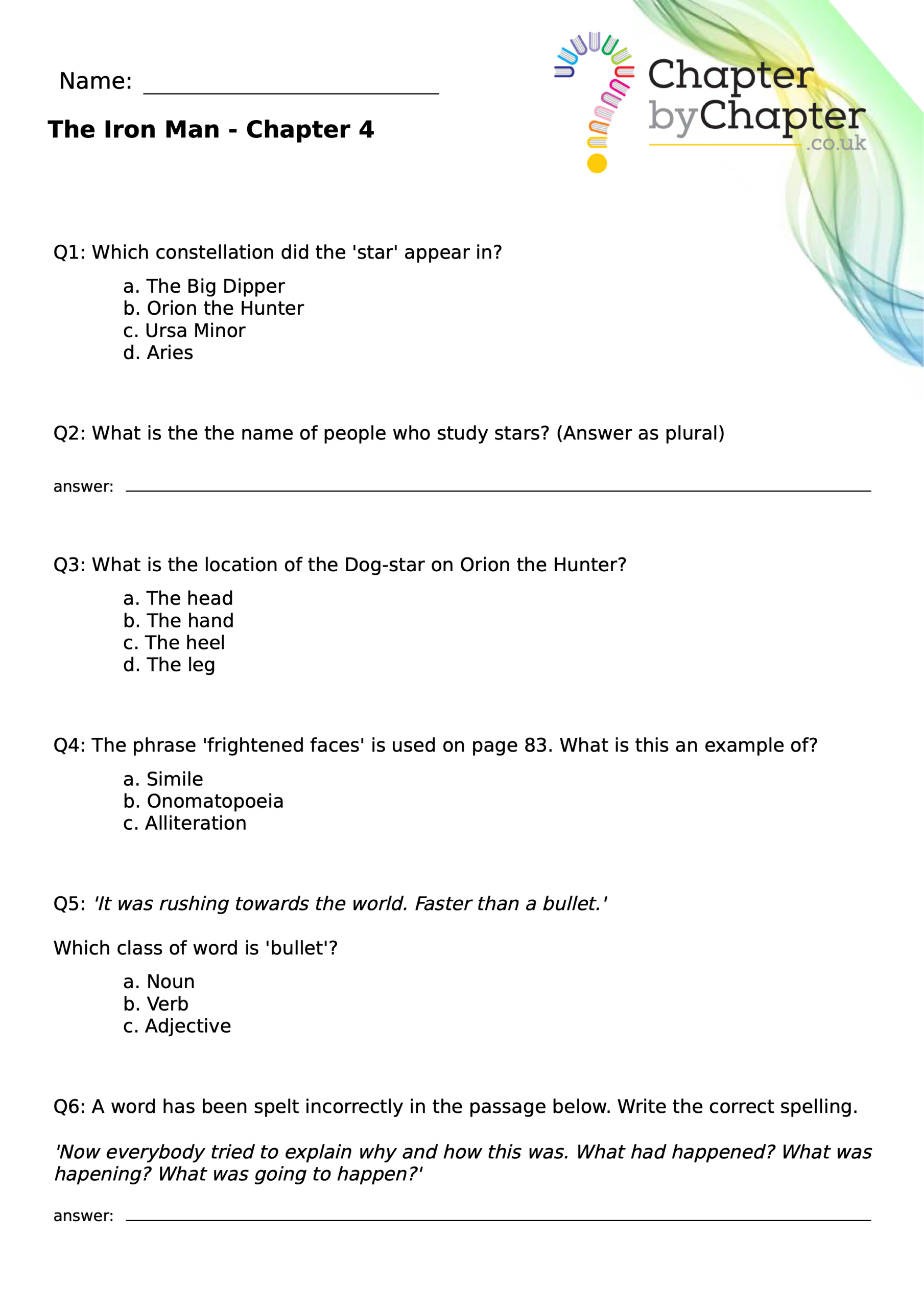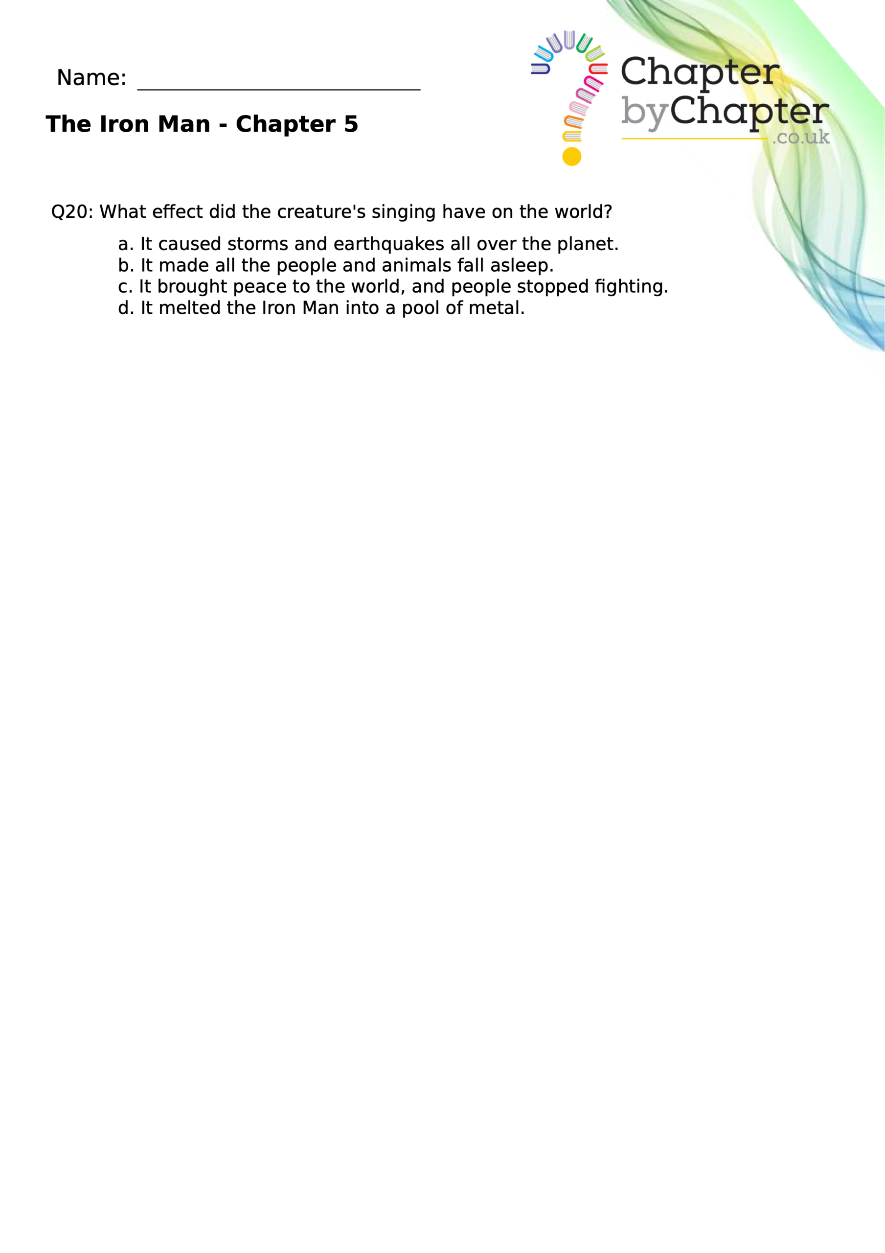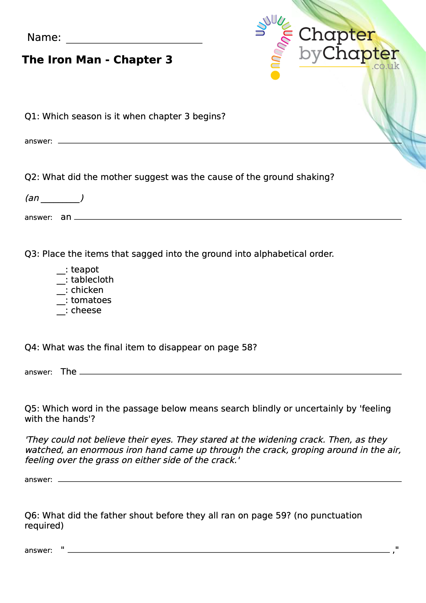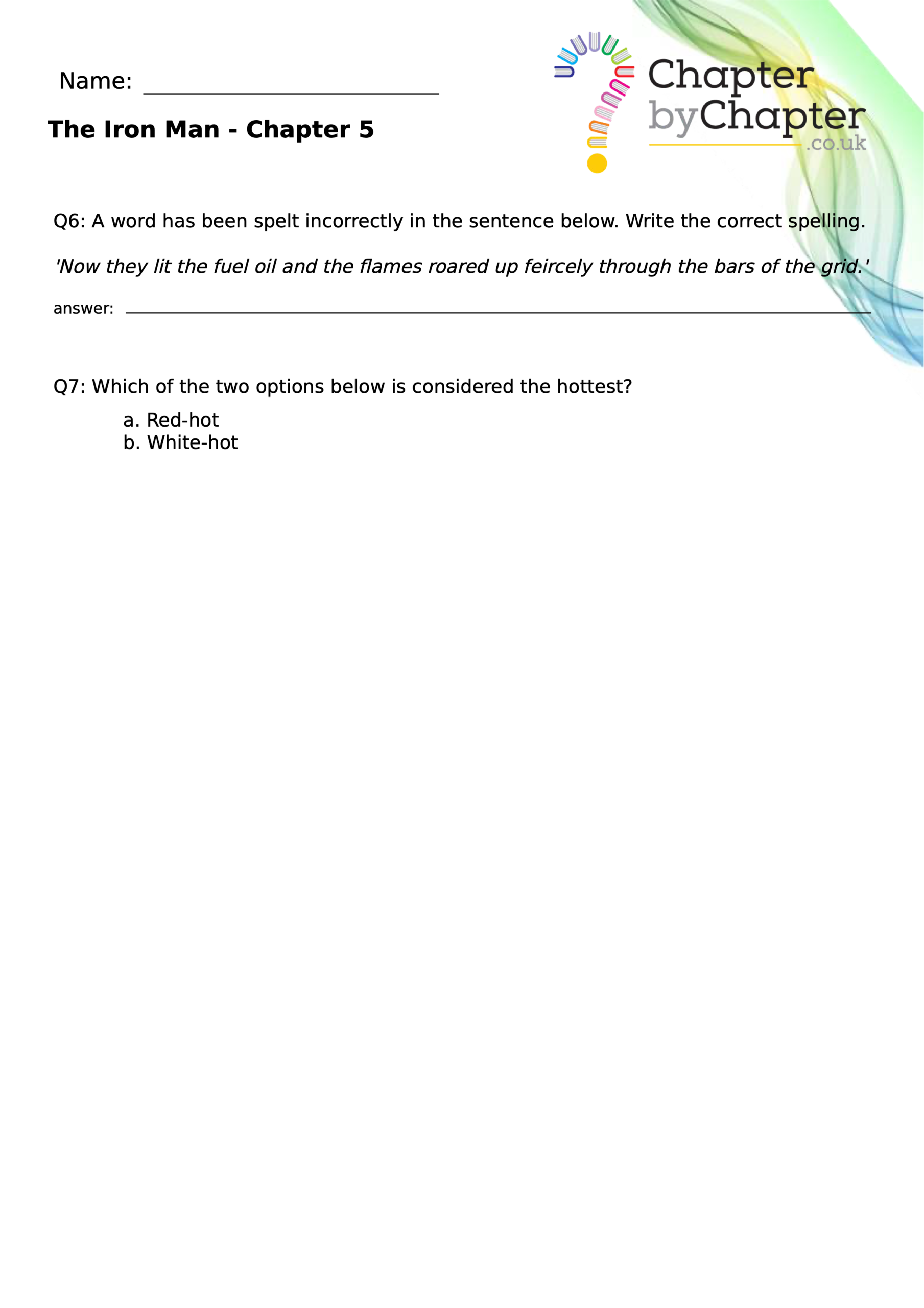 This comprehension is made up of 20 questions again linked to chapter 2 of The Iron Man, ‘The Return of the Iron Man’.