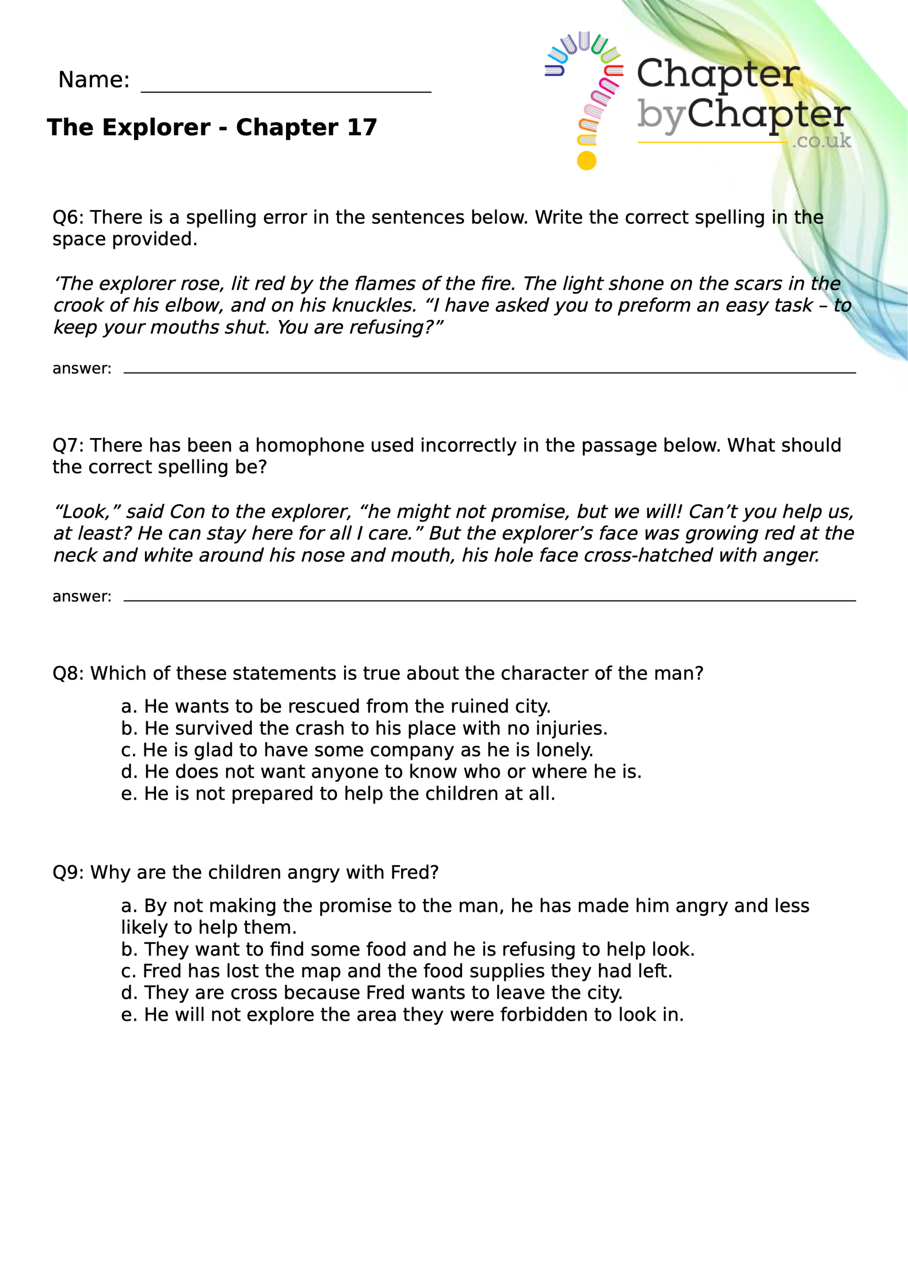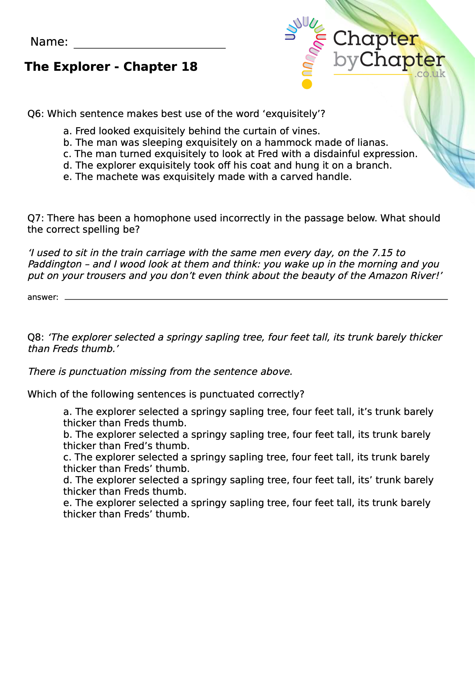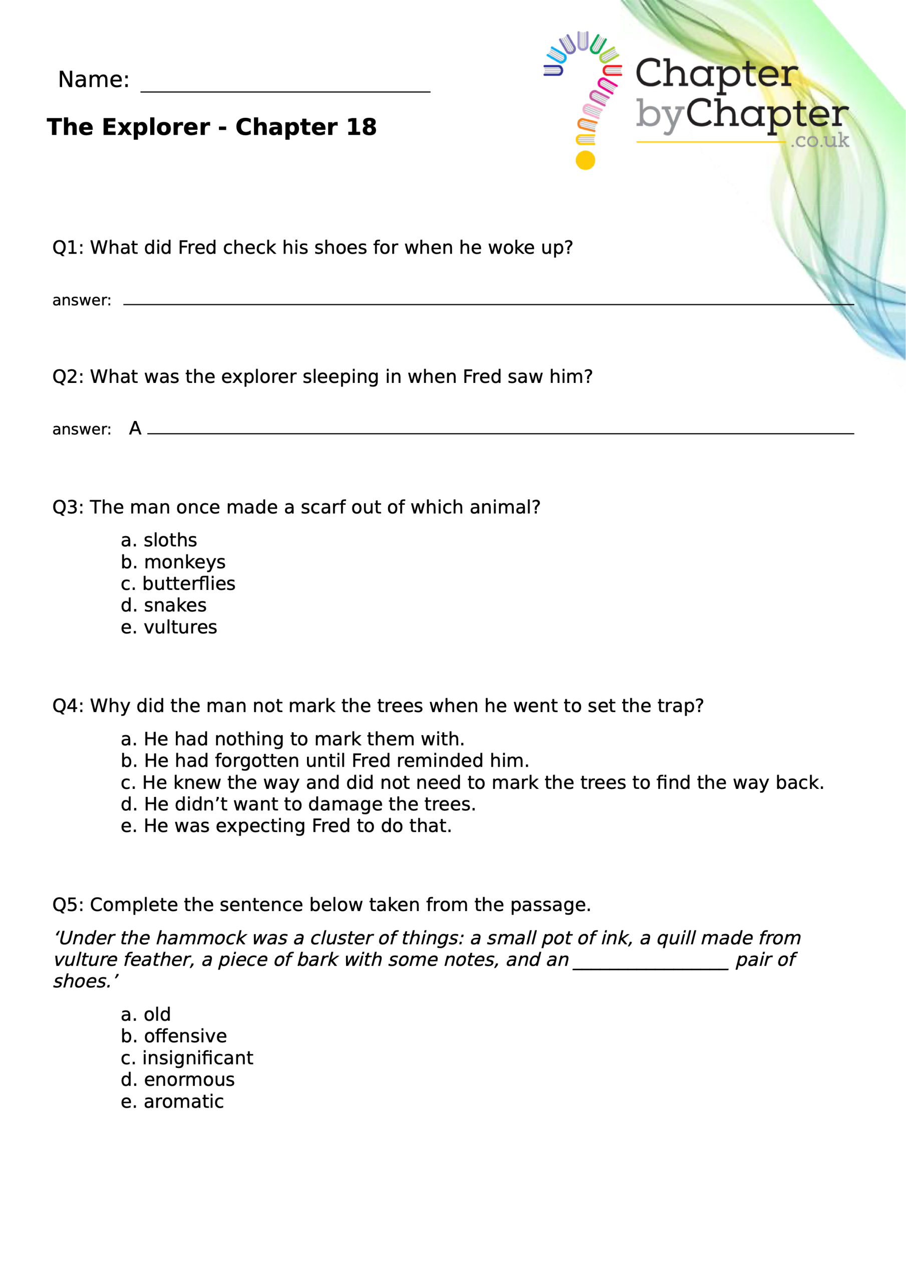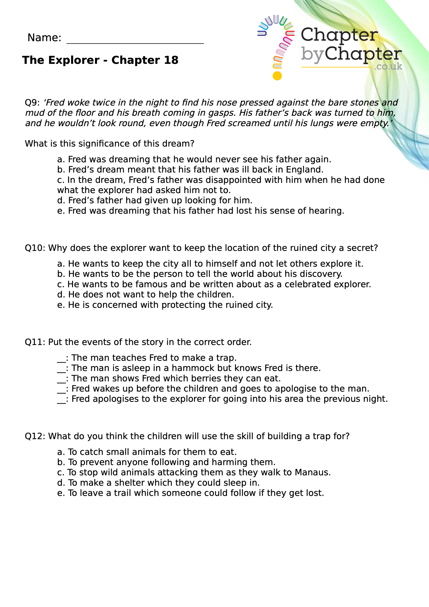 Another chapter comprehension pack, this time linked to Chapter 18 of The Explorer.