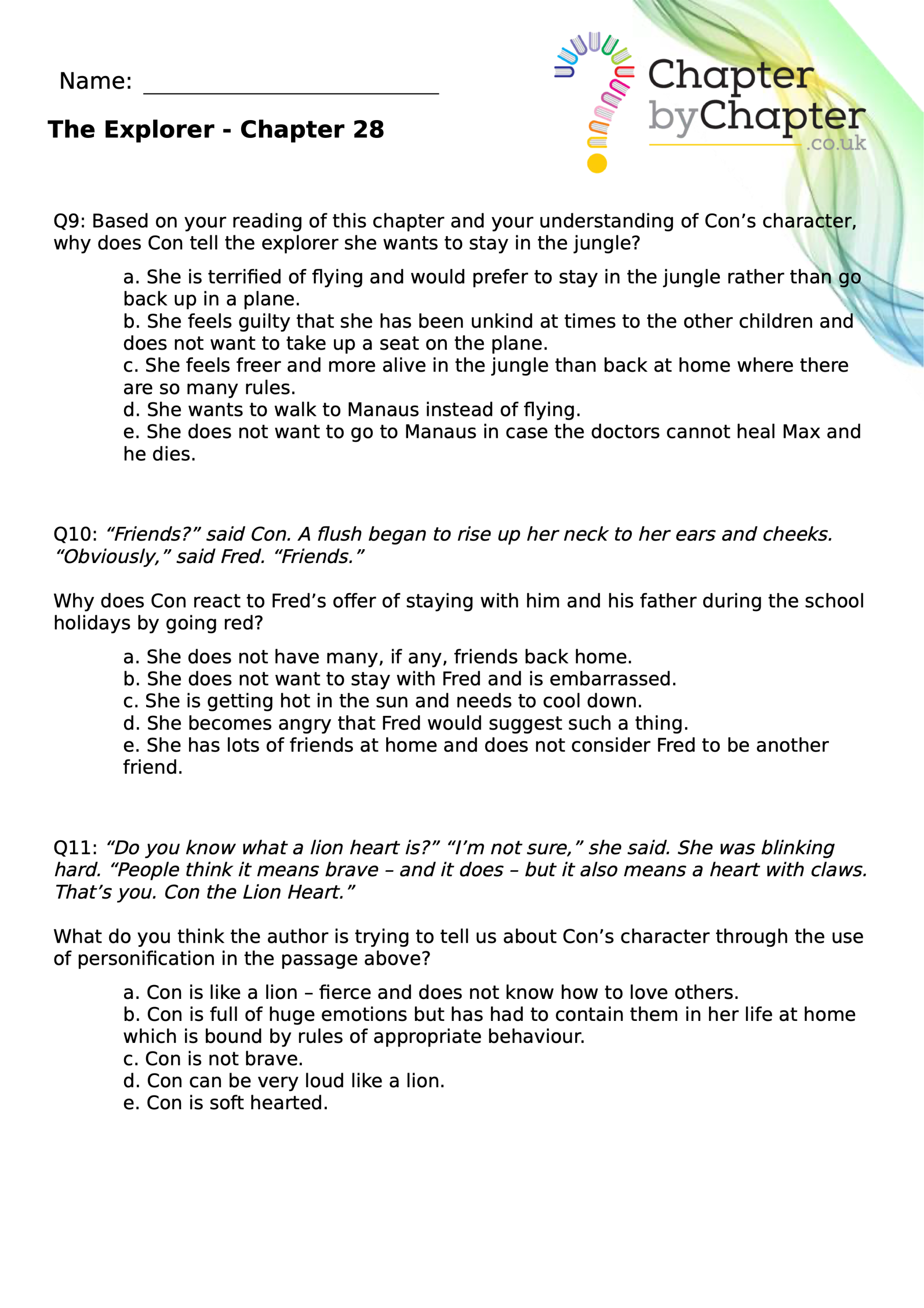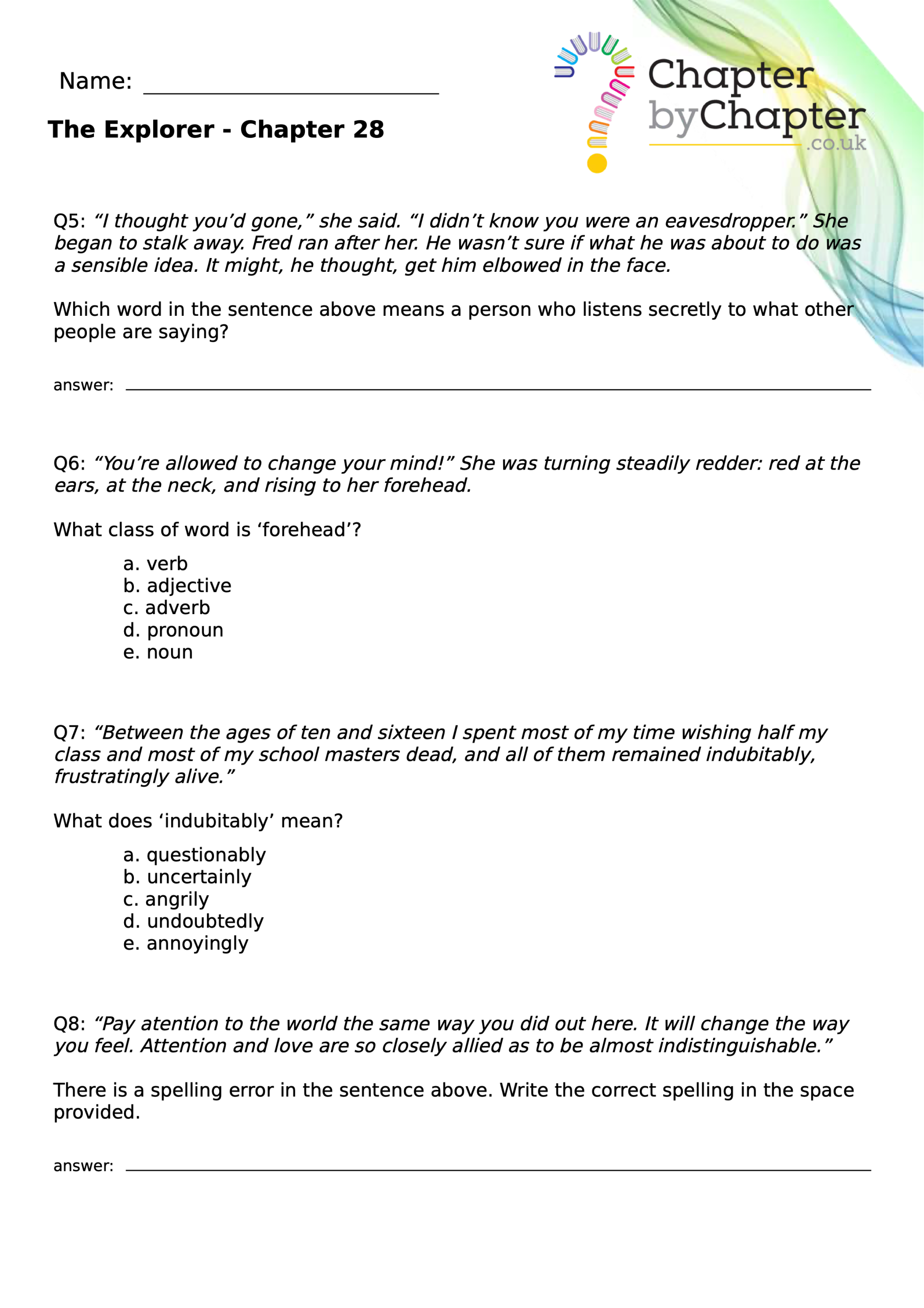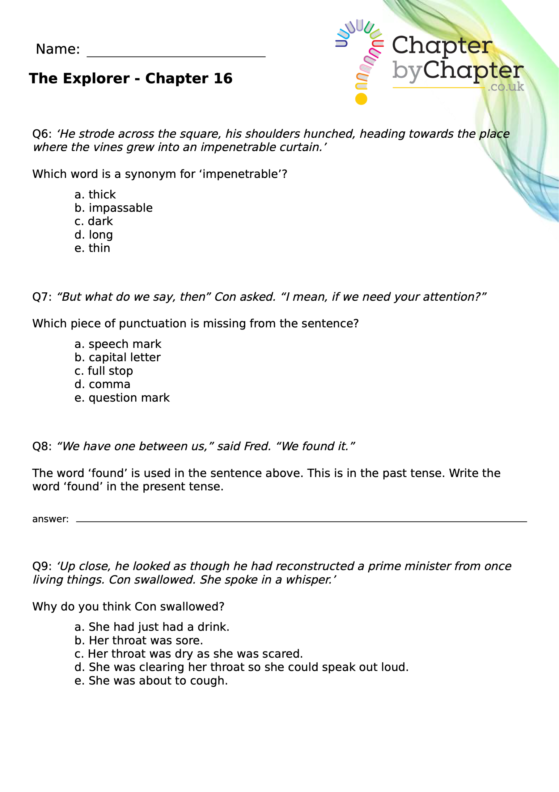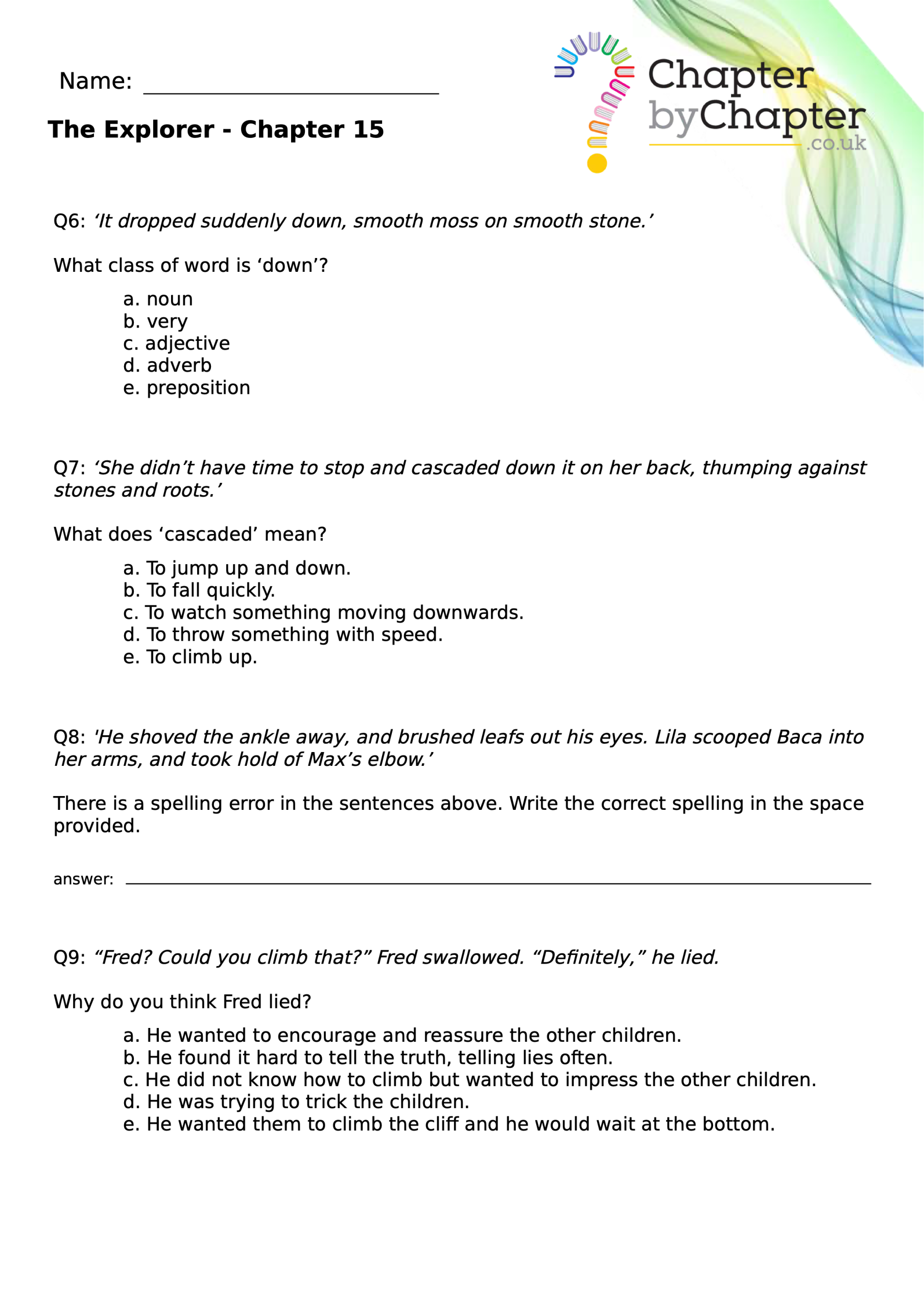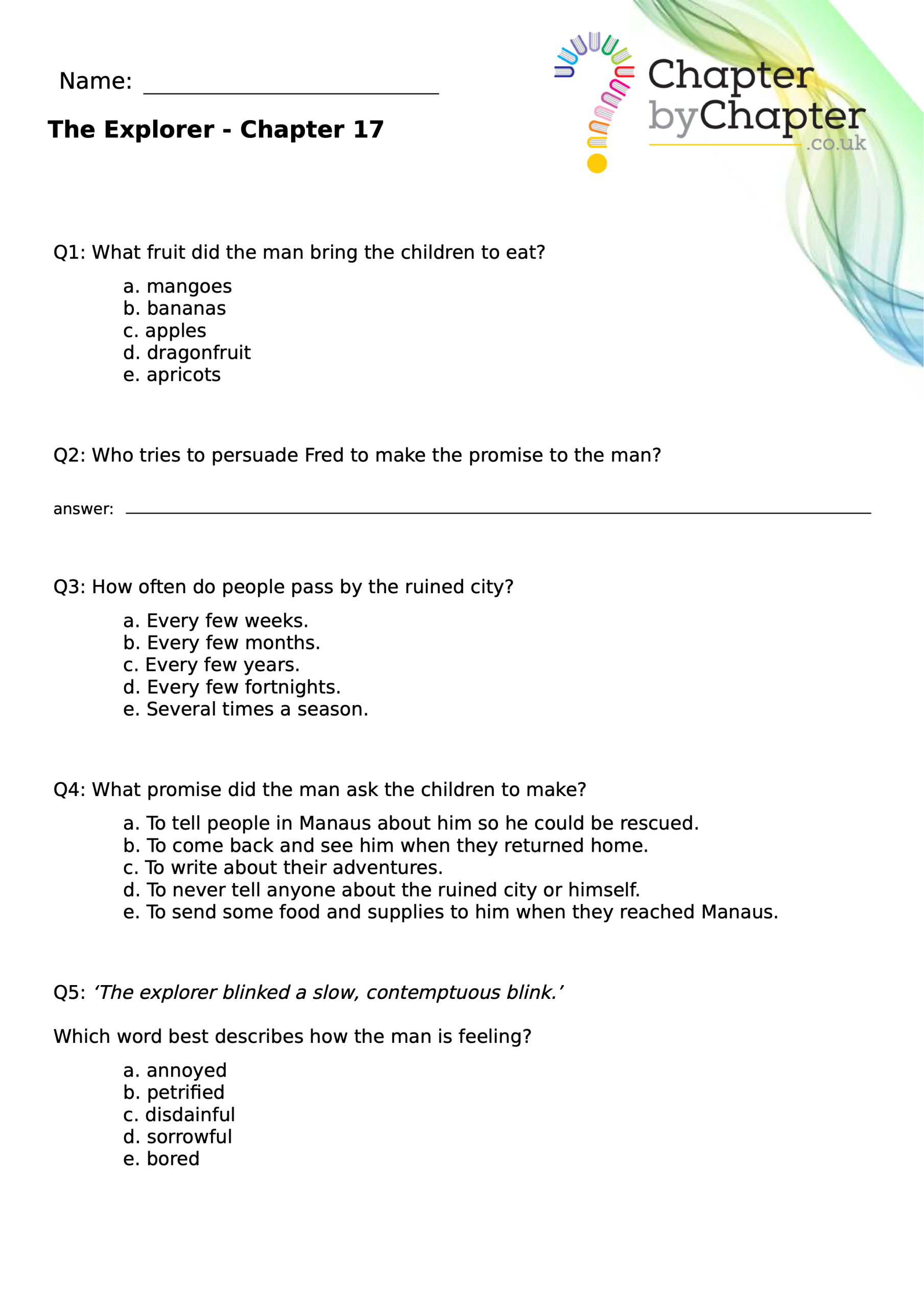 Another chapter comprehension pack, this time linked to Chapter 18 of The Explorer.