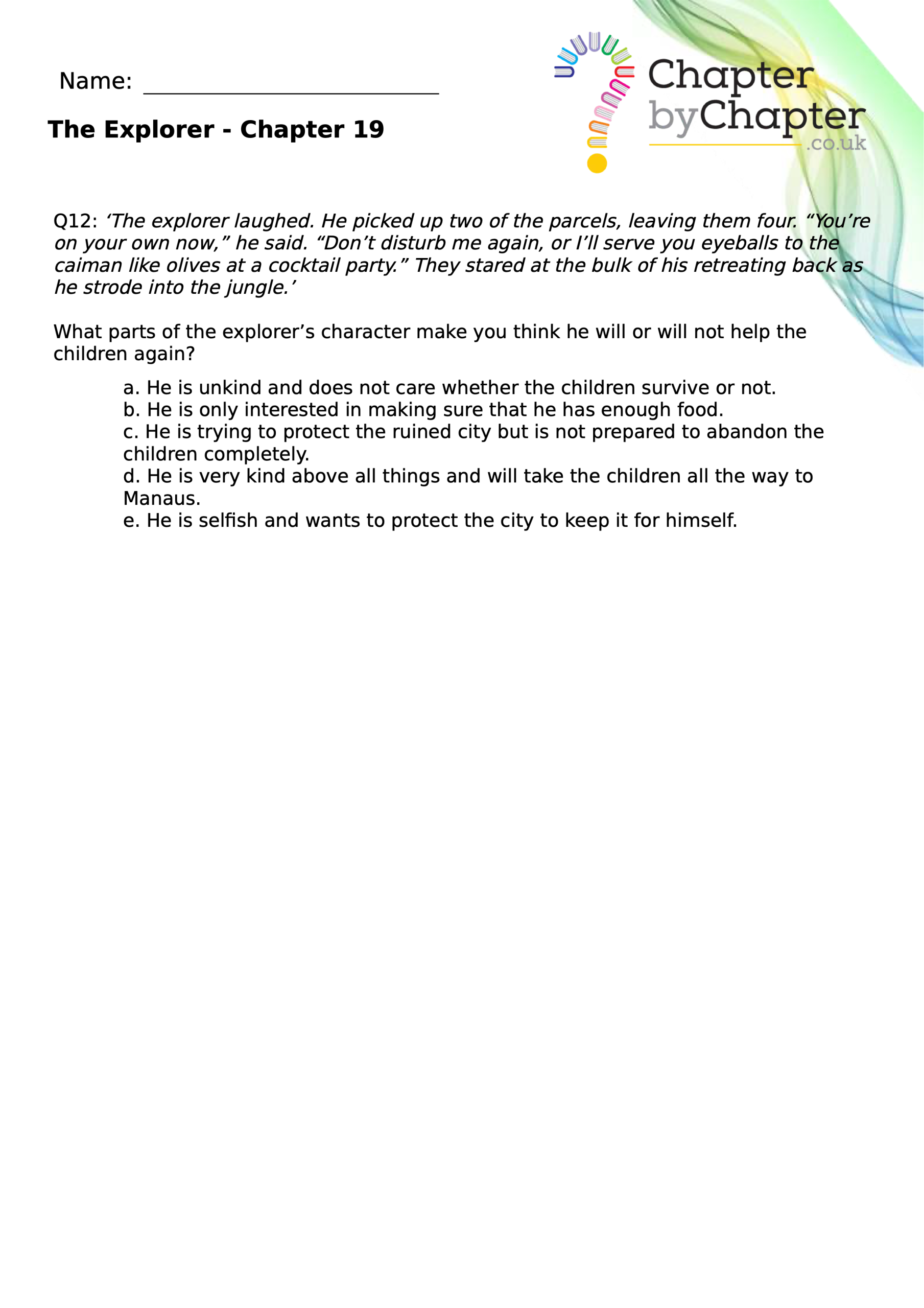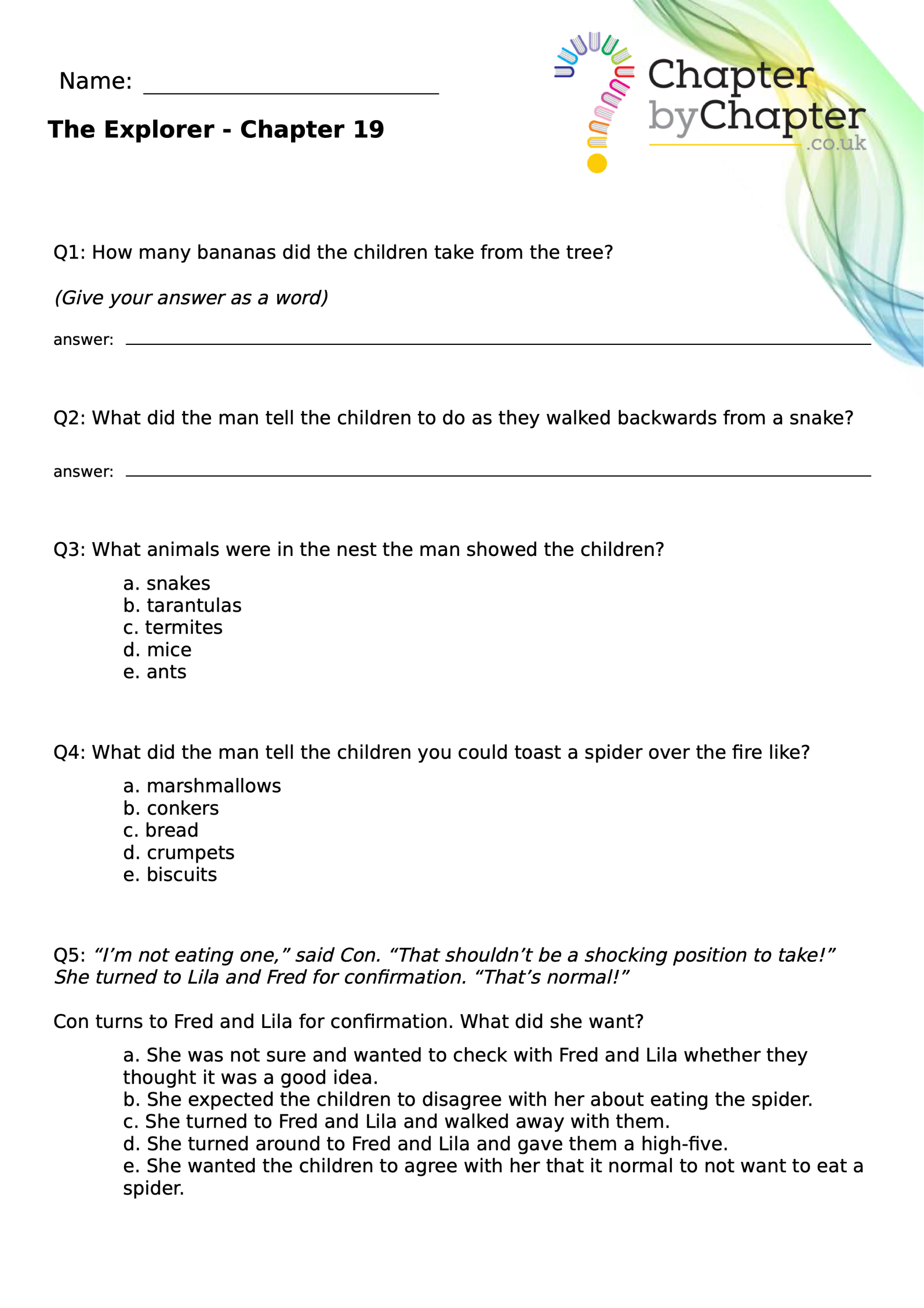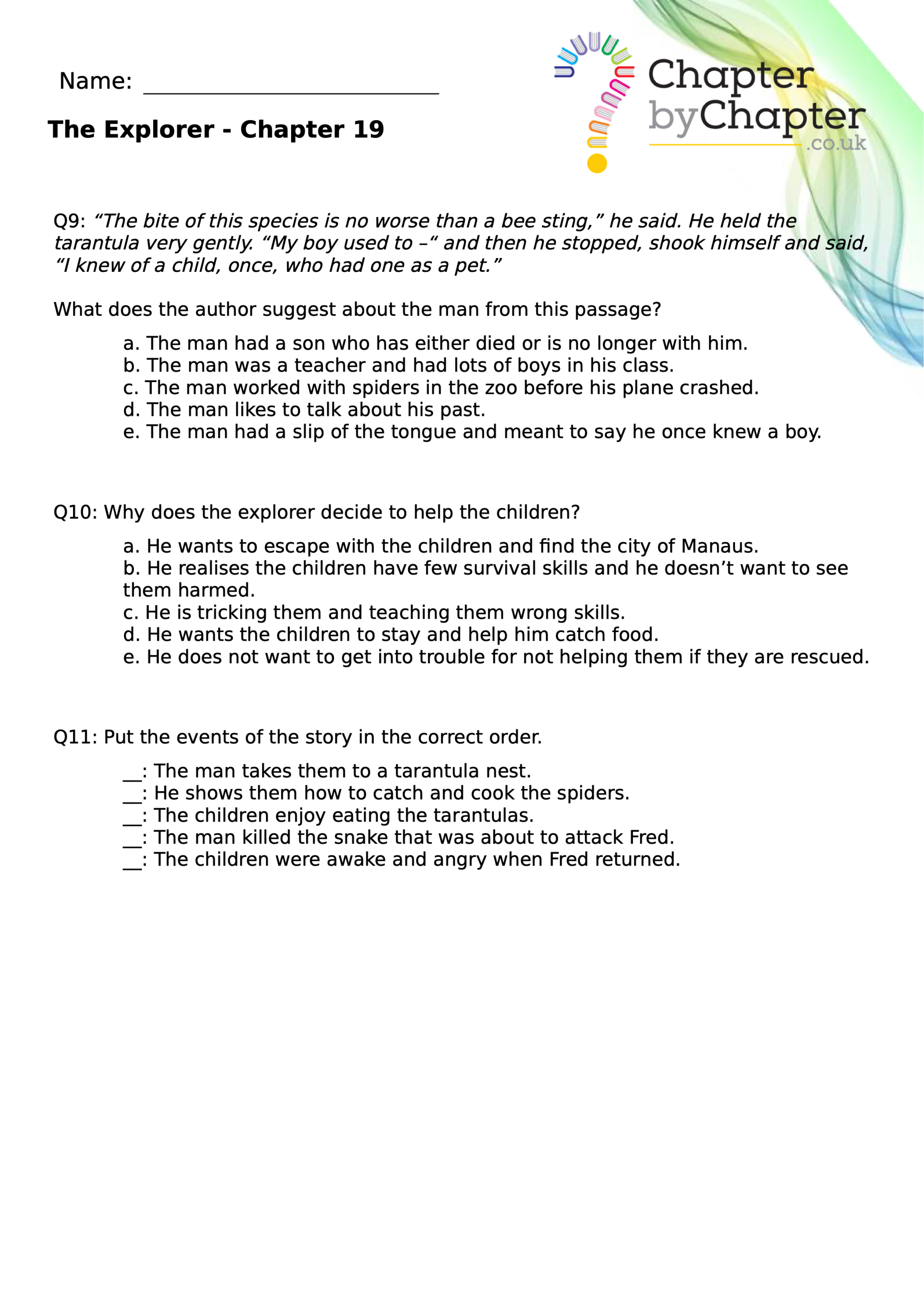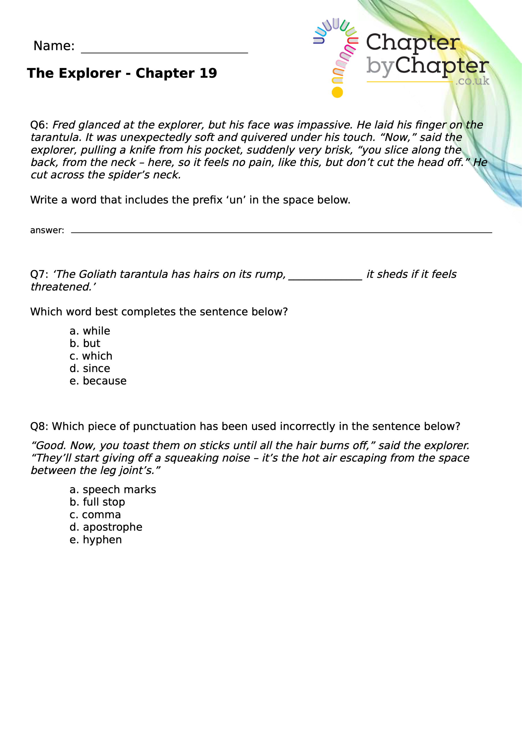 Another chapter comprehension pack, this time linked to Chapter 19 of The Explorer.