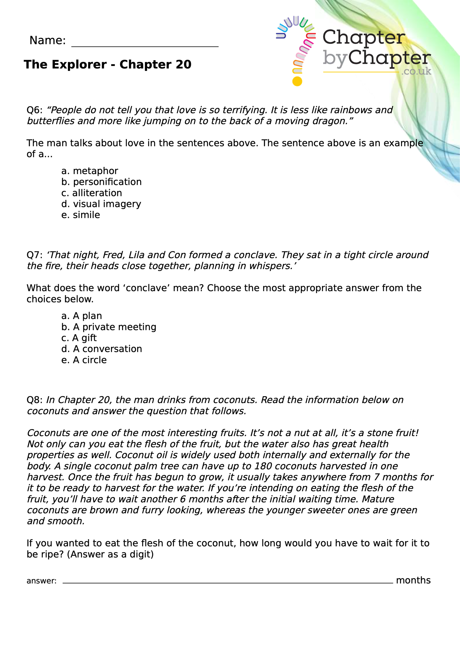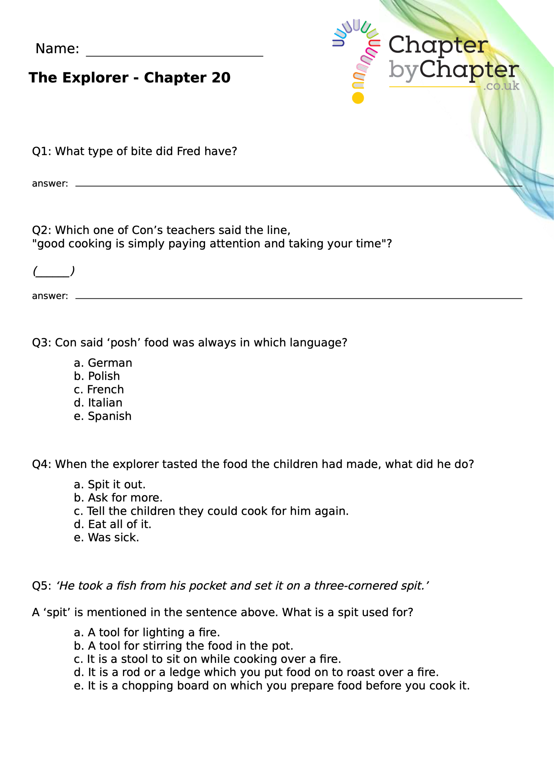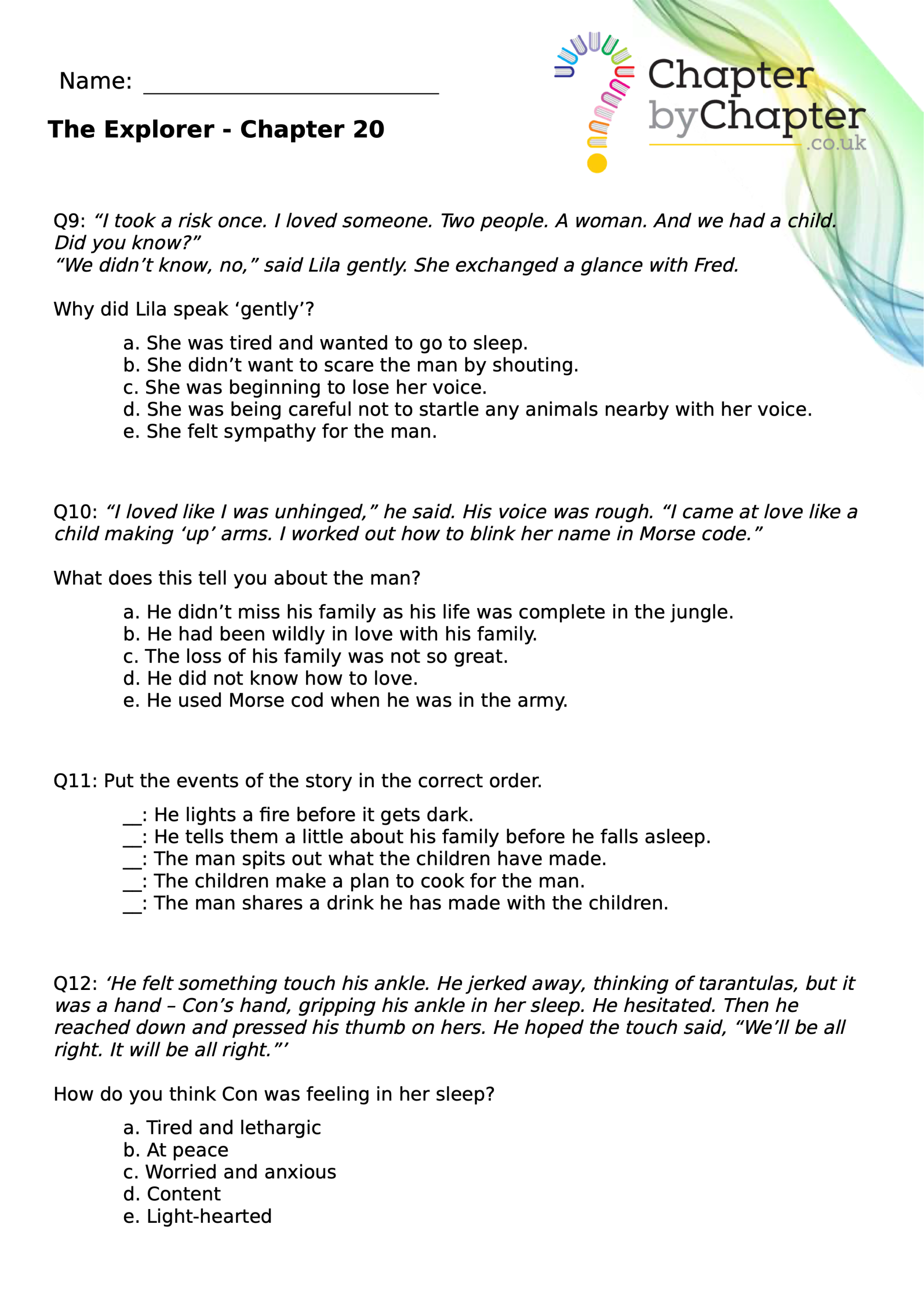 Another chapter comprehension pack, this time linked to Chapter 20 of The Explorer.