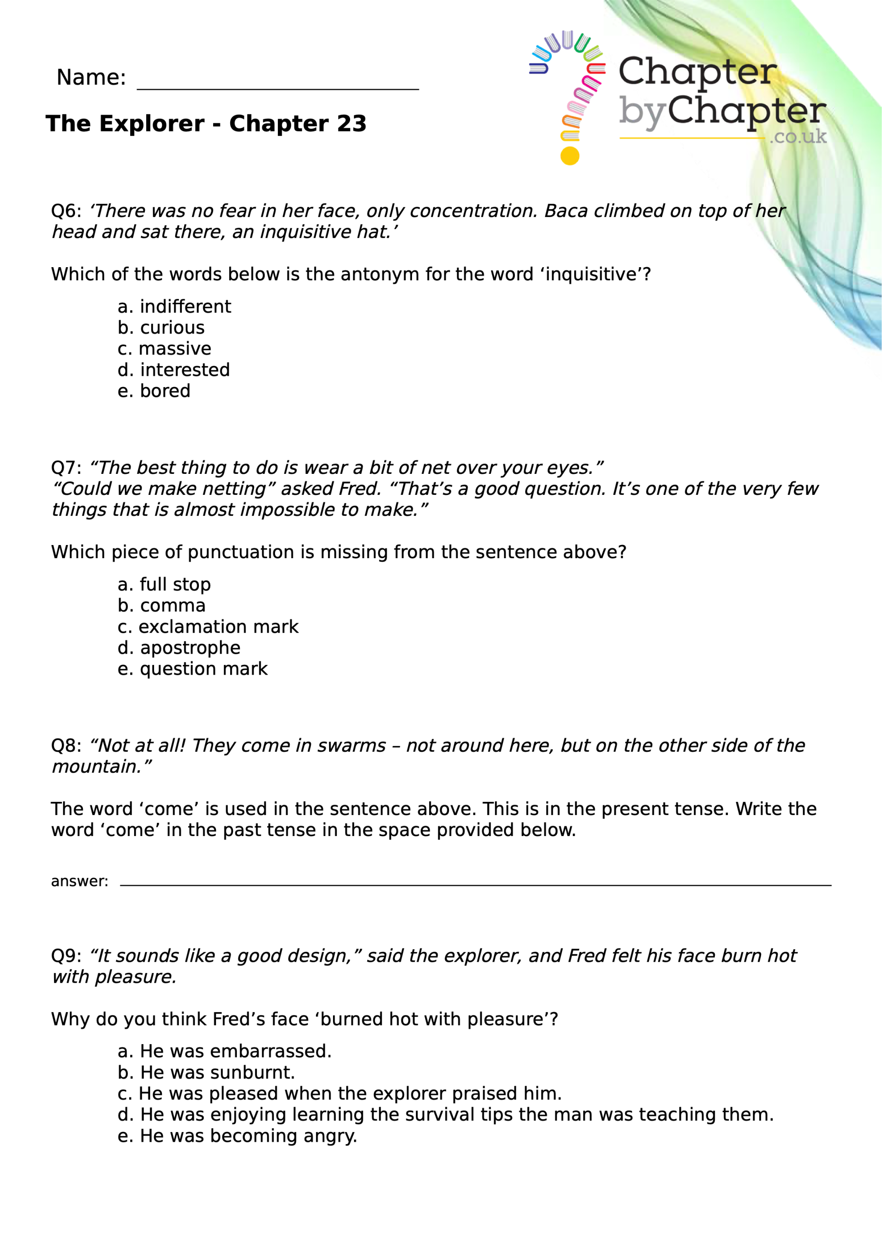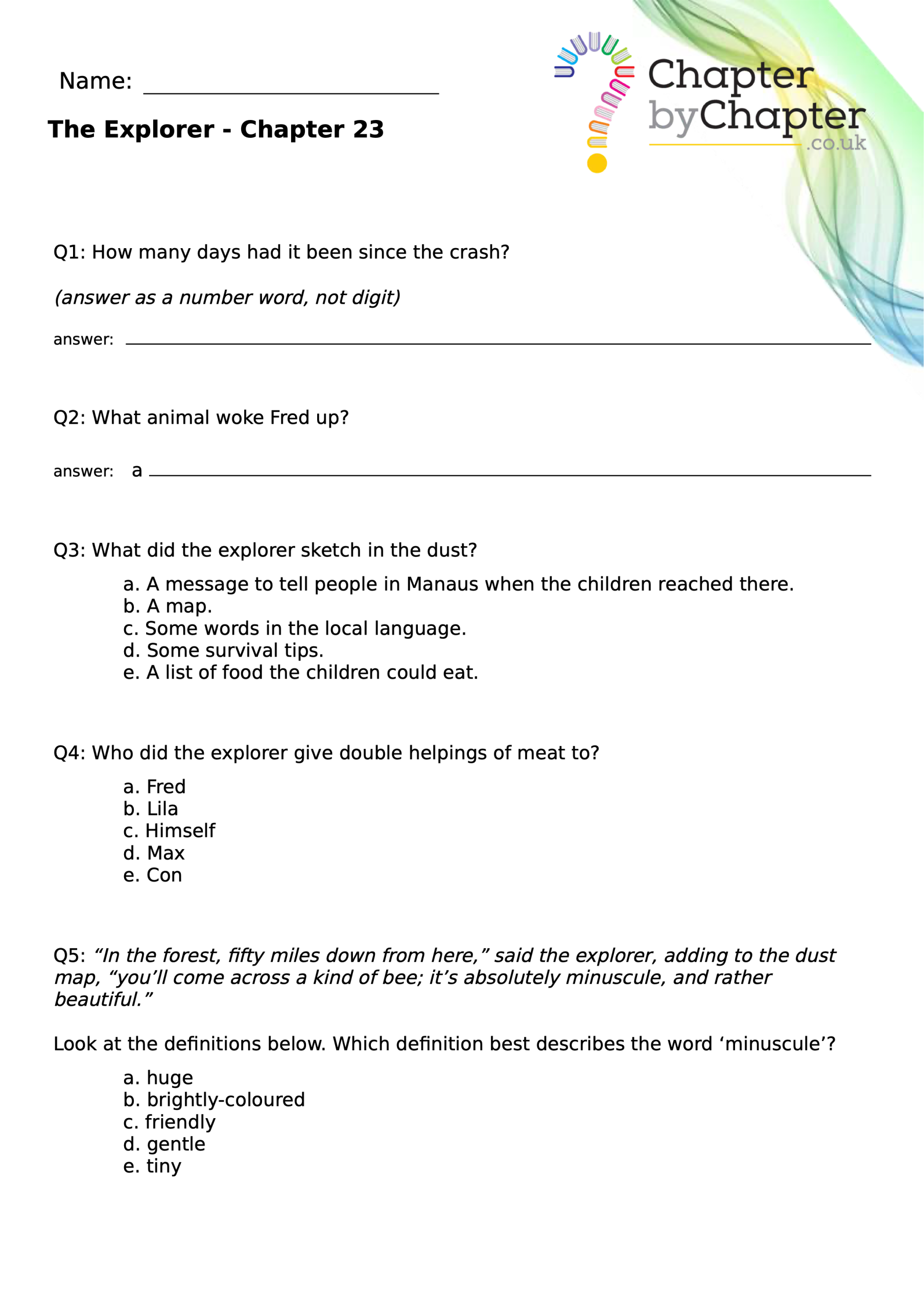 Another chapter comprehension pack, this time linked to Chapter 23 of The Explorer.