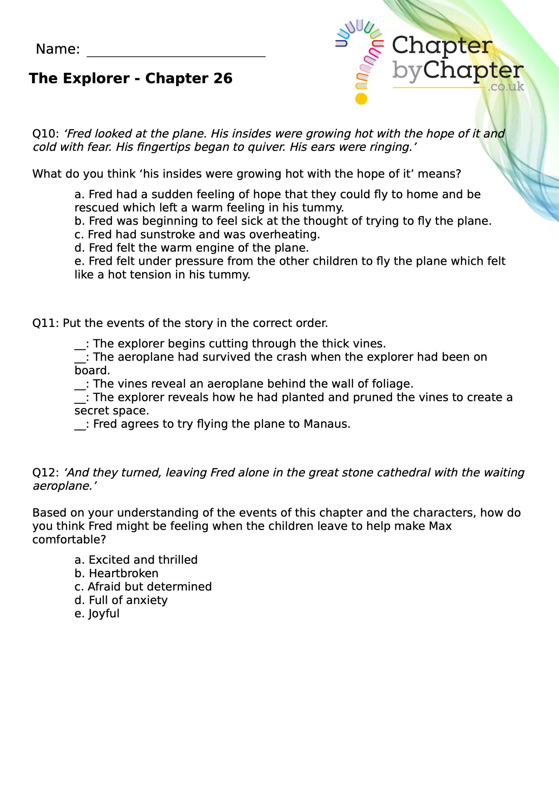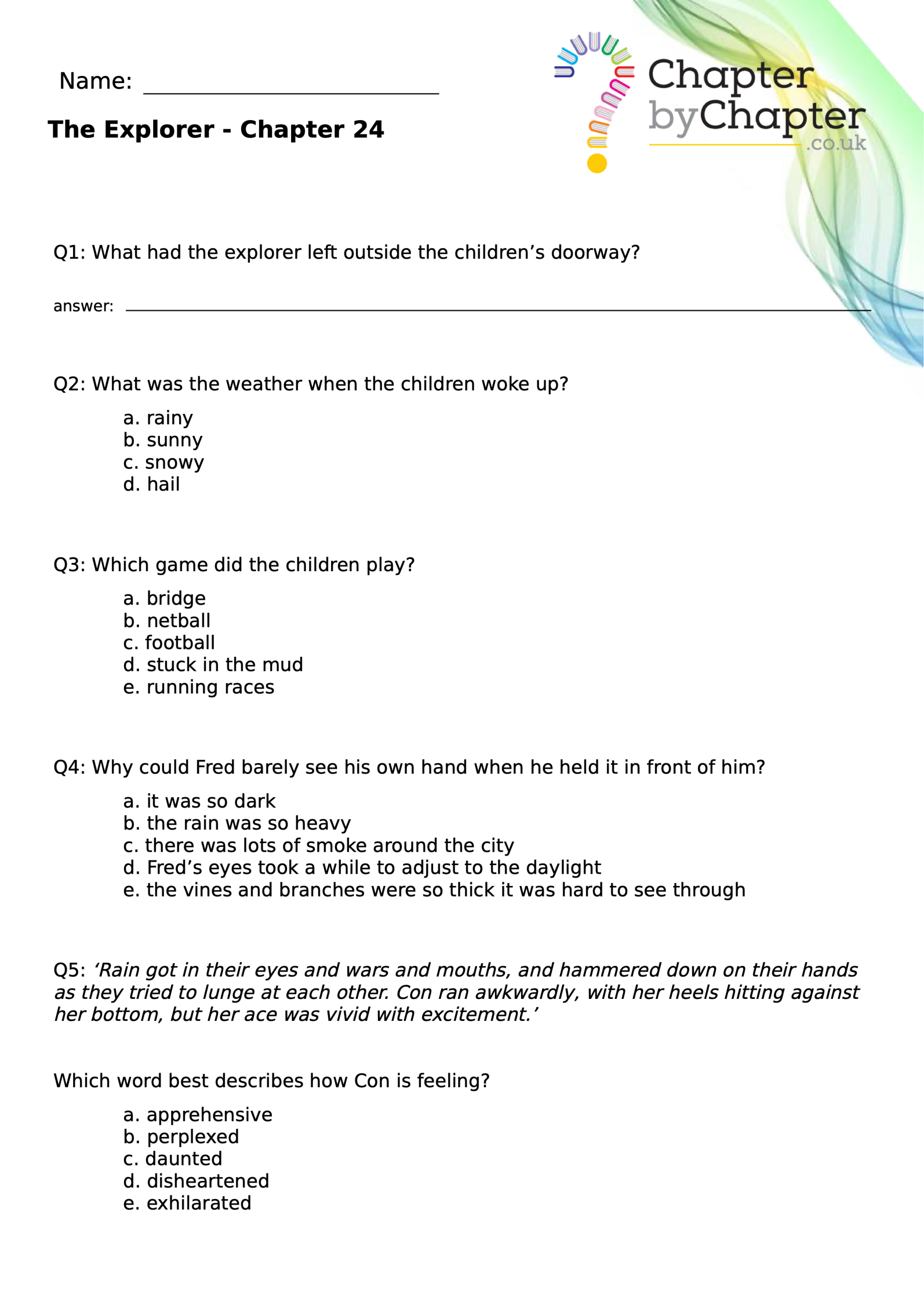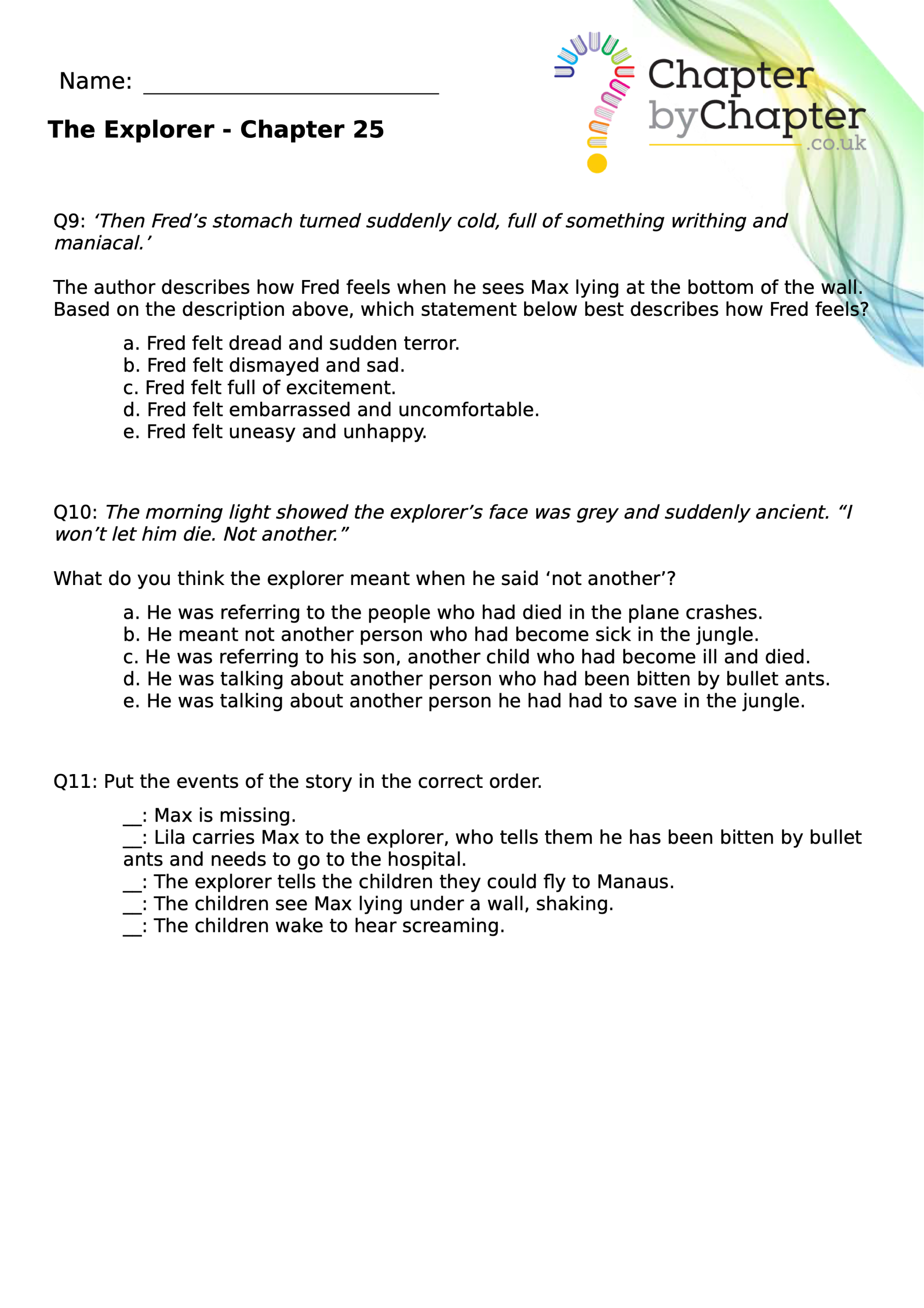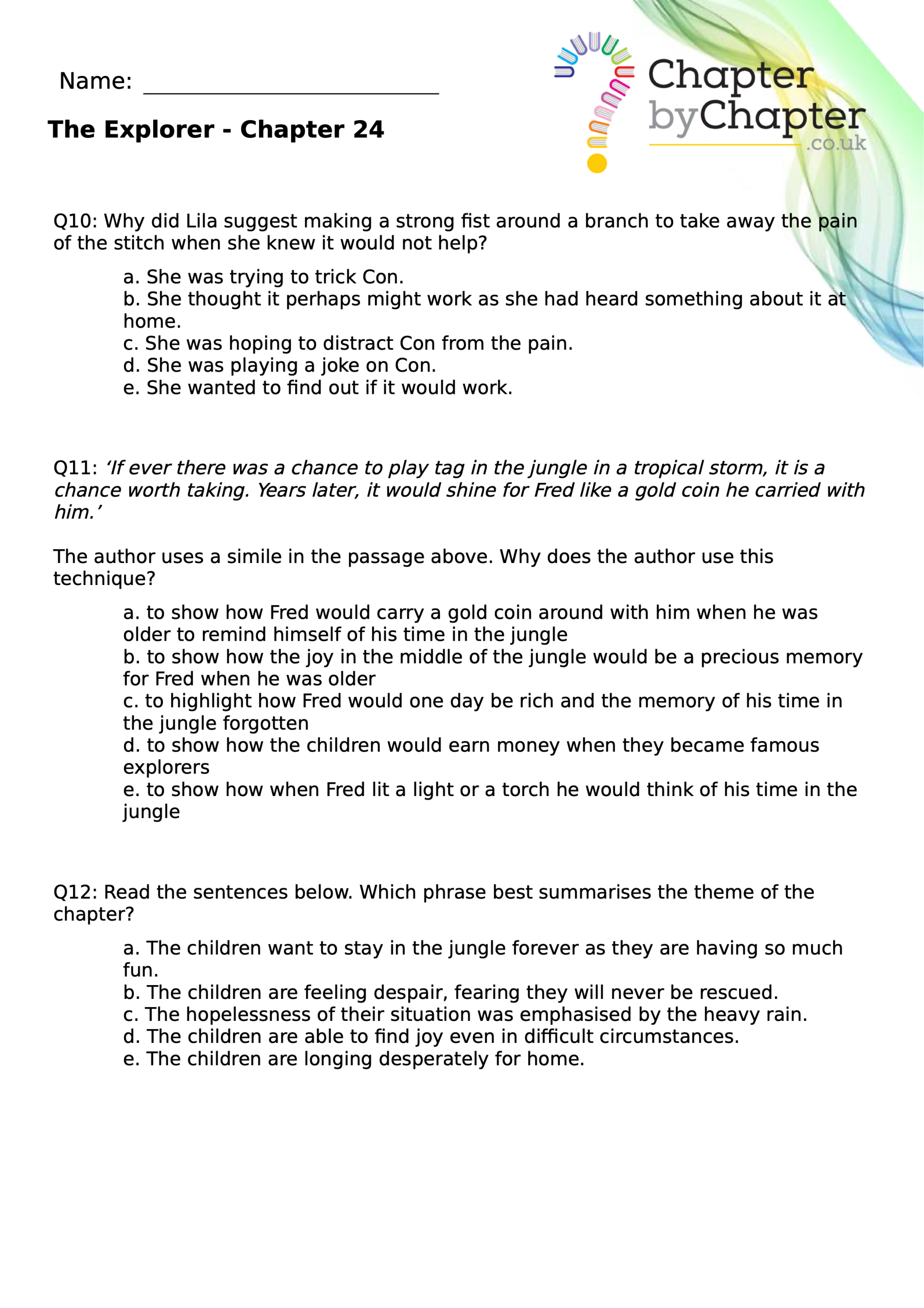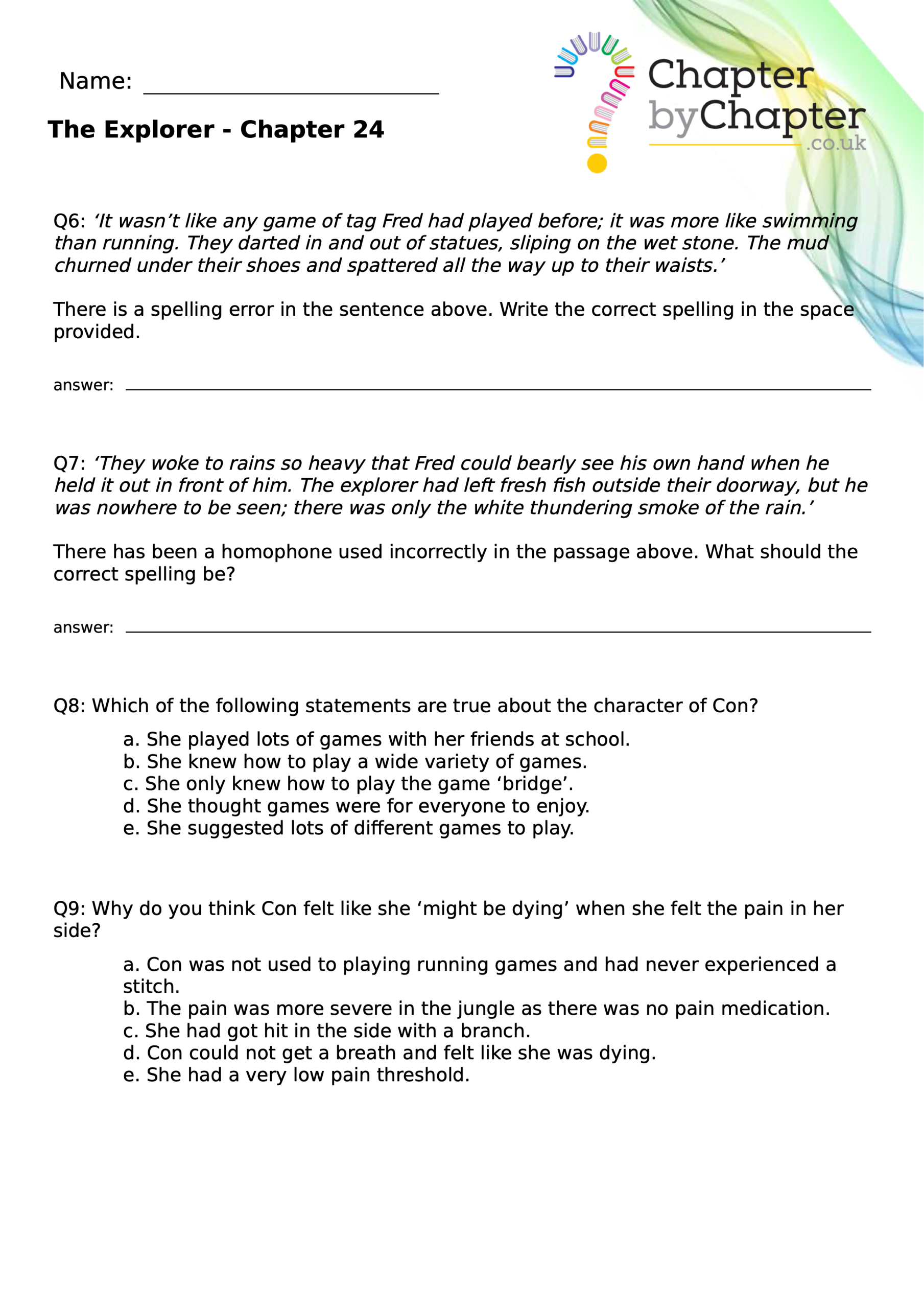 Another chapter comprehension pack, this time linked to Chapter 24 of The Explorer.