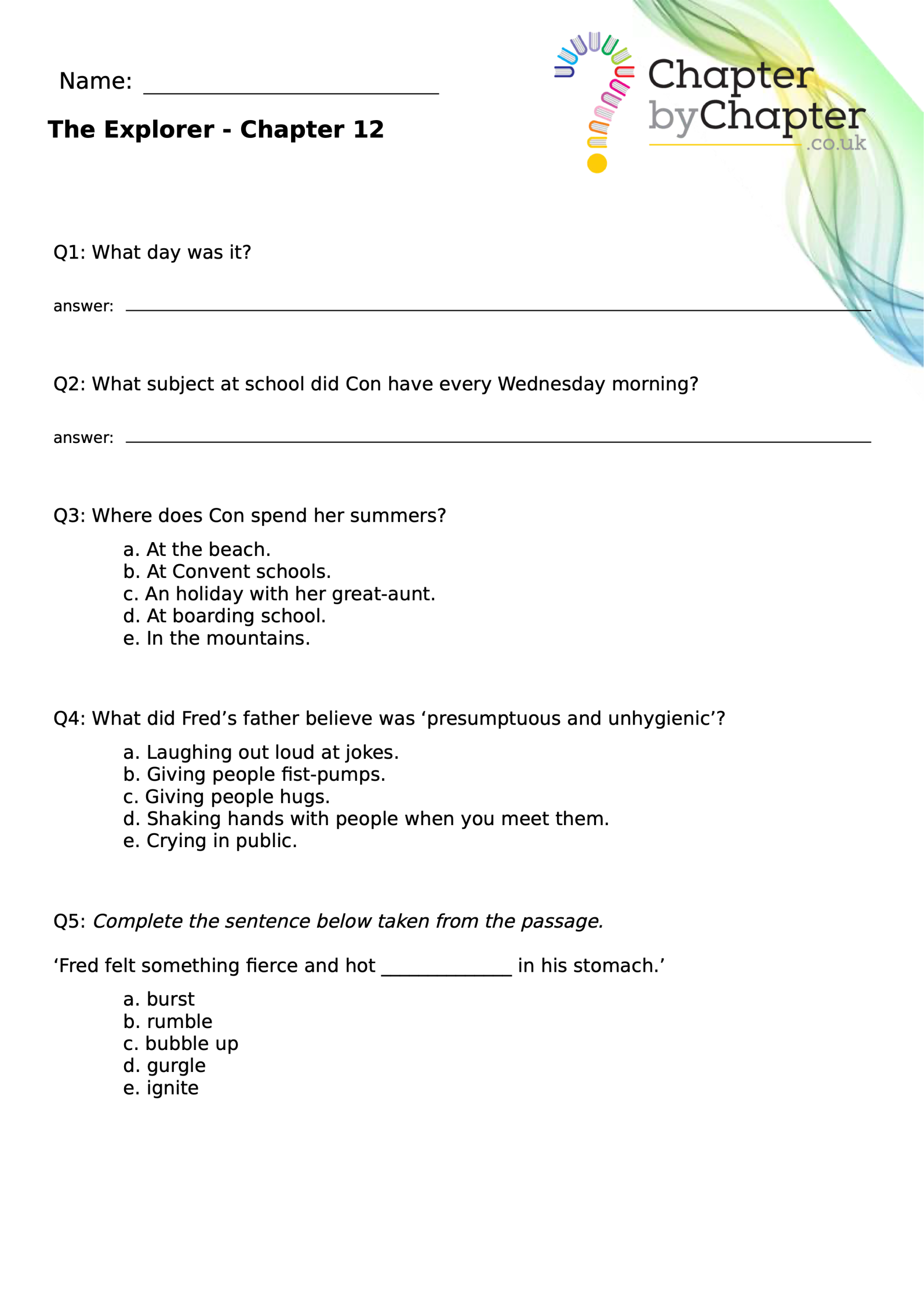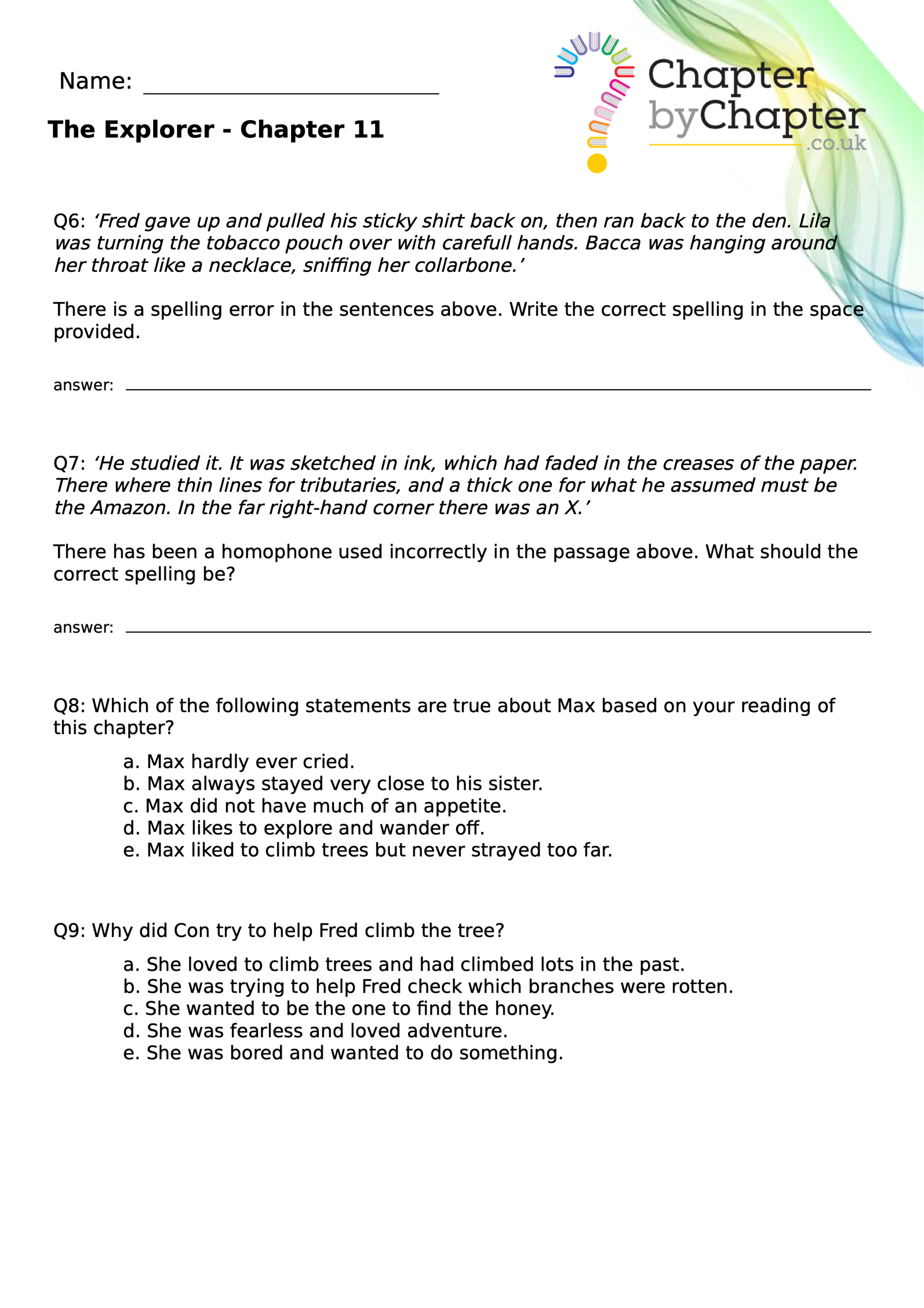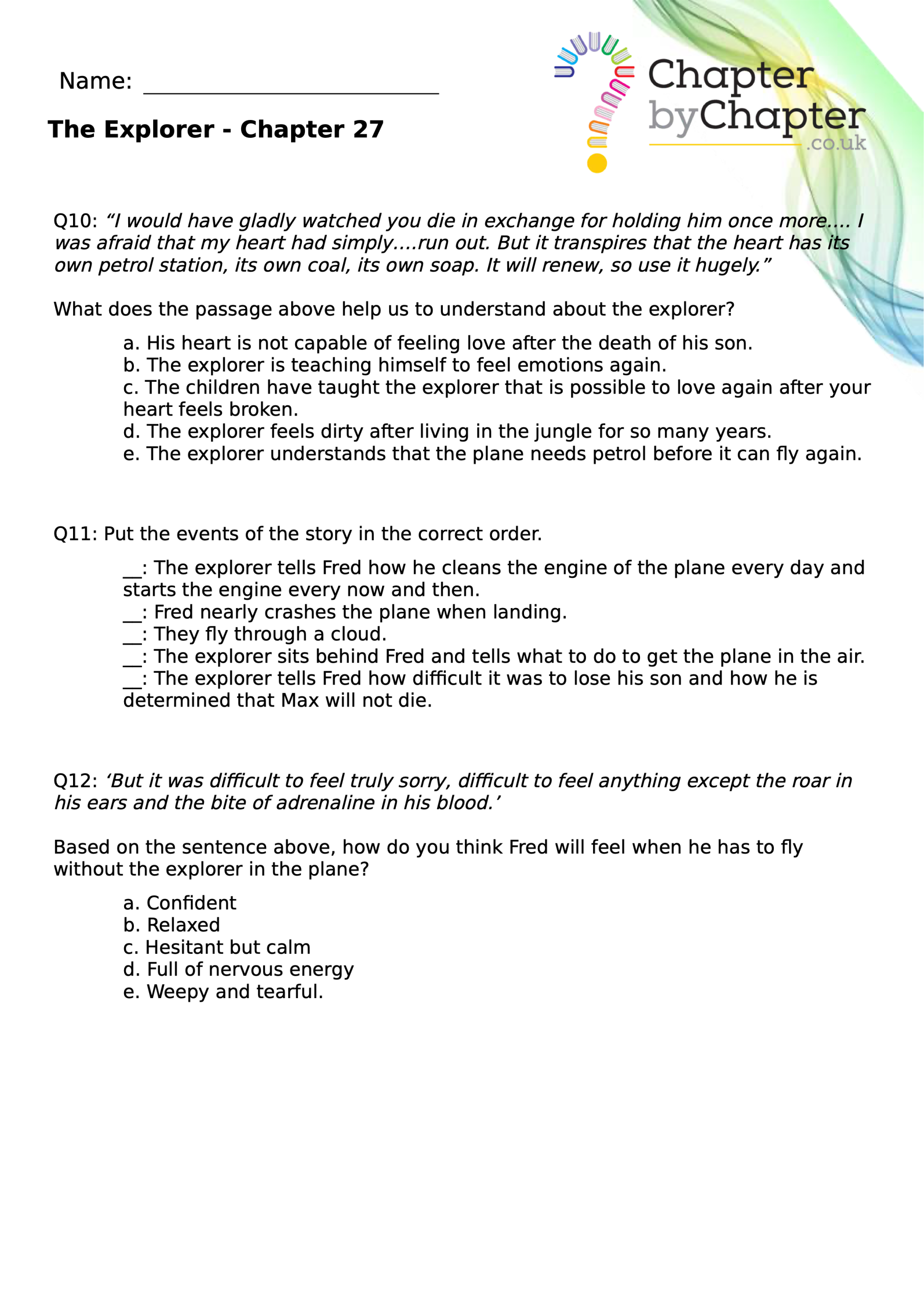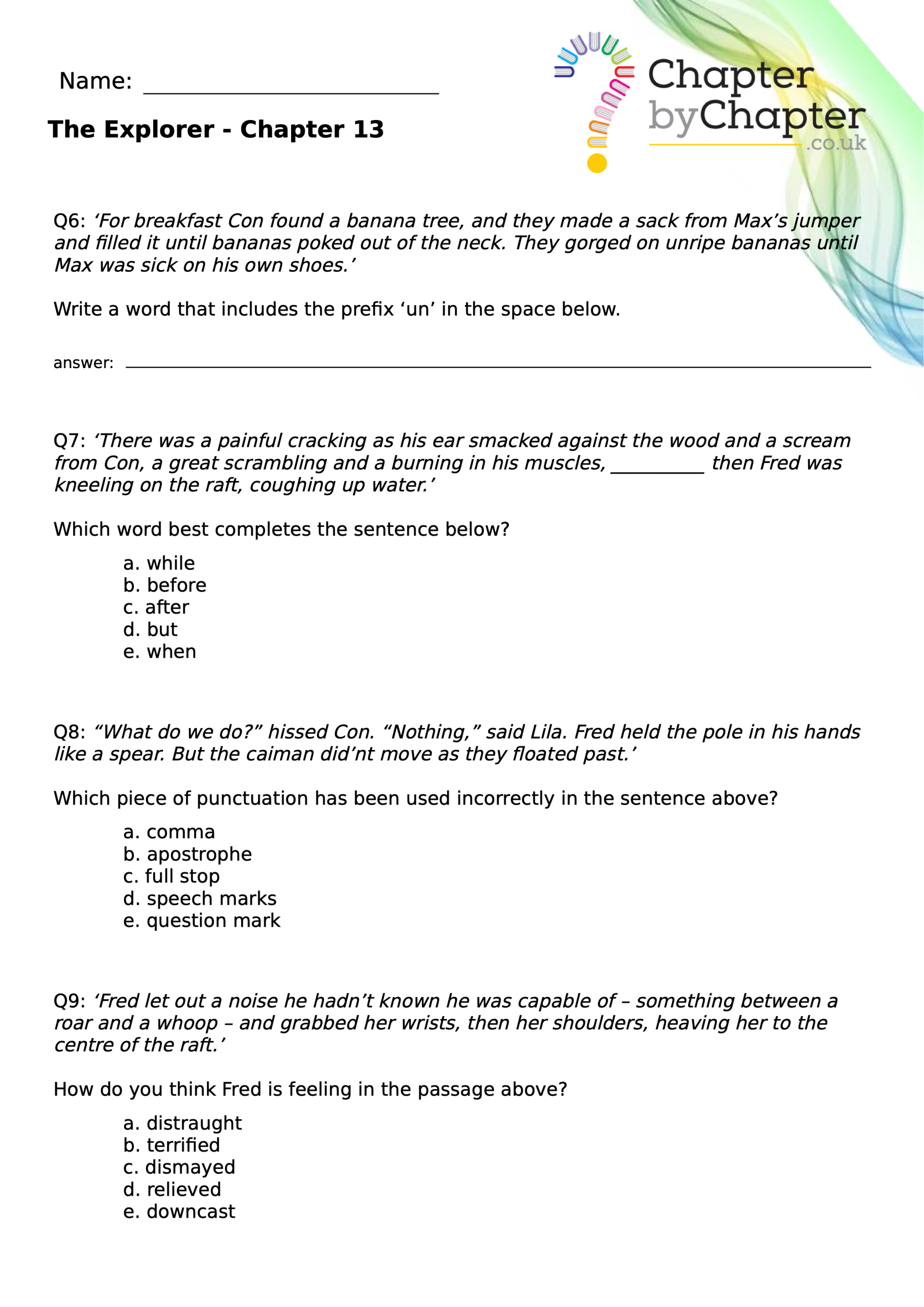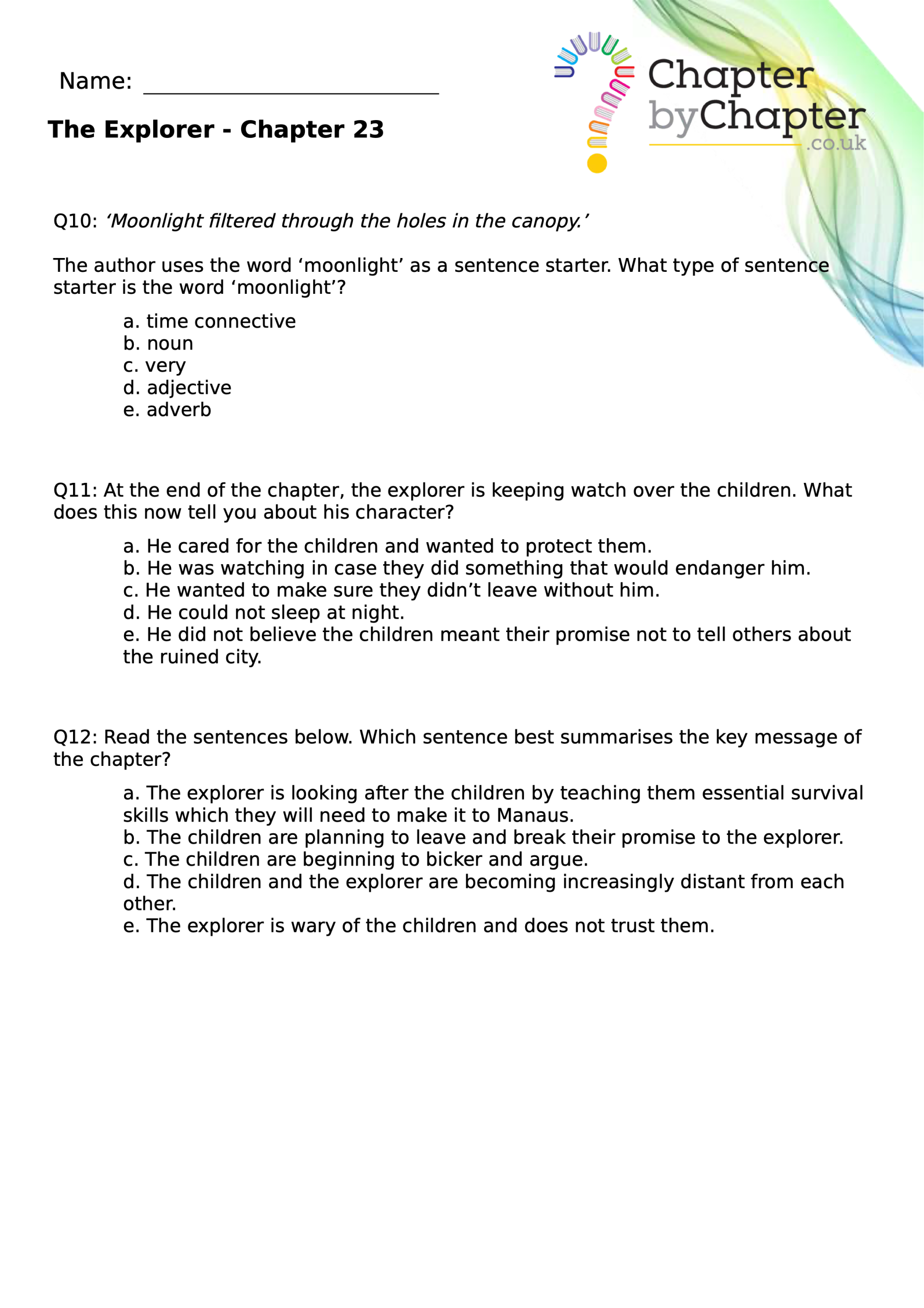 This covers Chapter 12 of The Explorer and the questions have been created by a teacher, not AI, specifically to challenge Year 5 and Year 6 children.