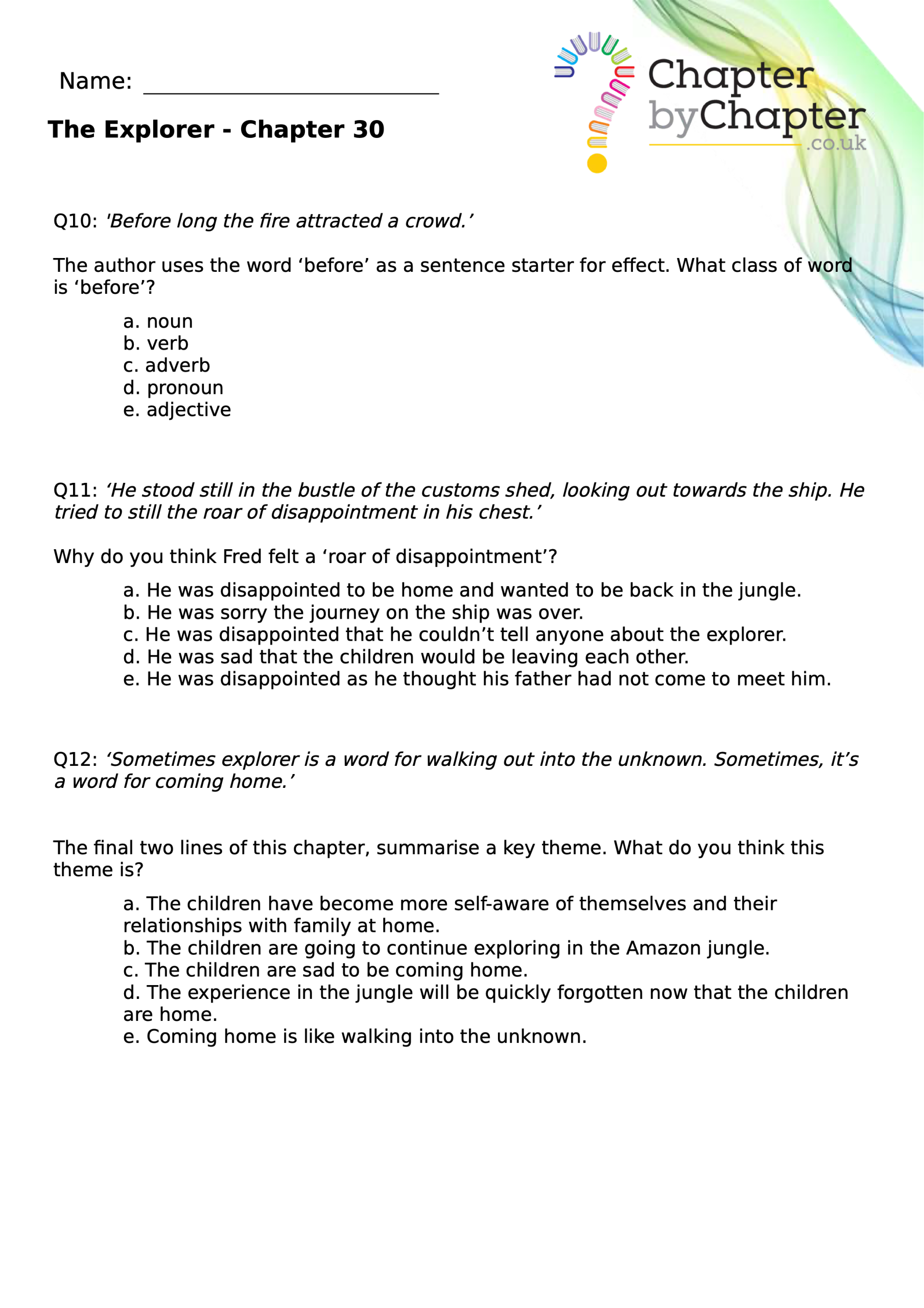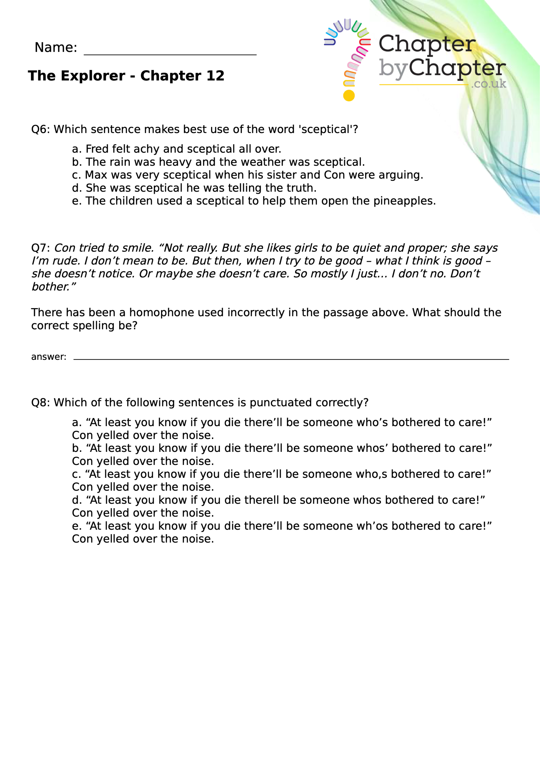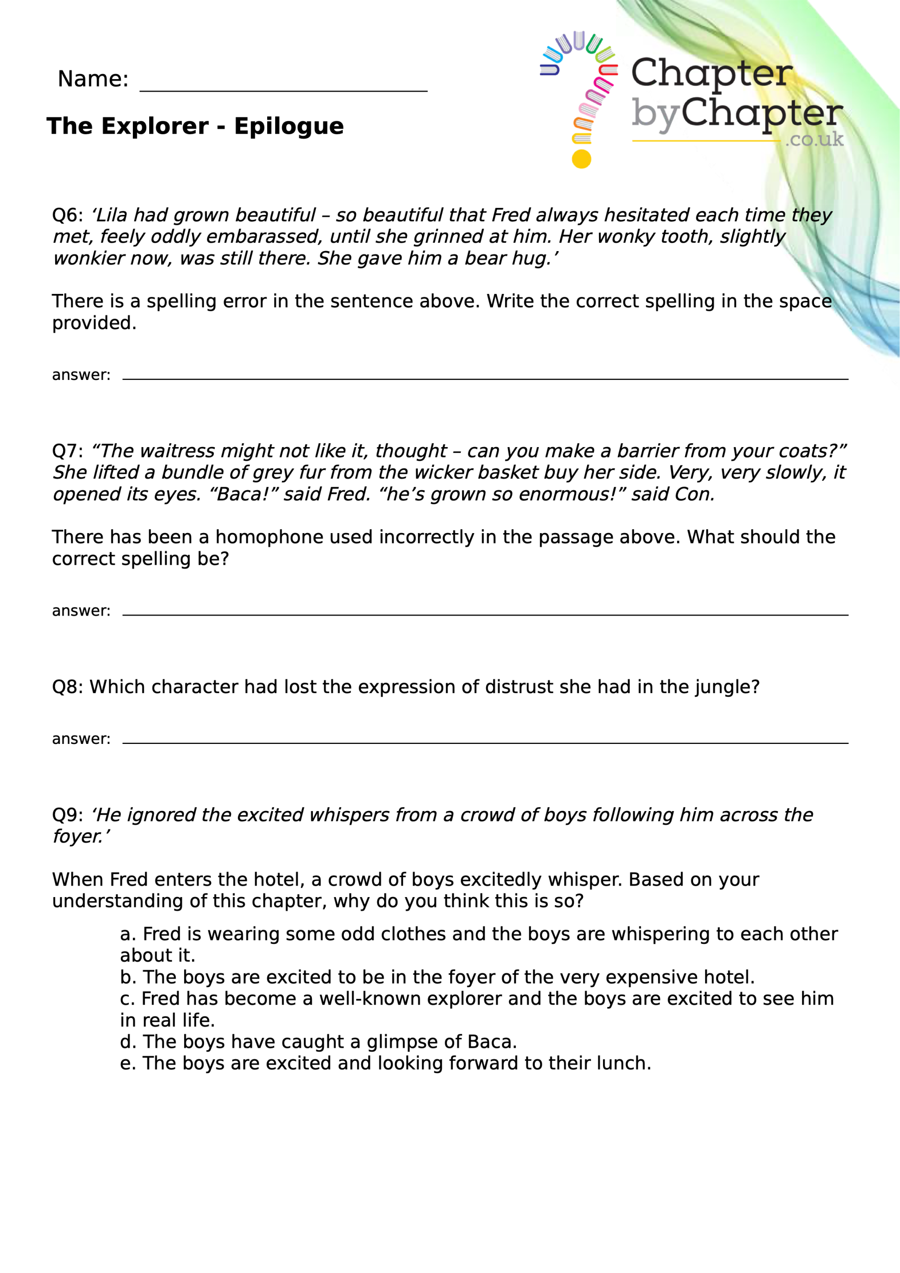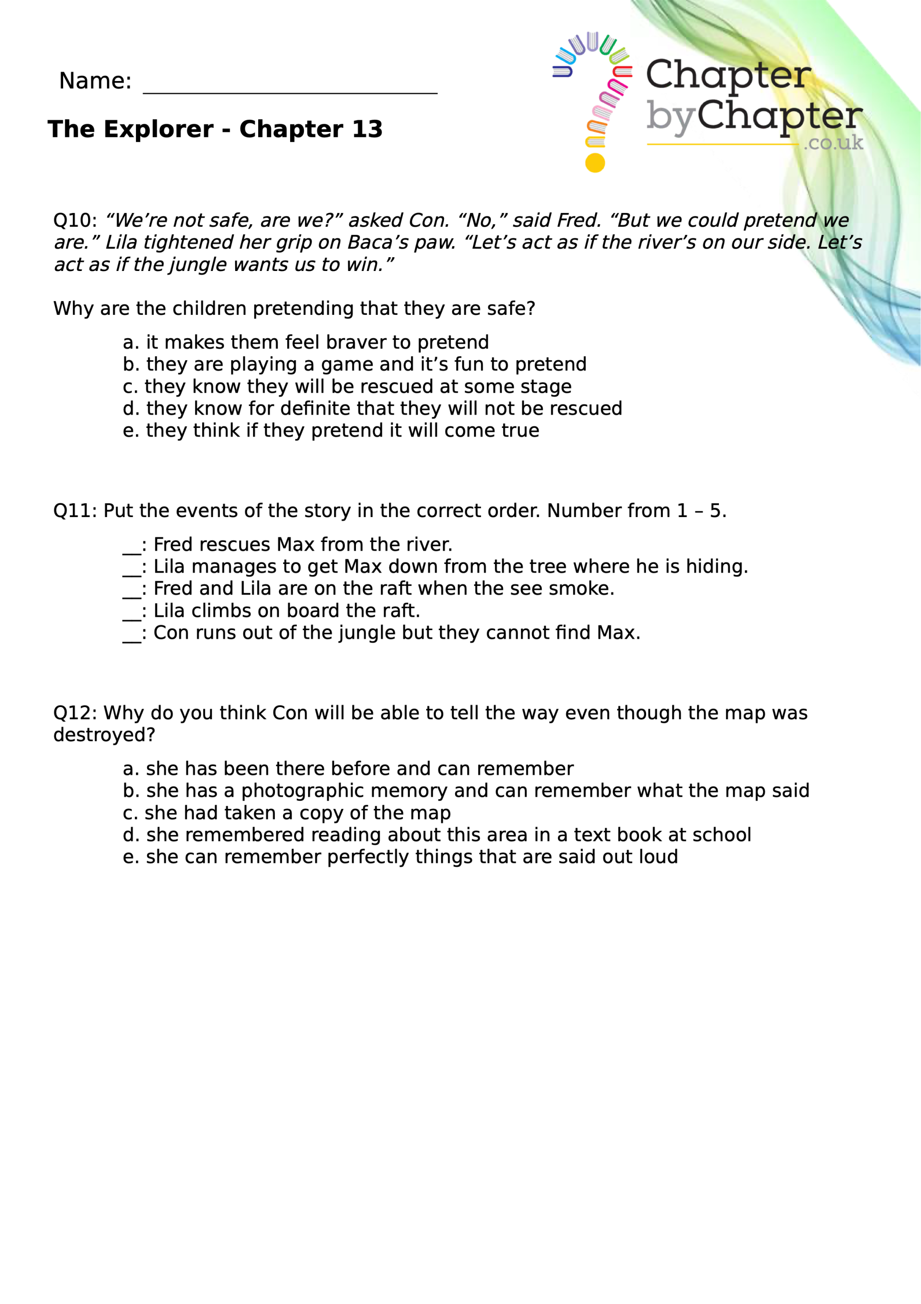 This covers Chapter 12 of The Explorer and the questions have been created by a teacher, not AI, specifically to challenge Year 5 and Year 6 children.