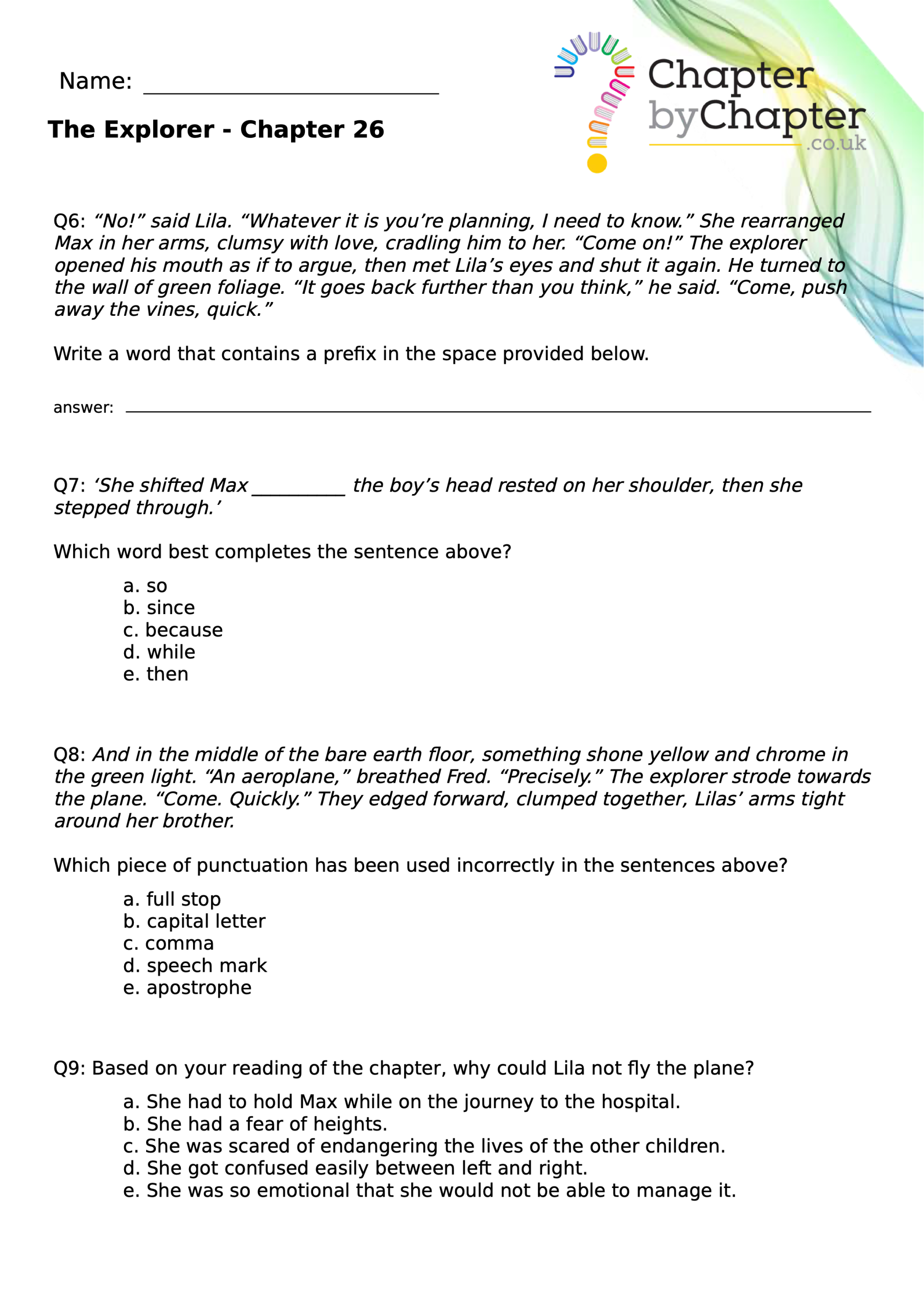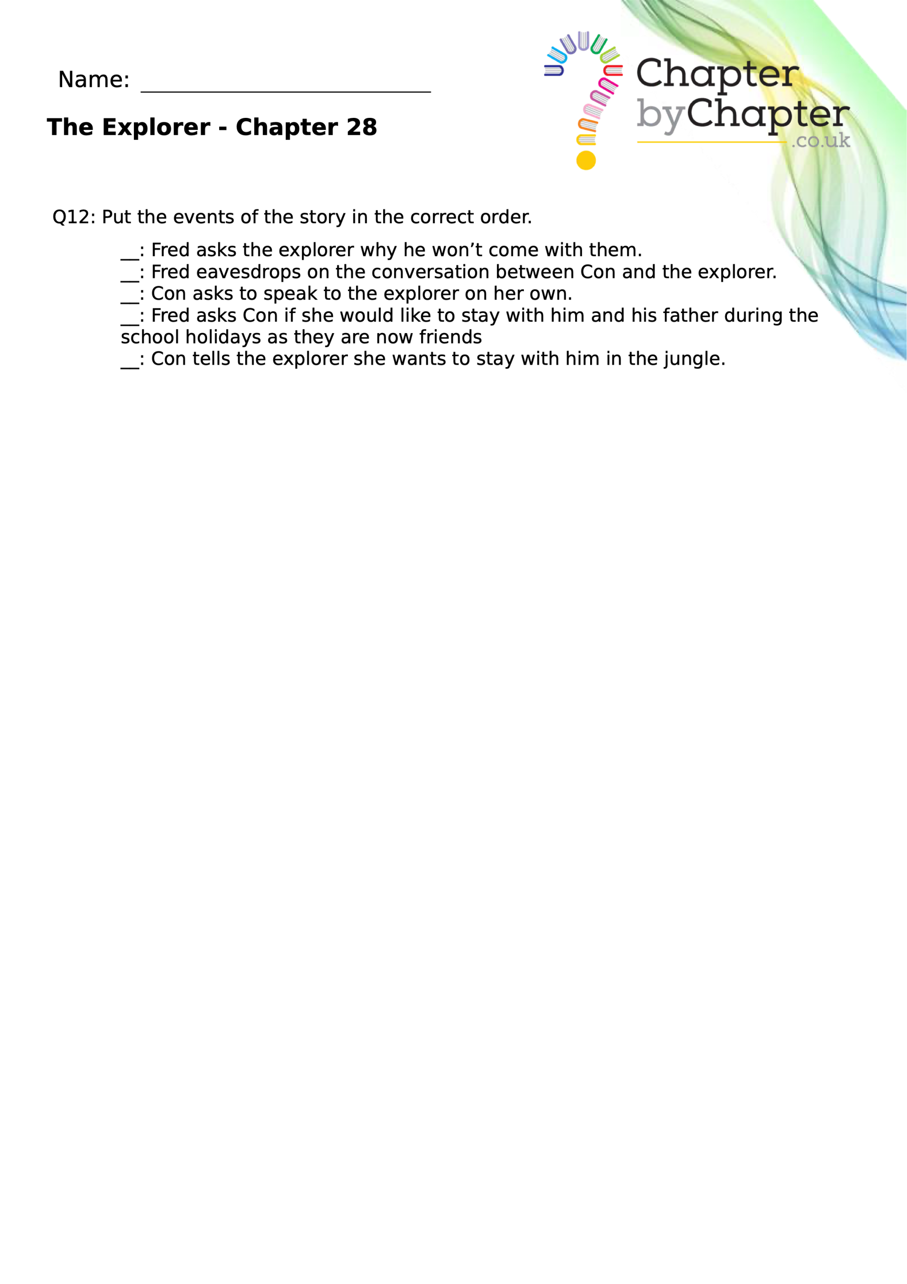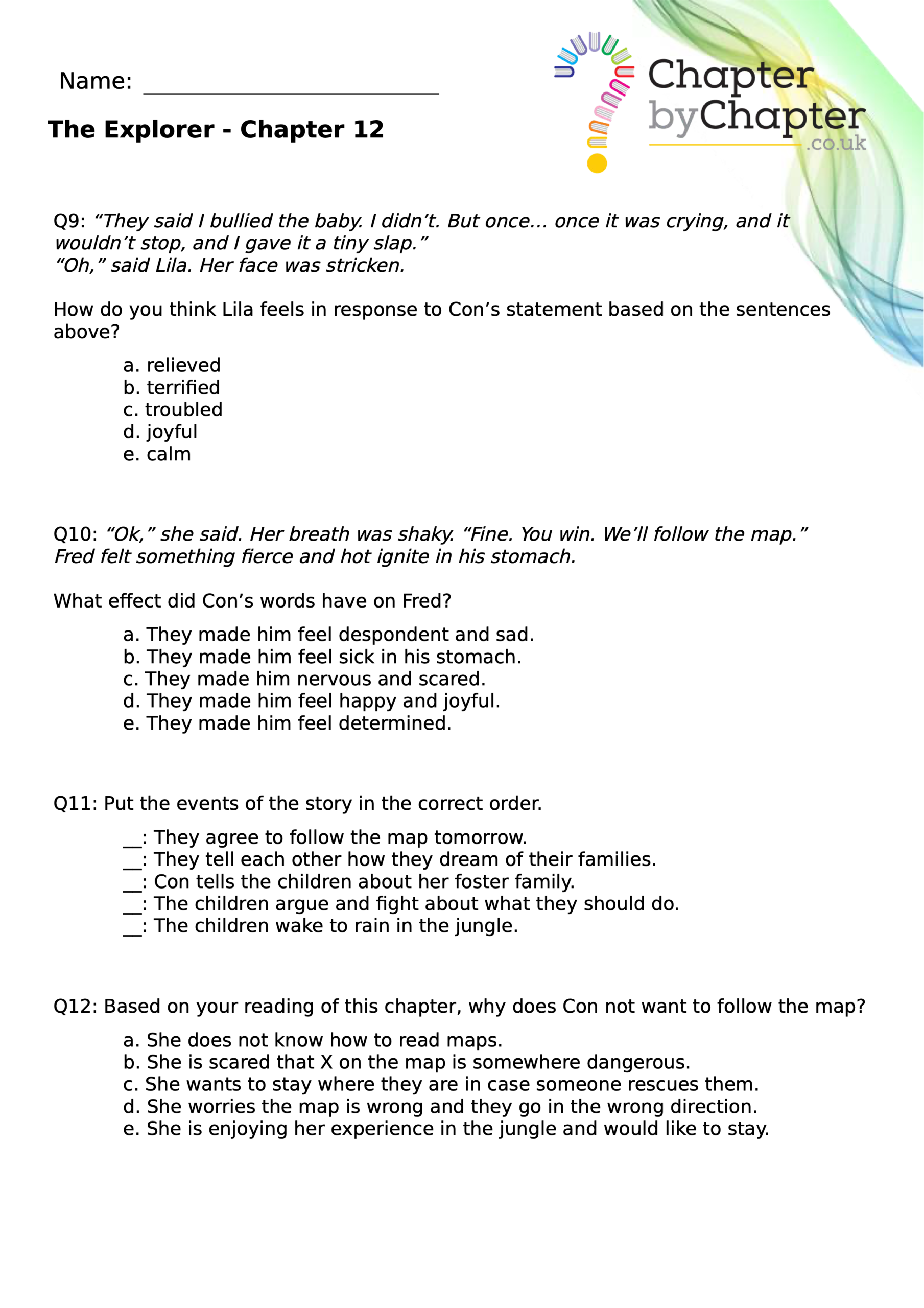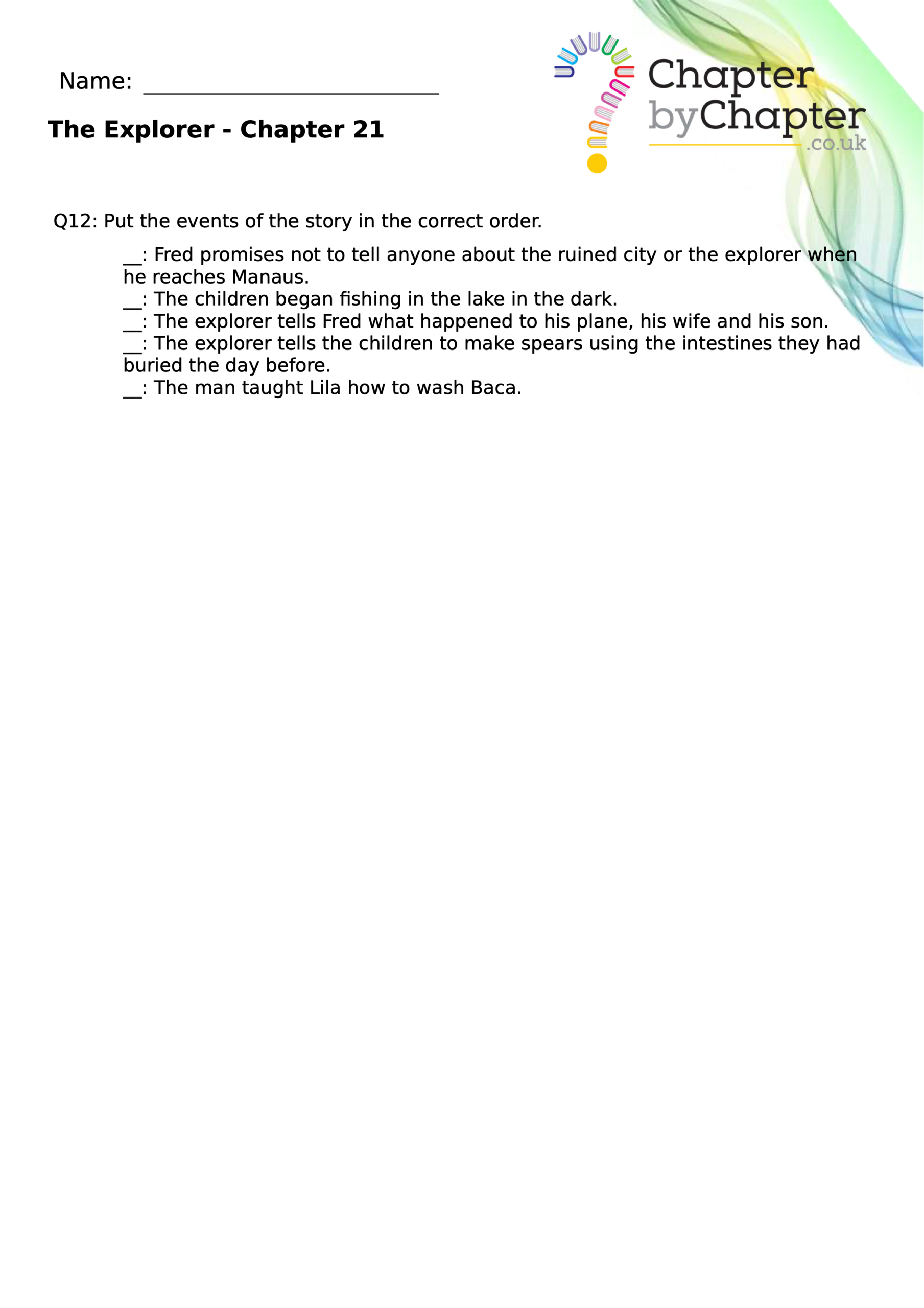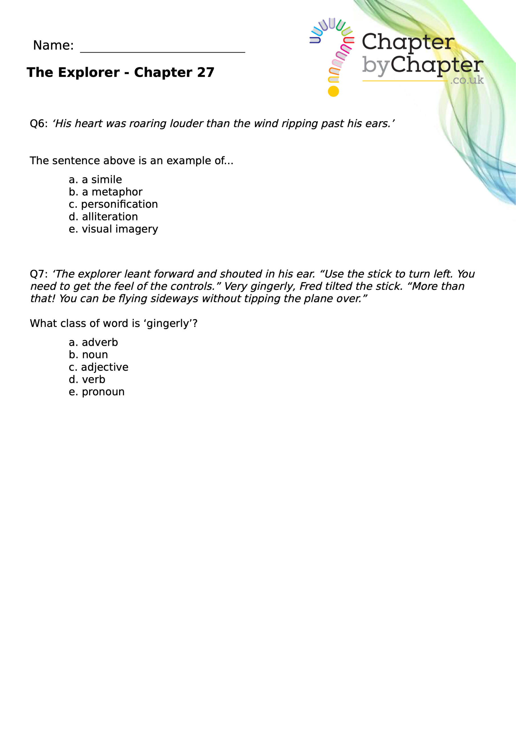 This covers Chapter 12 of The Explorer and the questions have been created by a teacher, not AI, specifically to challenge Year 5 and Year 6 children.