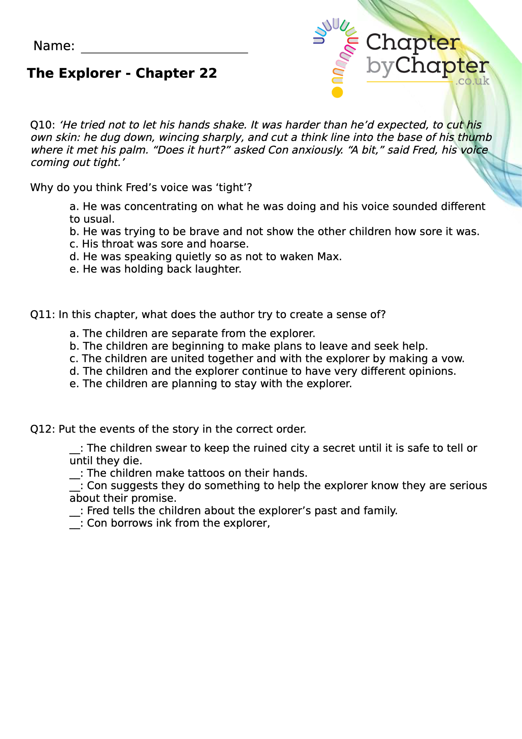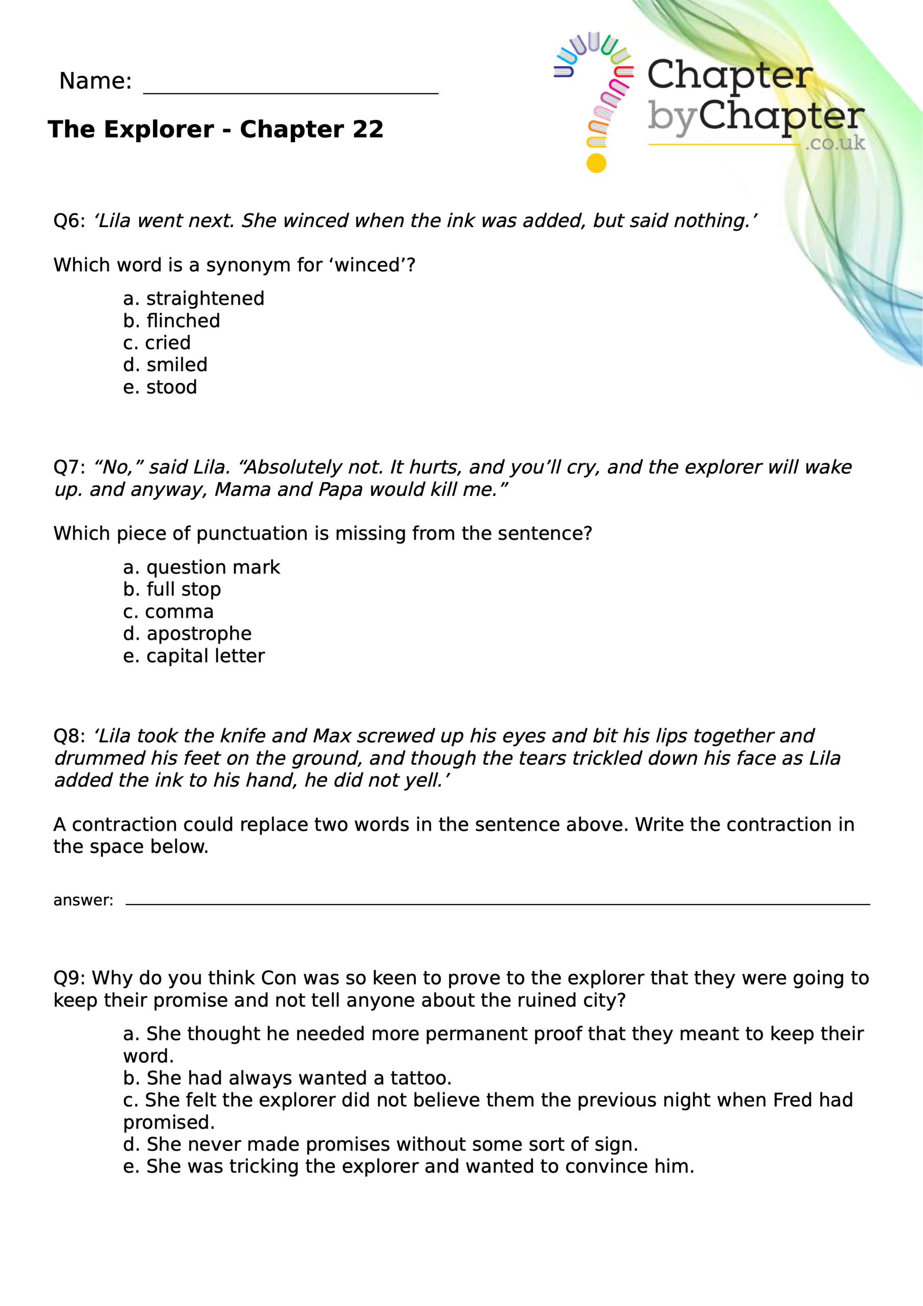 Another chapter comprehension pack, this time linked to Chapter 22 of The Explorer.