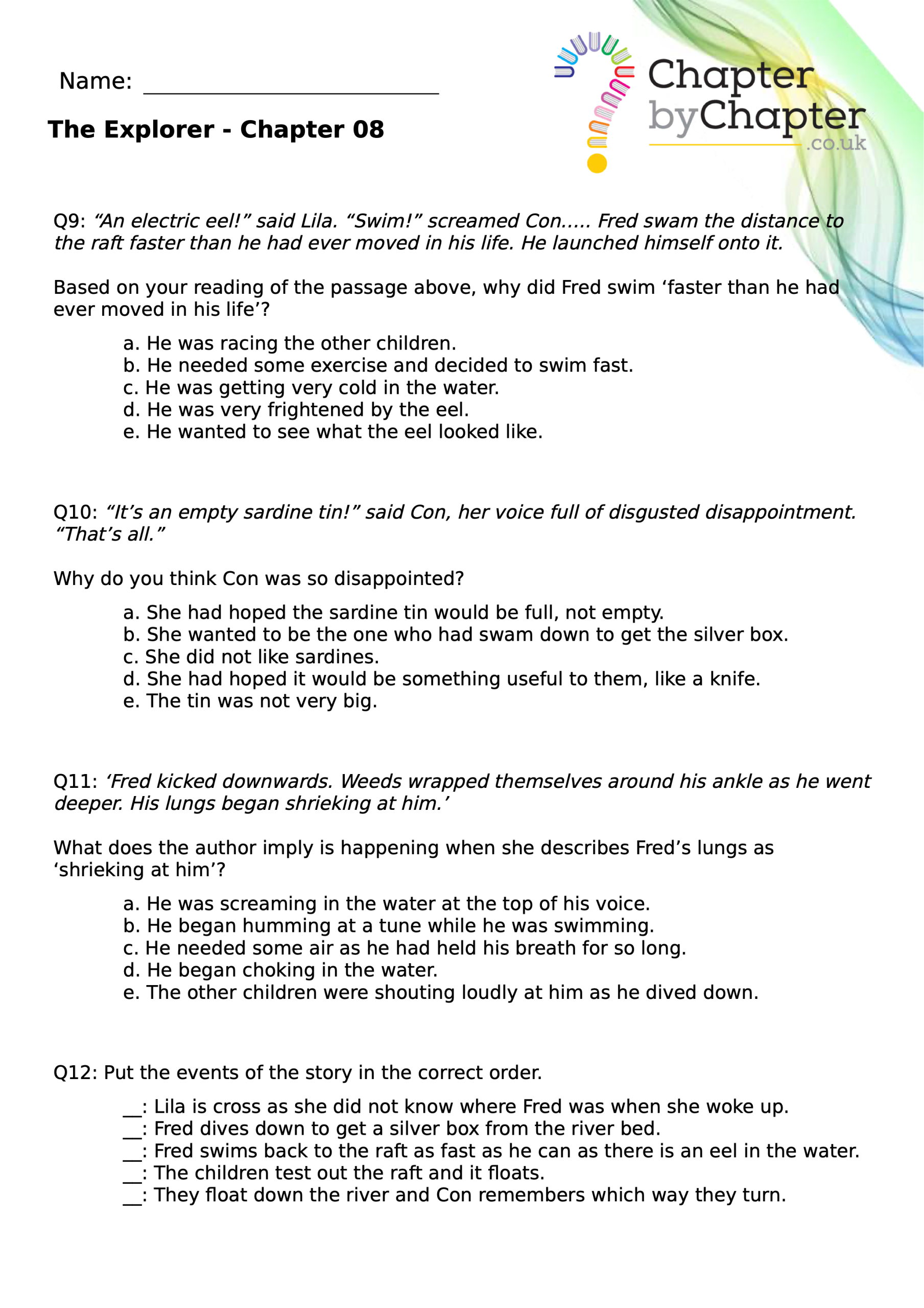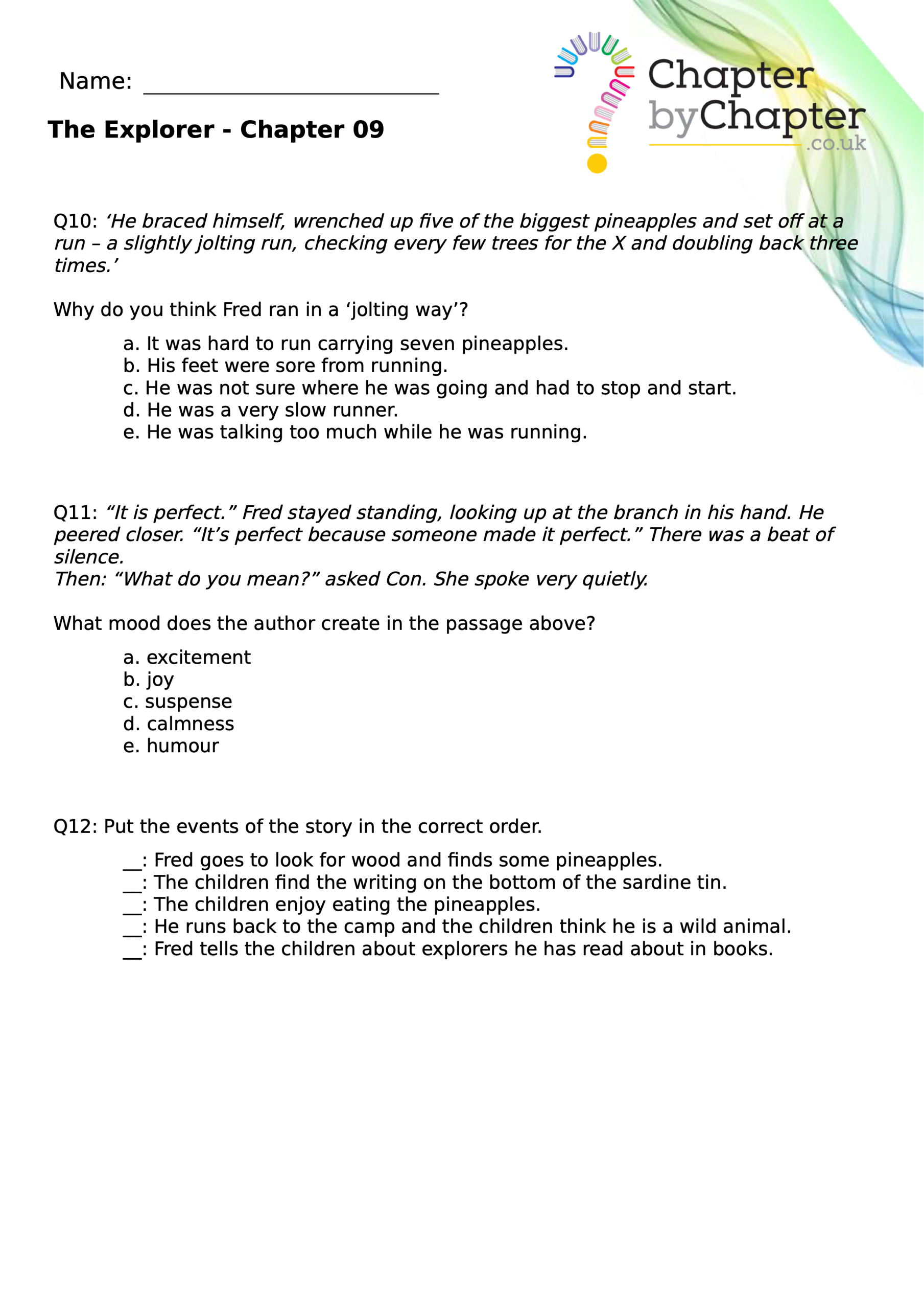 Questions 9-12 focus on all content within the chapter and also touch on areas such as summarising, authorial technique, sequencing the events, predictions and more challenging literacy concepts to challenge all children.